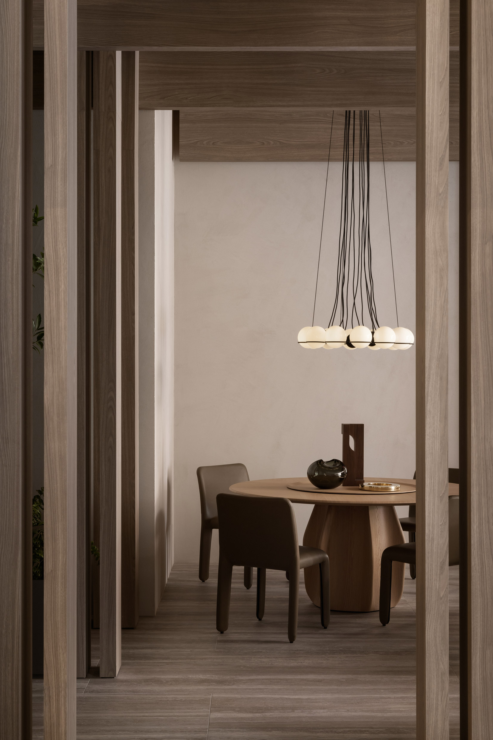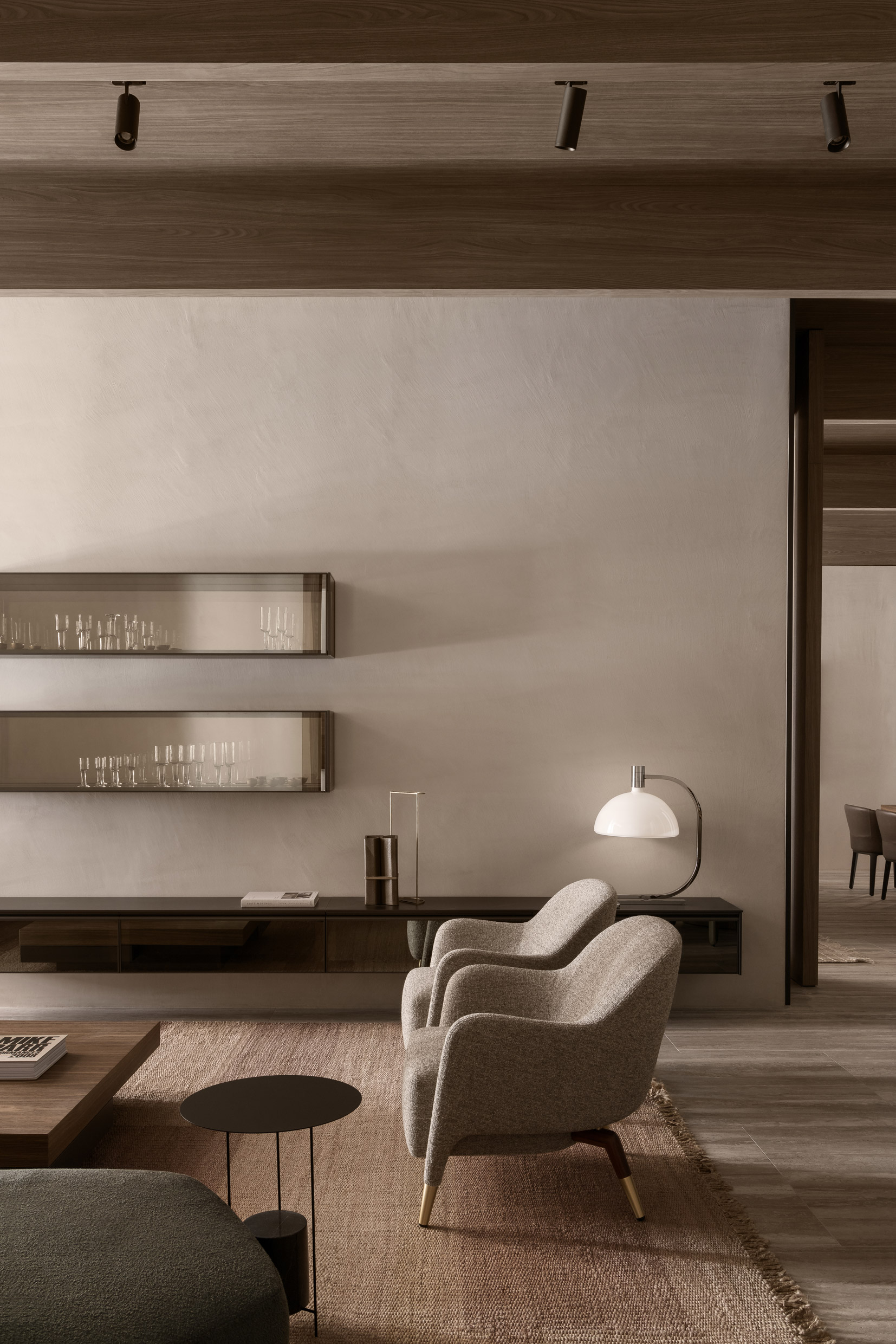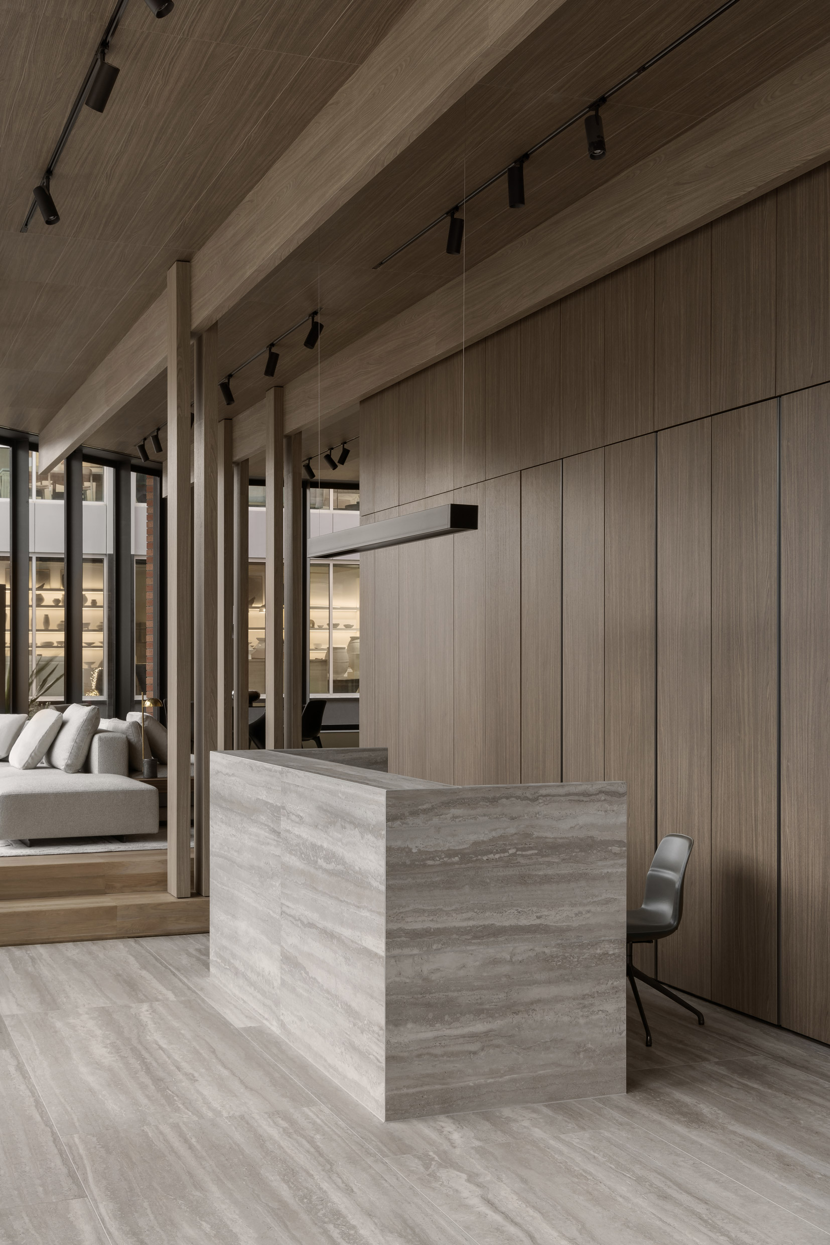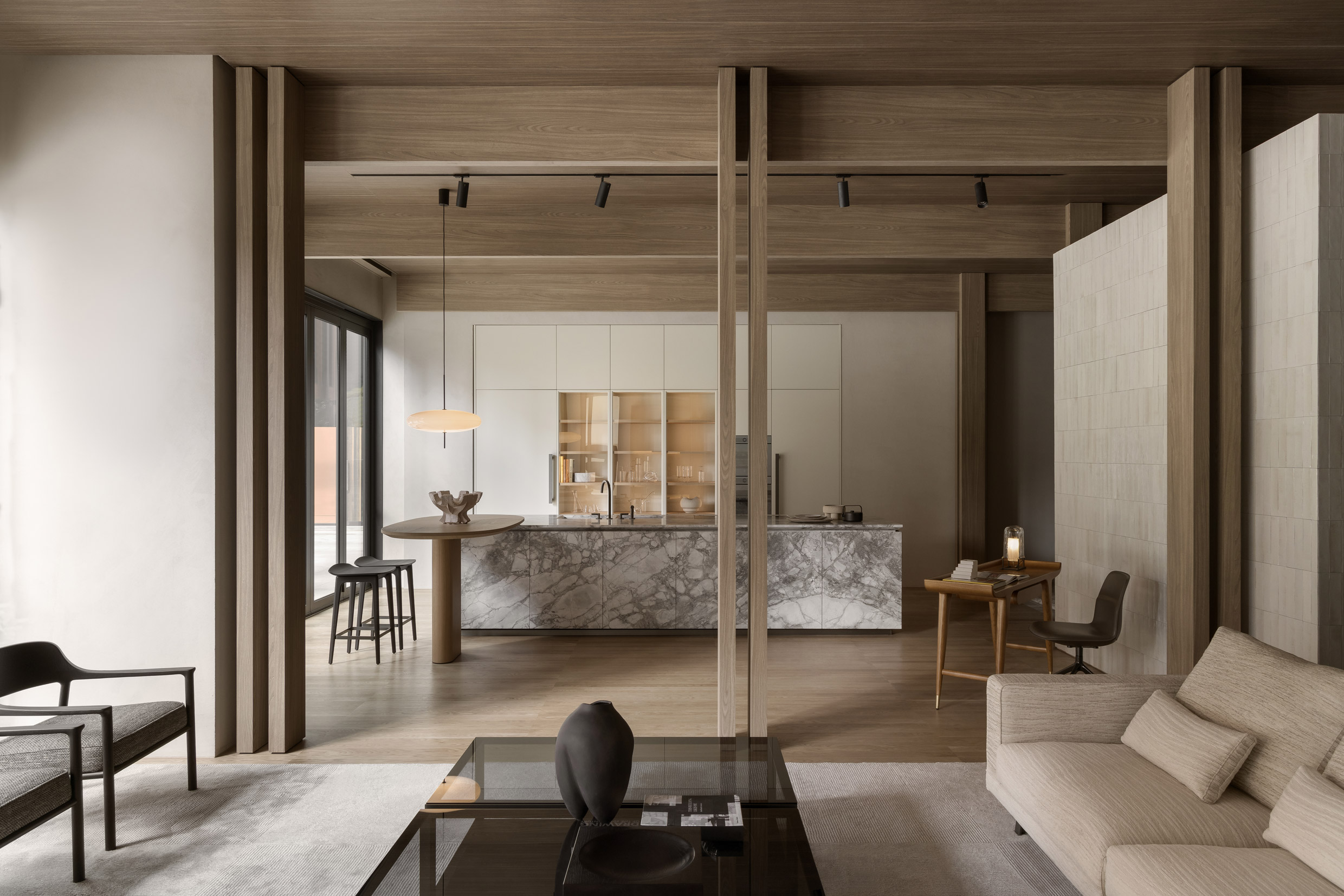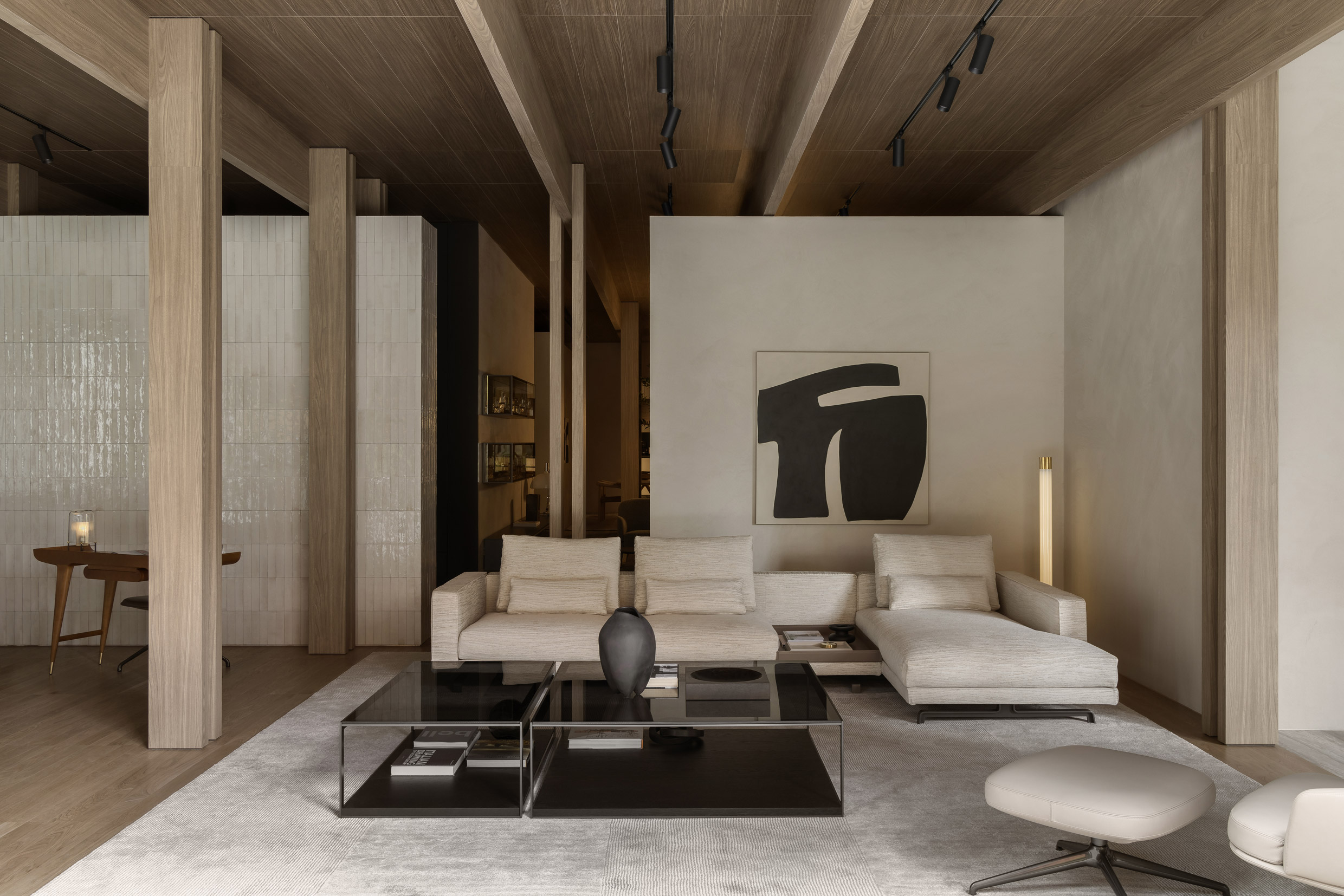 Natural materials such as Travertine and Sunrise Oak embellish the space, creating a warm and inviting ambiance. The harmonious blend of design and architectural elements reflects the Molteni&C philosophy rooted in fluidity and comfort, where furniture seamlessly integrates with existing structures, thereby enhancing the space.