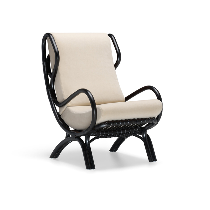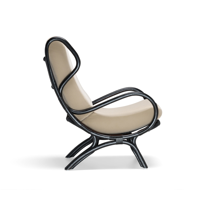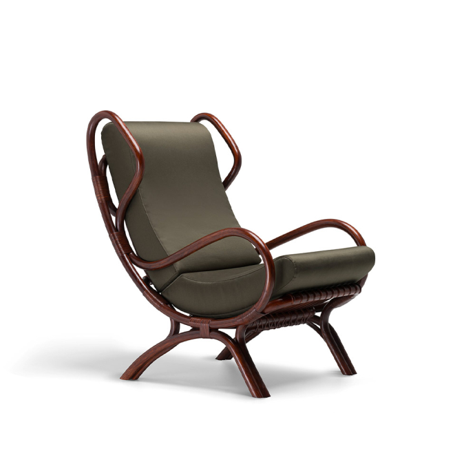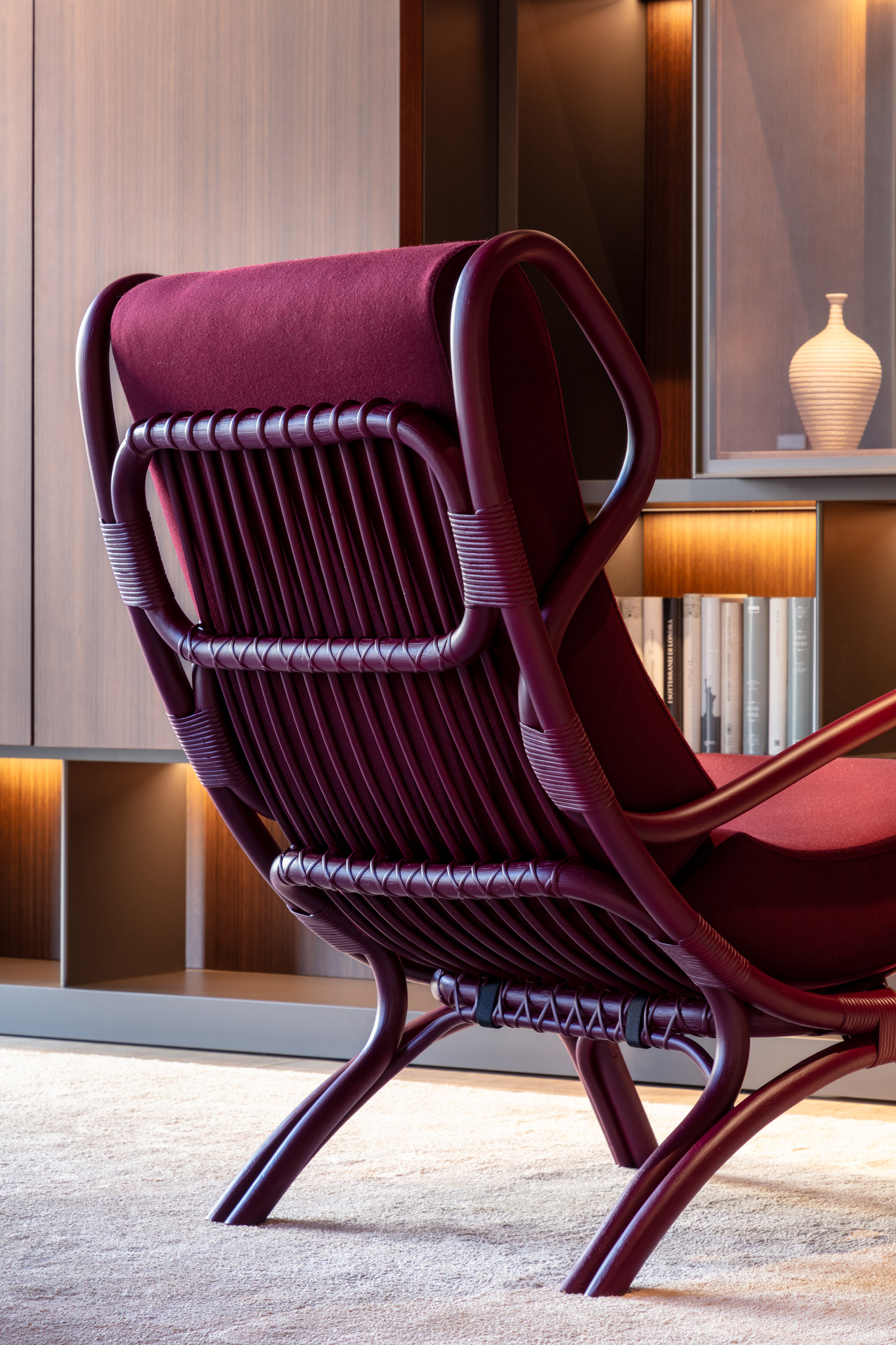 The design of the Continuum armchair aims to materialize a continuous and sinuous brushstroke, inspired by organic forms, elegantly realized through the uninterrupted line flowing from headrest to armrest. The Continuum draws further inspiration from bergères designed in the early 1950s for hotels and cruise ships. Crafted entirely in Italy, the armchair utilizes first-class materials from the rattan family: manao and malacca sourced from the equatorial forests of Indonesia. The structure and backrest are shaped from manao cane by skilled artisans, and each piece demands over 200 hours of meticulous craftsmanship. The seat, crafted from canes with a smaller diameter, is affixed to the structure using special flat rattan cane.