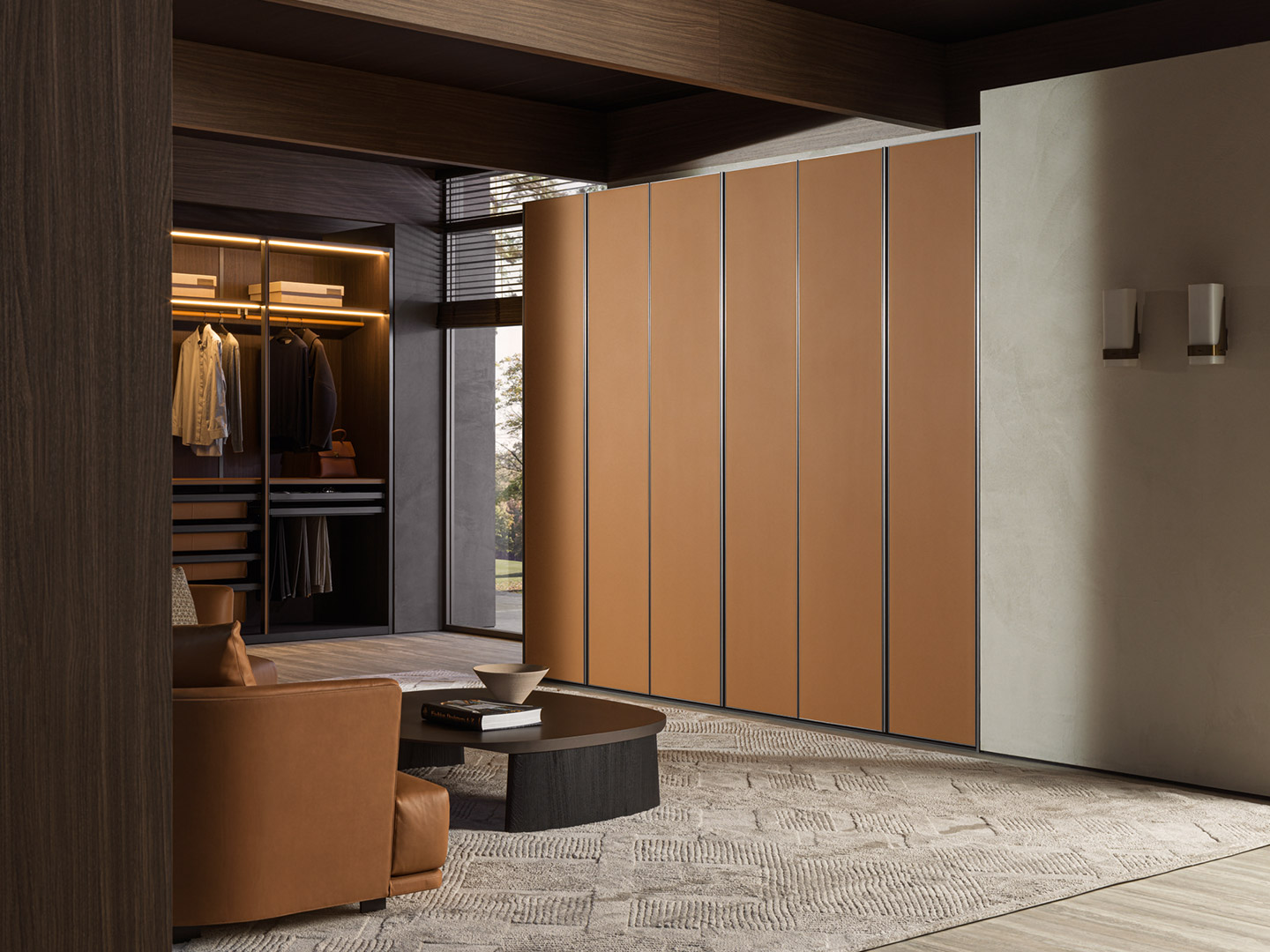 The GlissMaster wardrobe and walk-in wardrobe system, a must for keeping clothes and accessories in perfect order and within easy reach. Smooth in ecoskin, and it widens its offering with a new internal accessory system.