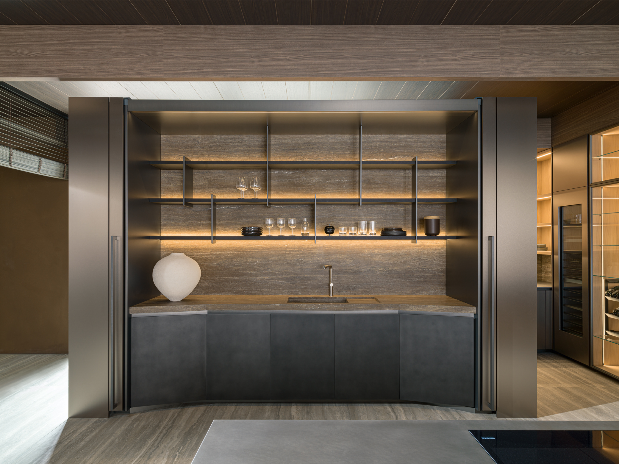 The concept behind the design was to have a kitchen, within a linear space of between 2.40 and 3 meters, where the scenographic element prevails and the kitchen reaches its highest expression, rather like the performance of an actor on stage. As on all theatrical stages, the curtain conceals the scene, revealed only in the presence of the actors, and thus Tivalì 2.0 by Yabu Pushelberg appears as a large closed kitchen range which at first does not reveal its precious contents.