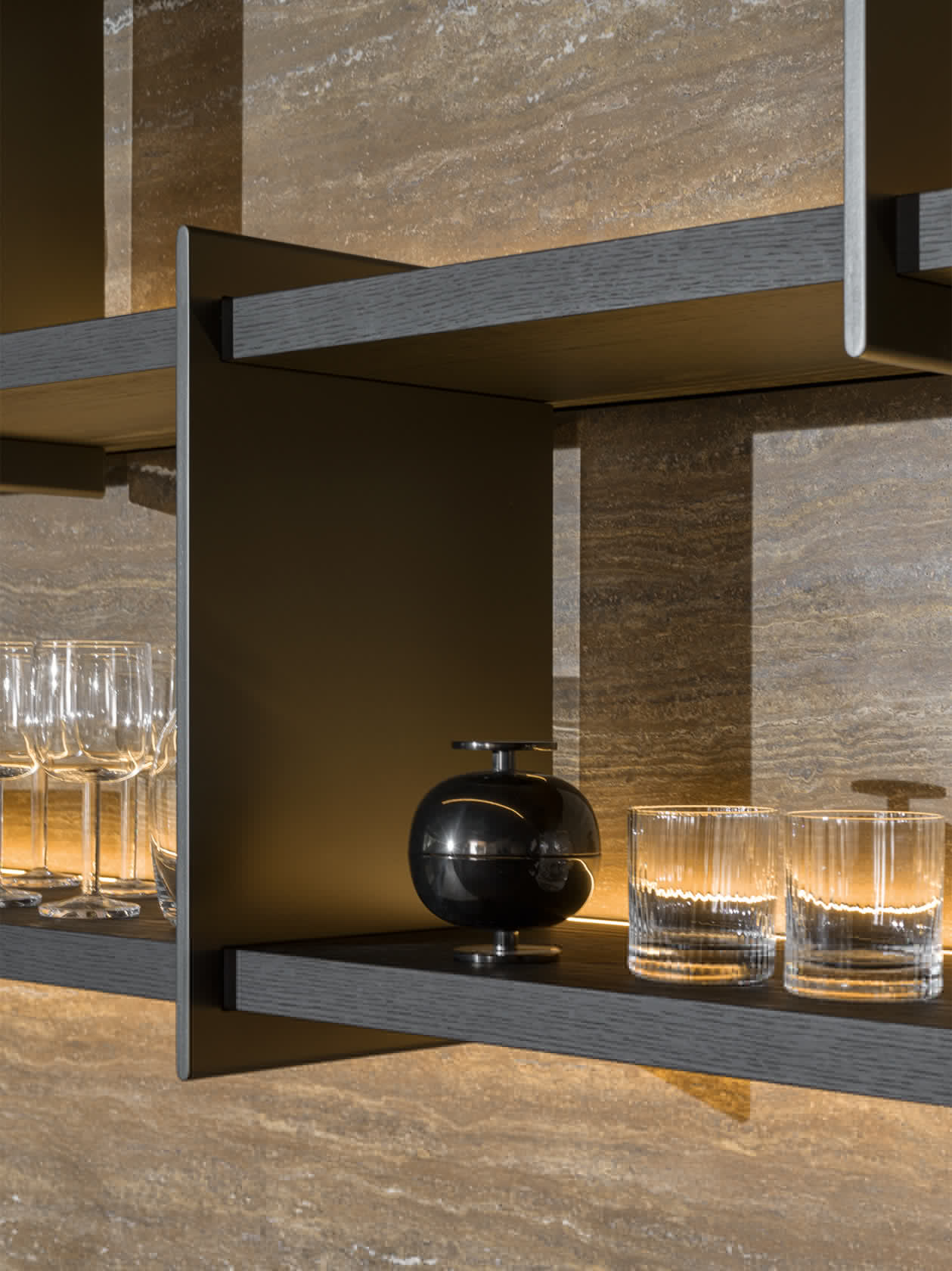505 UP Harry’s bar, design Nicola Gallizia, updates an element that has always featured in living spaces: the mobile bar, at the height of fashion in the 1950s and 60s, which becomes central in current lifestyles, once again open to conviviality. 505UP Harry’s bar has been designed as a totally autonomous element, but totally included in suspension in the 505 system. Two large doors, box-shaped or glazed with a full 180° opening thanks to a concealed hinge, give access to the internal compartment, with fine wooden, ceramic or ecoskin covering, designed to house and conserve tools and bottles for any type of drink.