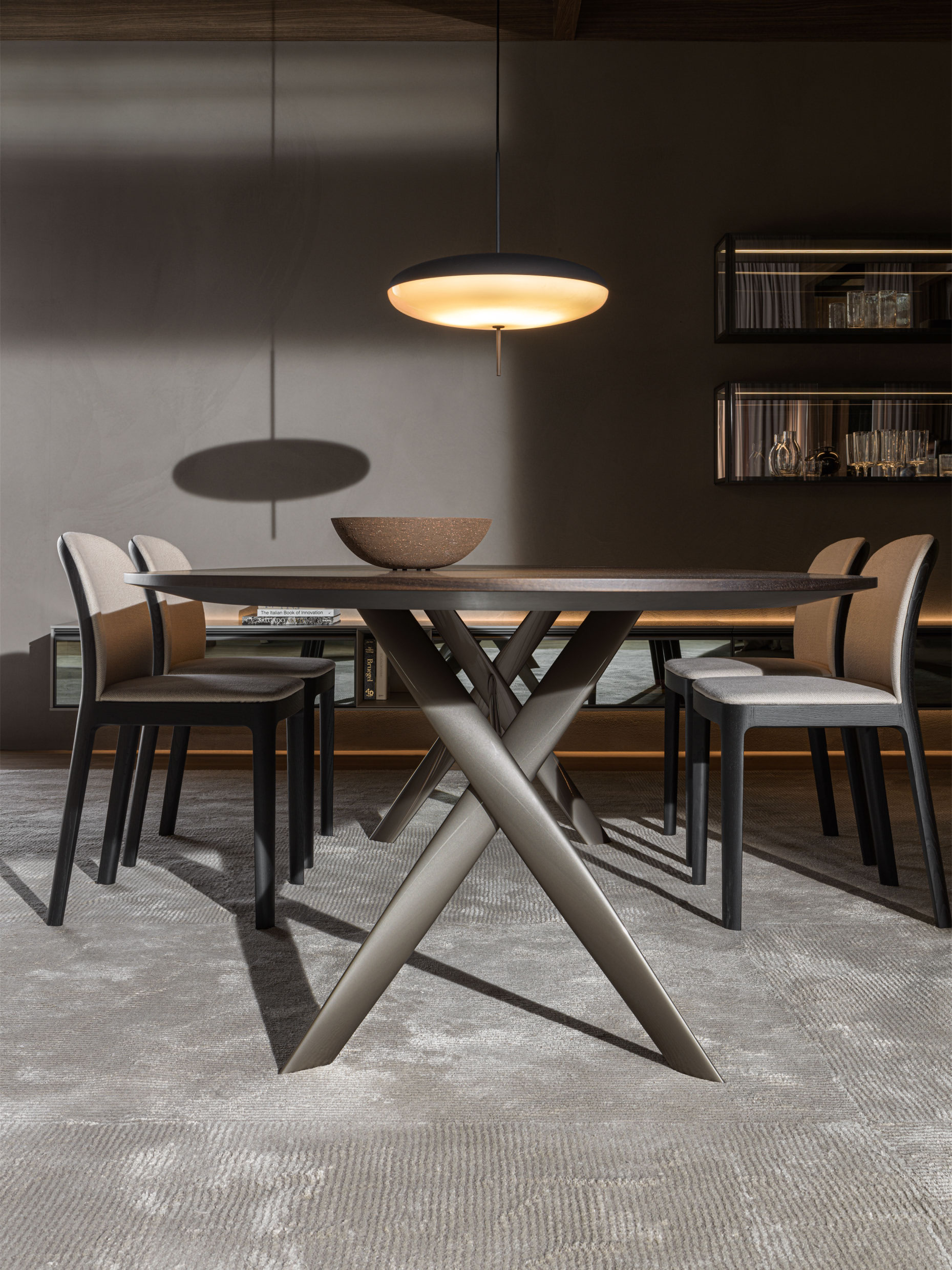 Gatwick, a table designed in 2019 by the architect Rodolfo Dordoni, has been renewed by providing the aluminium structure with a new Eucalyptus top featuring a sophisticated inlay design, in addition to the marble variants, already available in the Molteni&C collection.
