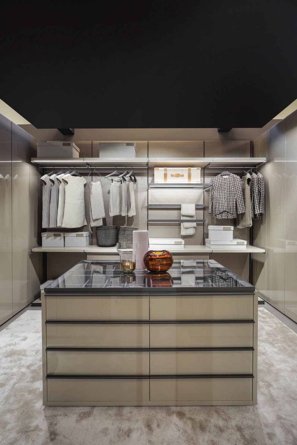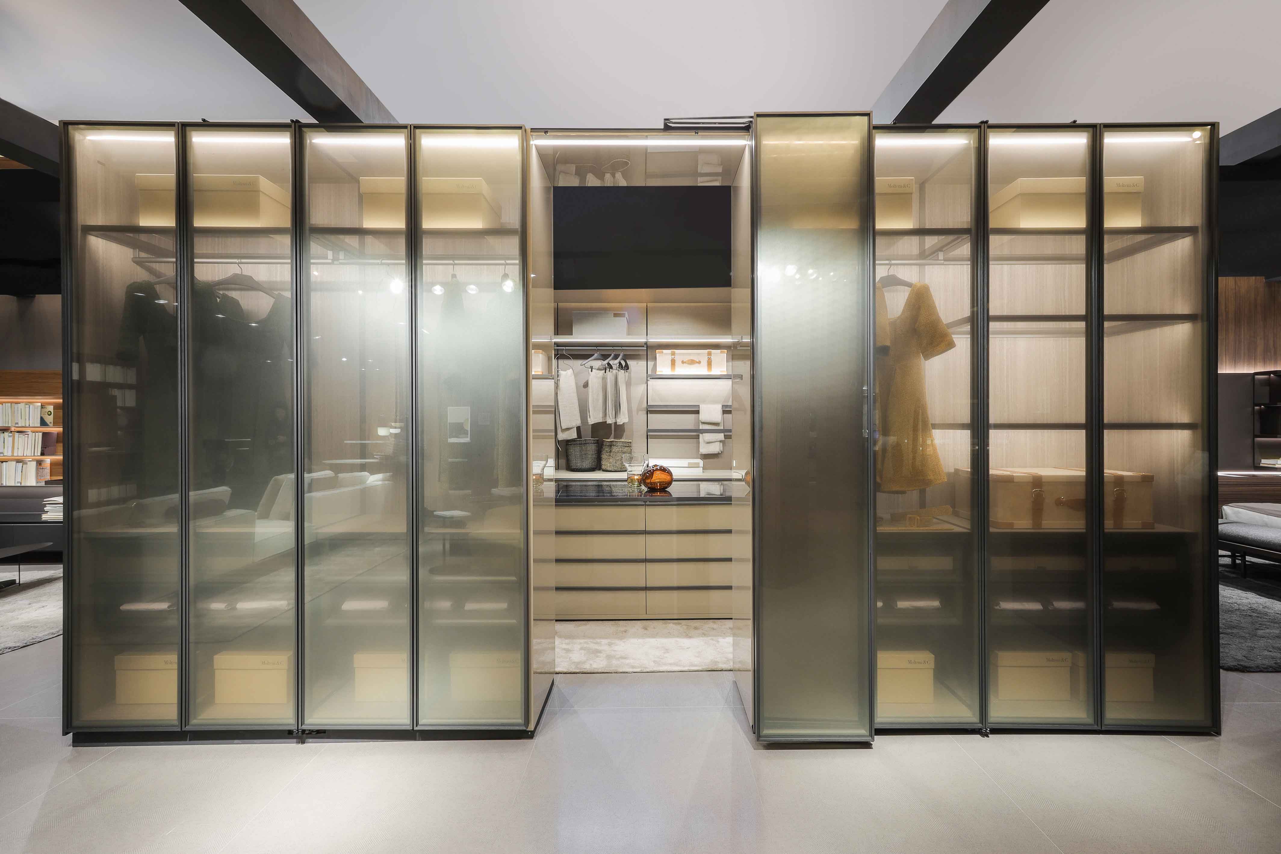GLISS MASTER 衣柜系统装备了一种新型的柜门,柜门配有一套精巧的开合机构: 系统7。这个设计项目的核心是一个获得专利的折叠机构,可以将柜门轻松和安静地 从最初的位置拉到隔间的一侧,让隔间完全打开。柜门打开并且自身折叠,与相邻的 隔间平行对齐,不会占用隔间前面的空间。系统7的机构可以使用厚重的漆制、木制或立面定制酸性蚀刻的玻璃柜门。