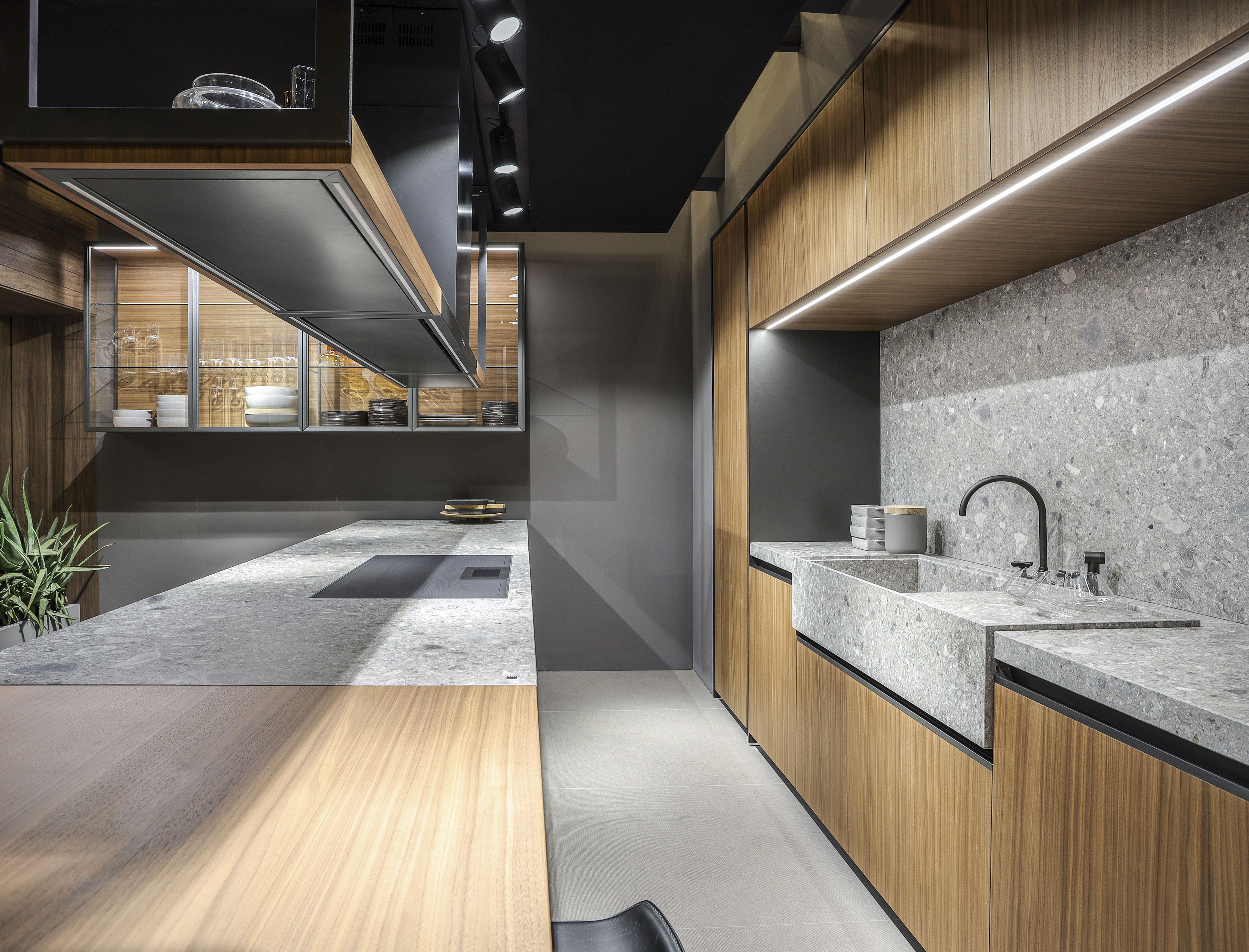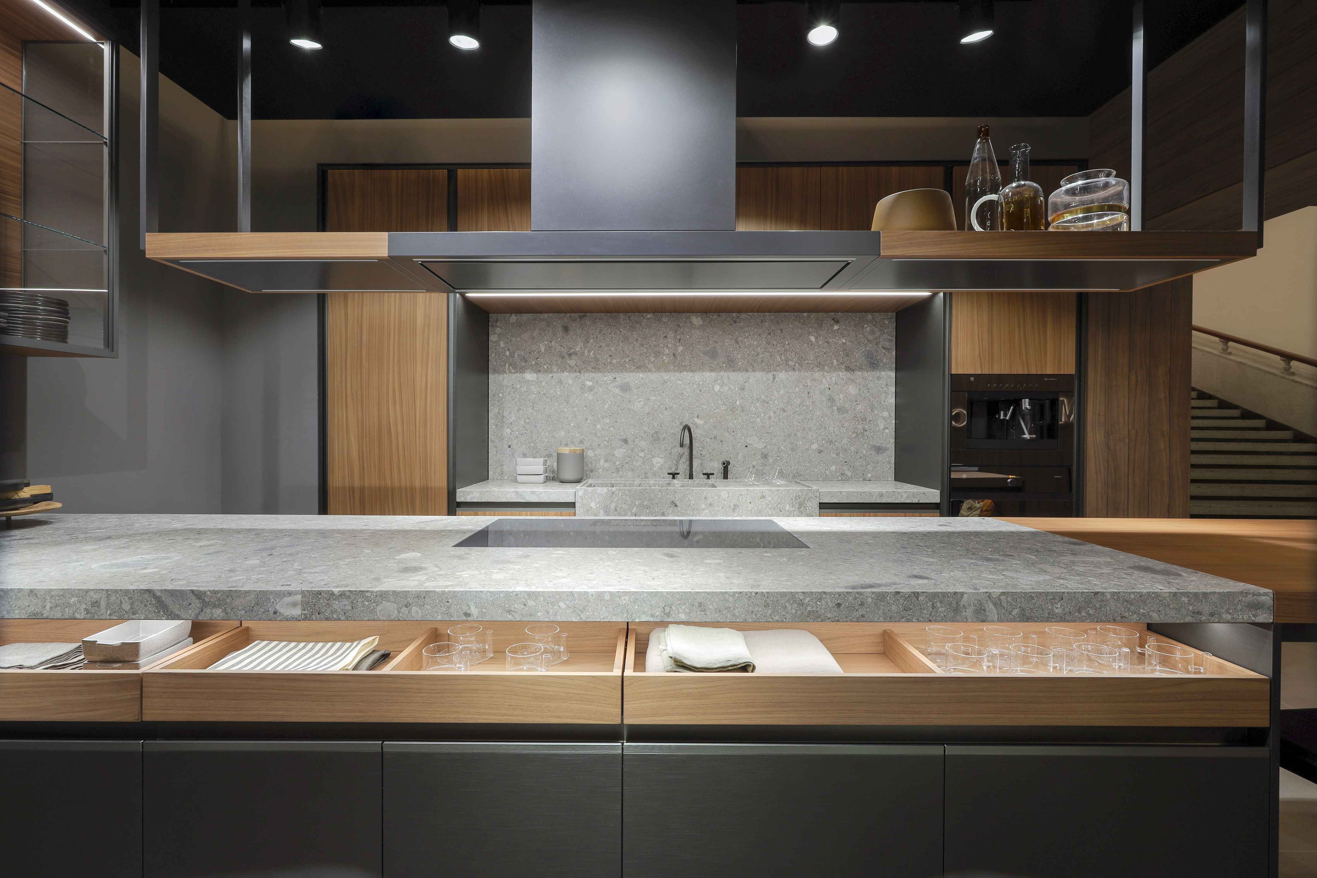 大型的拉出式托盘、日间抽屉和下方平面的集成式小轮完成了整个项目的结构设计。 铝制的支撑框架可以让所有的组合物完全贴近地面。创新揭示了集成式栏杆和LED的技术细节,而谨慎处理的柜门优化了抓地力,创新的铰链转轴可以让柜门开启至180°,获得更多的内部可利用空间。 得益于优雅的悬拱和配备了微型缓冲铰链的修长玻璃,厨房也因此获得了一种新的饰面。