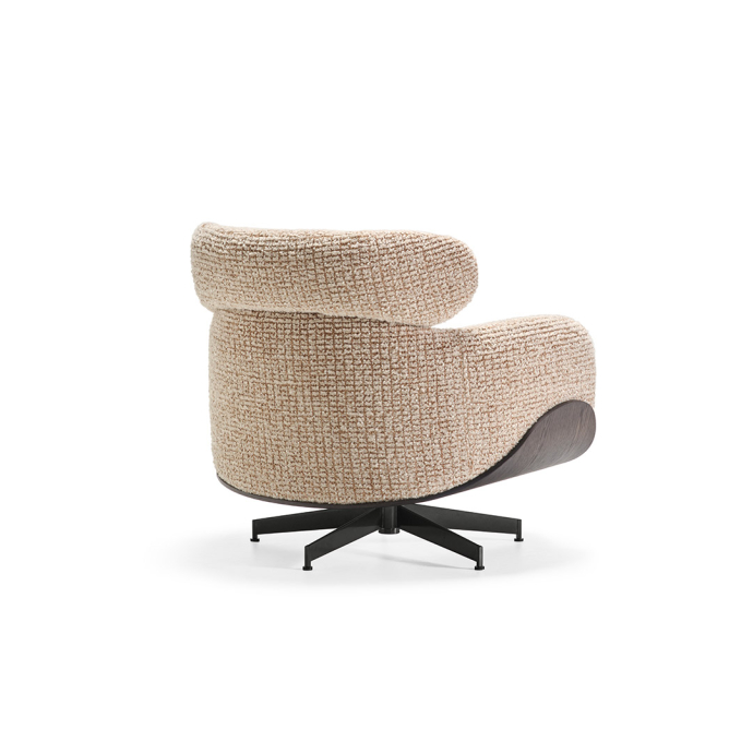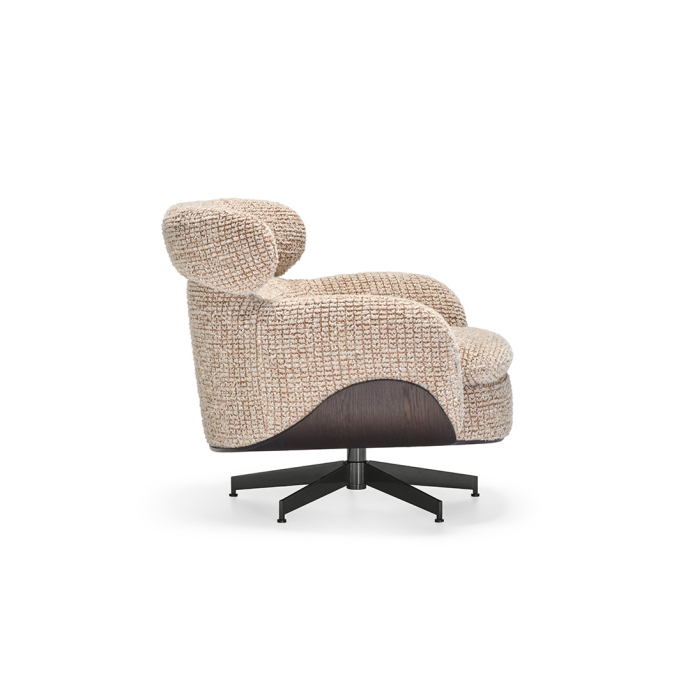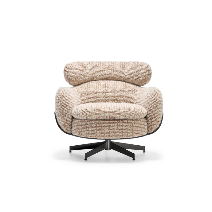 Leonard以亮面白镴色钢制旋转底座支撑,实现灵活转动且不影响稳定性。底座设计使得扶手椅能够轻松适配多元使用场景,其低调的饰面处理令视觉焦点集中于结构本身。比例精准考究,确保扶手椅既能融入私密空间,亦适合点缀开阔区域。