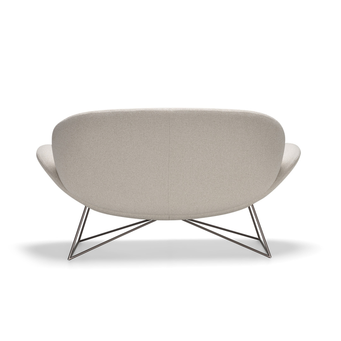 Die unverwechselbare Silhouette des Loveseats D.157.6, der aufgrund seiner nahtlos geschwungenen Form, die an eine Schote und zwei längliche Blätter erinnert, ursprünglich Due Foglie genannt wurde, wird von einer filigranen Rahmenstruktur mit Metallfinish getragen. Das charakteristische Merkmal des Loveseats ist zweifellos die Schaumstruktur, die speziell durch zwei Formen gestaltet wurde. Abgesehen von seiner markanten Ästhetik bietet dieses Merkmal ein einzigartiges Sitzgefühl: geräumig und bequem für eine Person und gleichzeitig ideal für intime Gespräche oder ruhige Momente zu zweit.