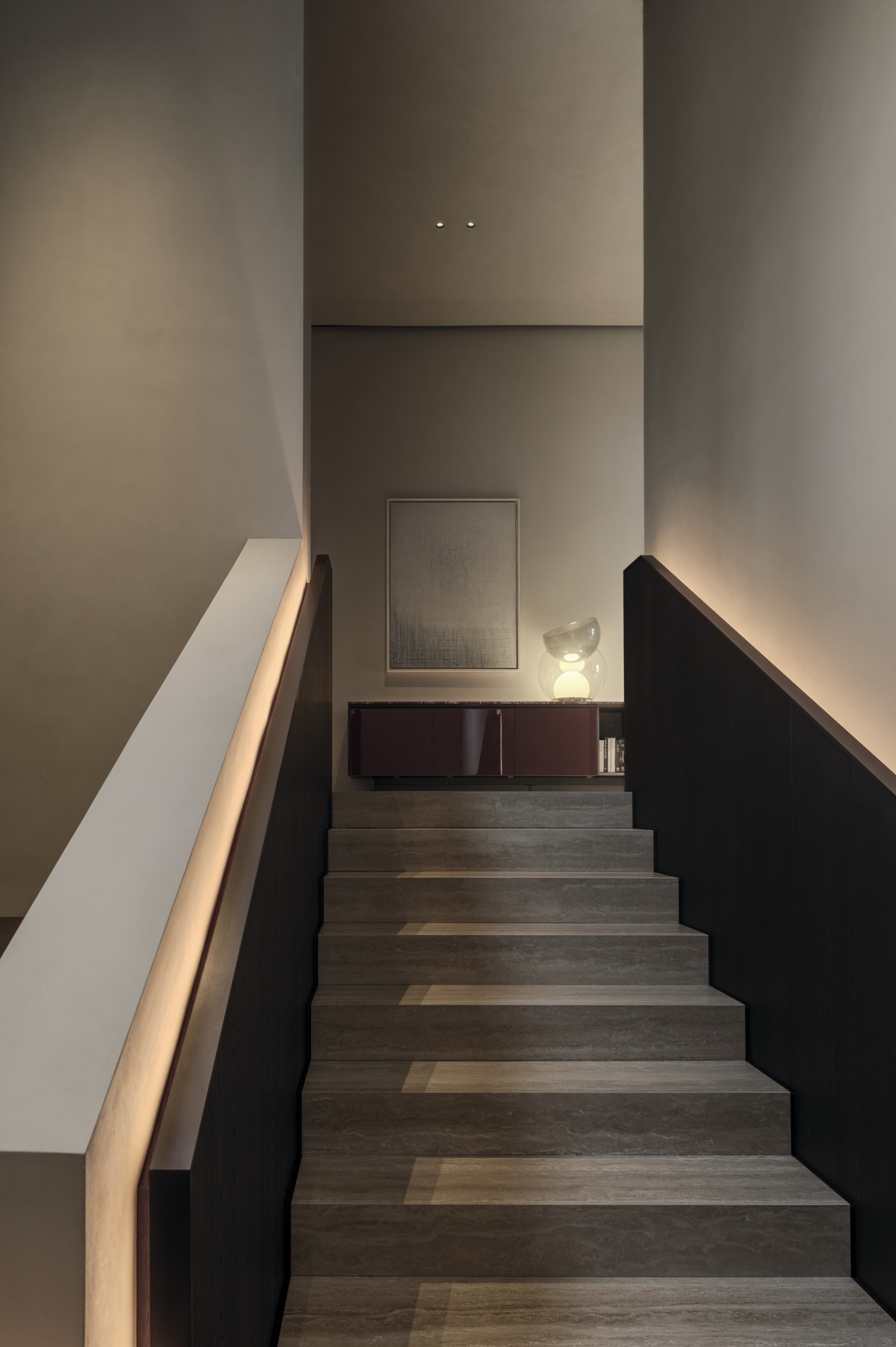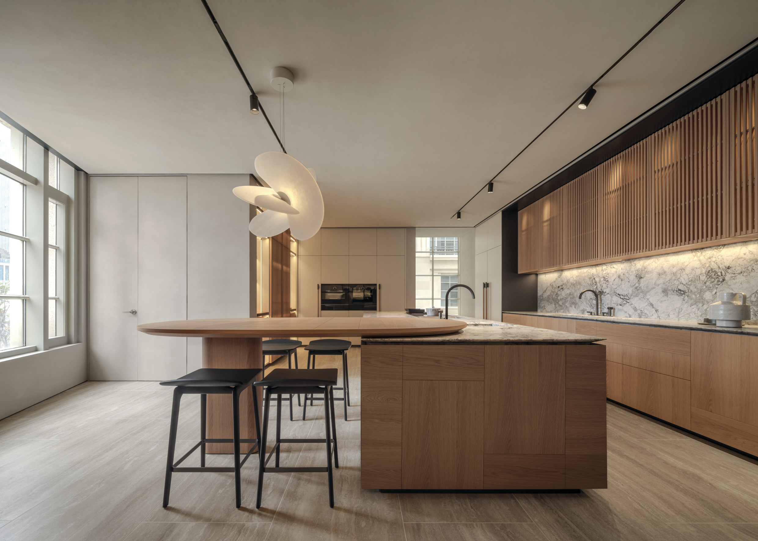 Upon entry, guests are greeted with living and dining areas, multiple kitchen compositions, and bedroom spaces — offering inspiration for every part of the home. The immersive layout reflects an inviting atmosphere with a harmonious blend of rich materials is featured throughout. Wood introduces warmth and depth to the space, while the use of travertine adds texture and sophistication, together creating a refined, contemporary aesthetic.