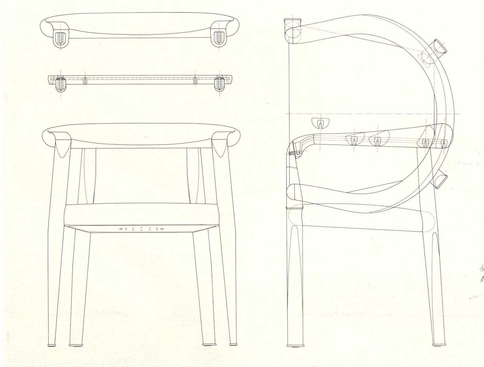 Die Form beruht auf einem System rhythmischer Linien, die weichen und übergangslosen Halt bieten. Die Beine sind feingliedrig und gespreizt zugunsten der Stabilität. Die vorderen gehen in einer Biegung in die Armlehnen und weiter in einer Krümmung in die Rückenlehne über. Die Hinterbeine streben stützend in die Rückenlehne. Die Sitzfläche integriert sich in diese Linienführung und verbindet sie. Tobia Scarpa hat das Verbindungselement der Armlehnen neu entworfen, um diese linearer und bequemer zu gestalten. Gestell aus Esche natur oder schwarz gebeizt, Sitzfläche aus Leder bzw. geflochtener Kordel in den Farben Ecru und Grau.