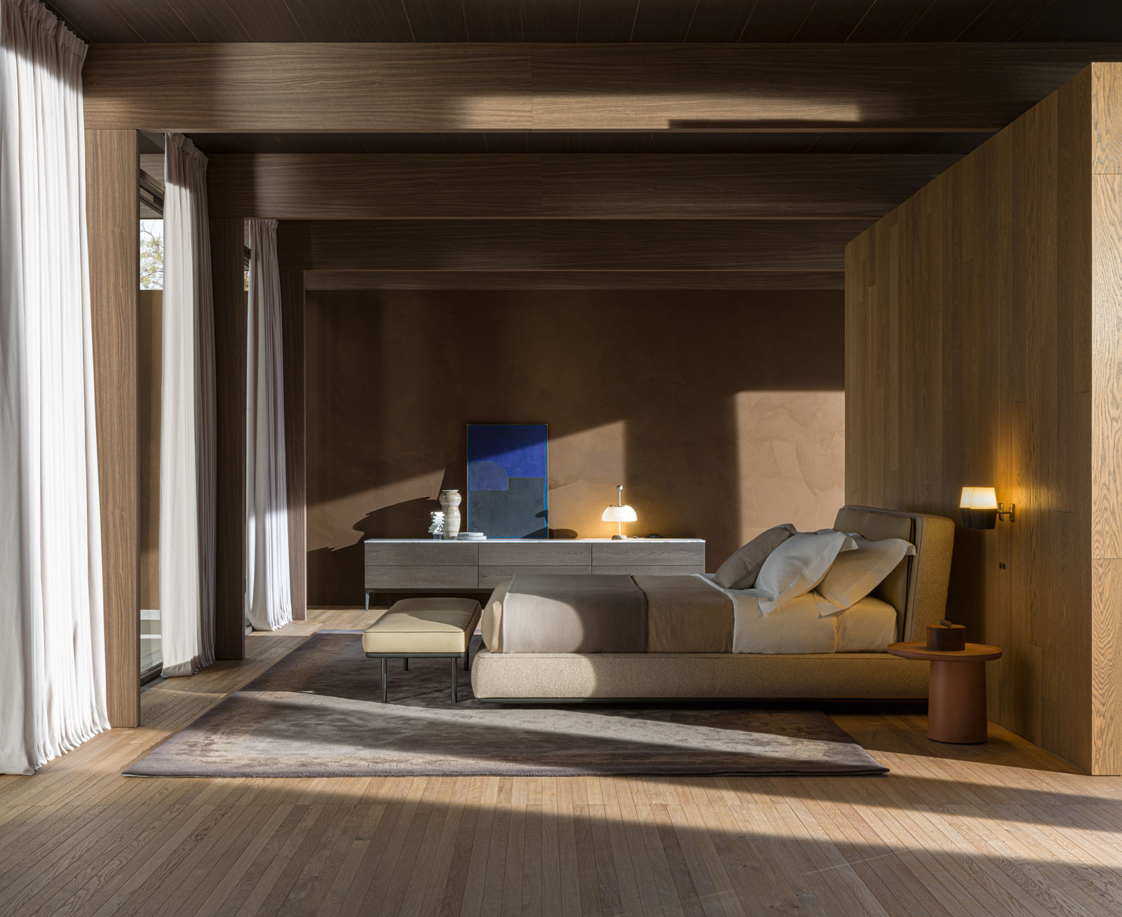 Aldgate Bench is designed to mirror the sophistication and unparalleled comfort of the Aldgate Bed by Rodolfo Dordoni. The bench features a removable outer cover crafted from bonded velveteen cotton blend and stands upon sleek, aluminum feet. Rodolfo Dordoni’s Aldgate Bench creates a cohesive and harmonious atmosphere in the bedroom.