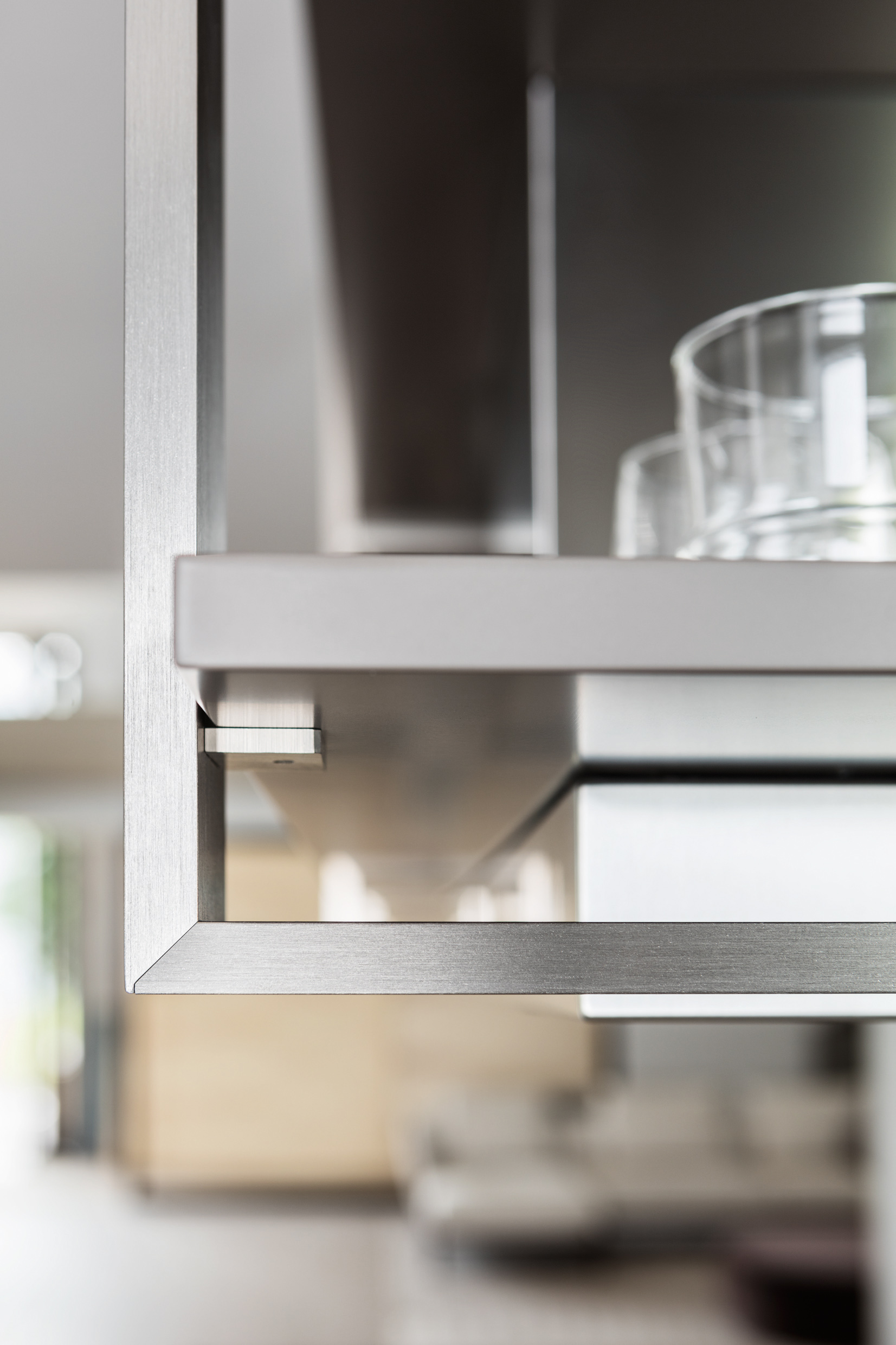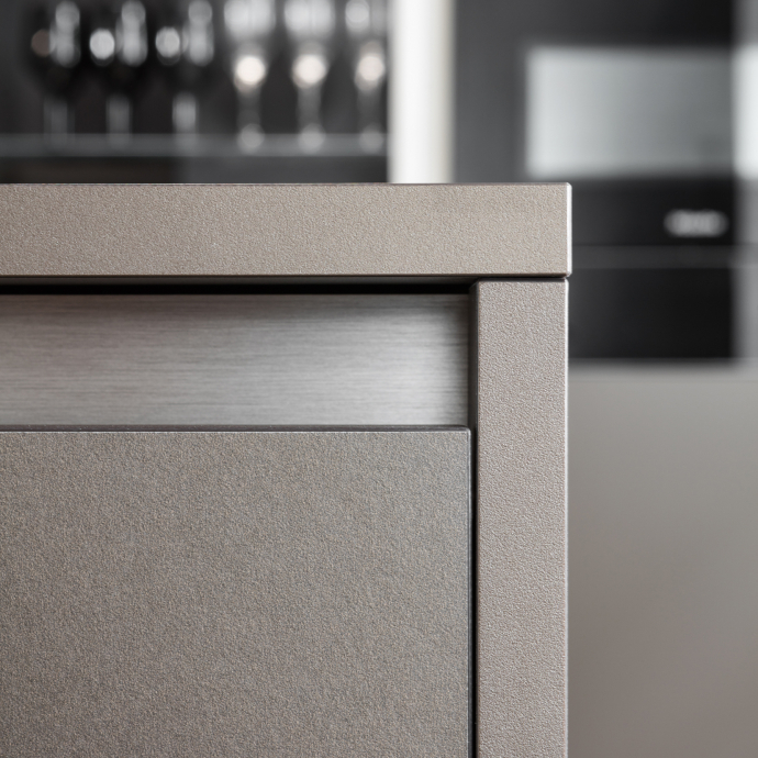 A unitary project, simple and linear: Hi-Line 6 is more than just a kitchen. It's a space to live in. This space is organised with "esprit de géométrie" combined with rigorous shapes, richness of detail and care for quality in construction. The base units are taller, to hold more and better. Far from the classic concept of the kitchen, Hi-Line 6 allows for several composition options. No handles are used – instead there is a finger recess to open and close the doors.