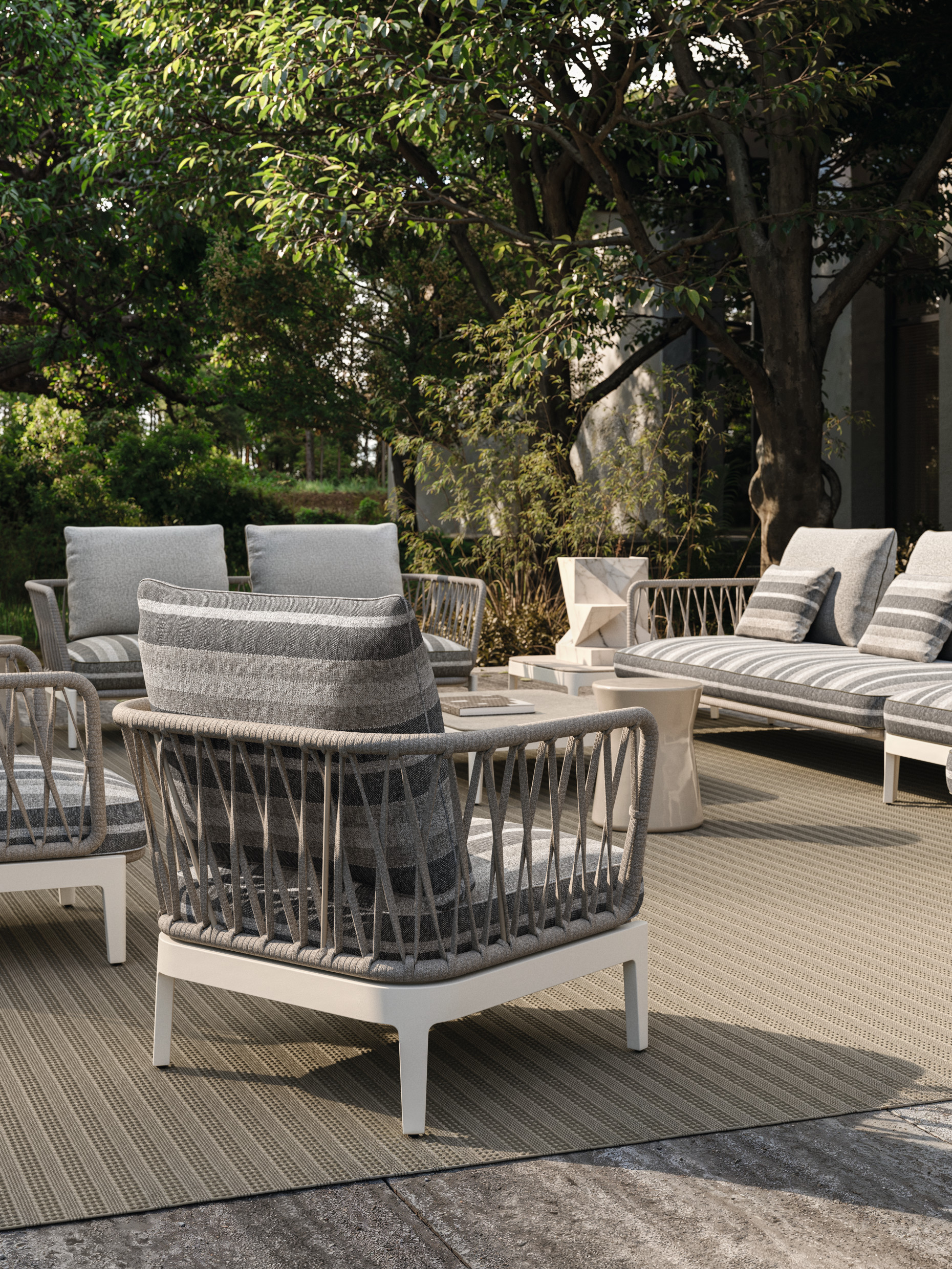 Encircling the seat, the backrest and armrests are wrapped in a handcrafted polypropylene rope weave. Executed in an exclusive dust‑grey tone, the weave forms a sophisticated surface that combines durability with tactile refinement. Resistant to atmospheric agents, this meticulous pattern expresses a decorative language that connects craftsmanship with contemporary outdoor design.