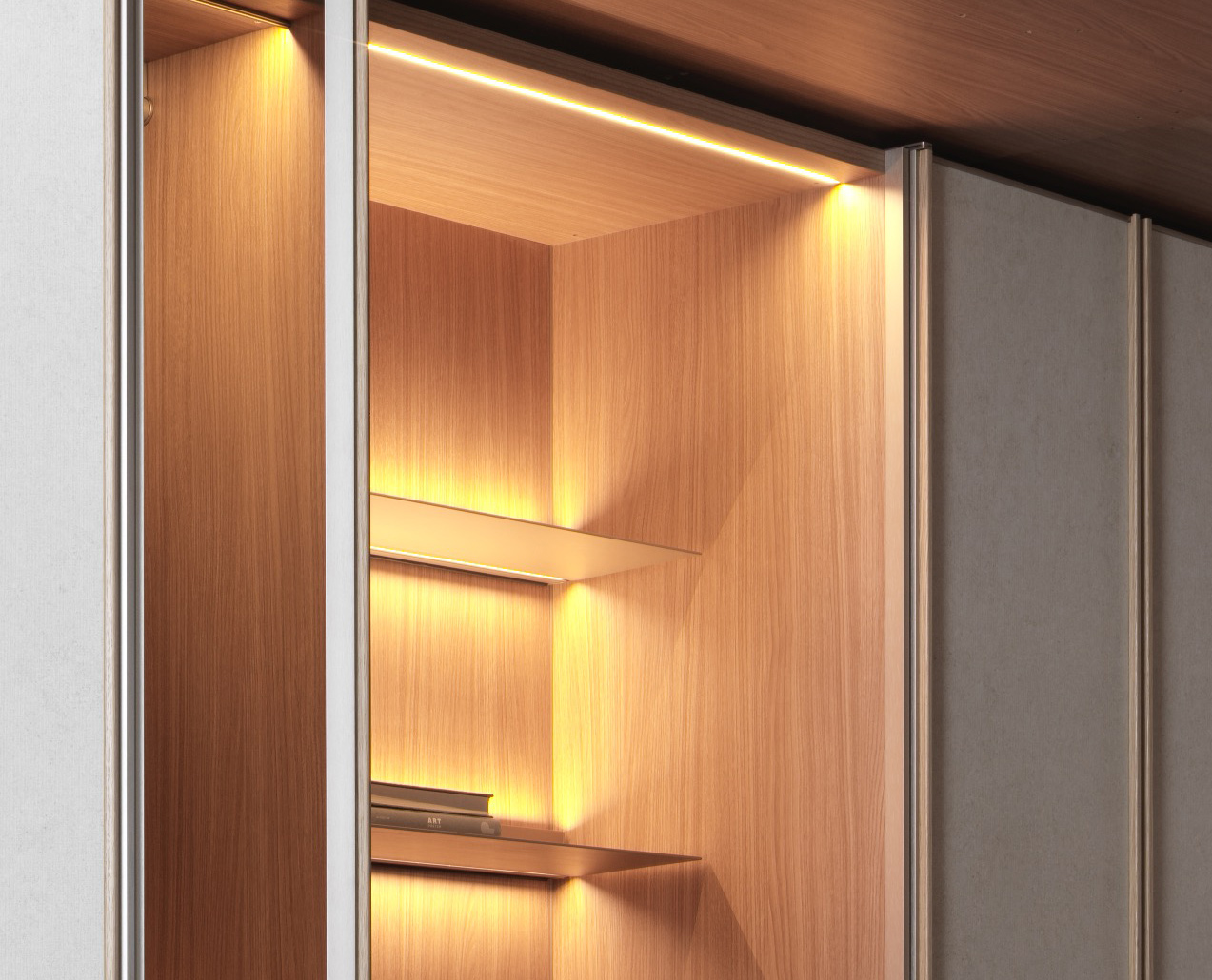 AIRCUB ® – a Molteni&C exclusive – is an IOT device easily manageable from your smartphone with a dedicated APP. The air purification and perfuming system works by ionizing and ozonizing wardrobe interiors, thereby removing up to 95% of agents harmful to health, while releasing delicate fragrances.