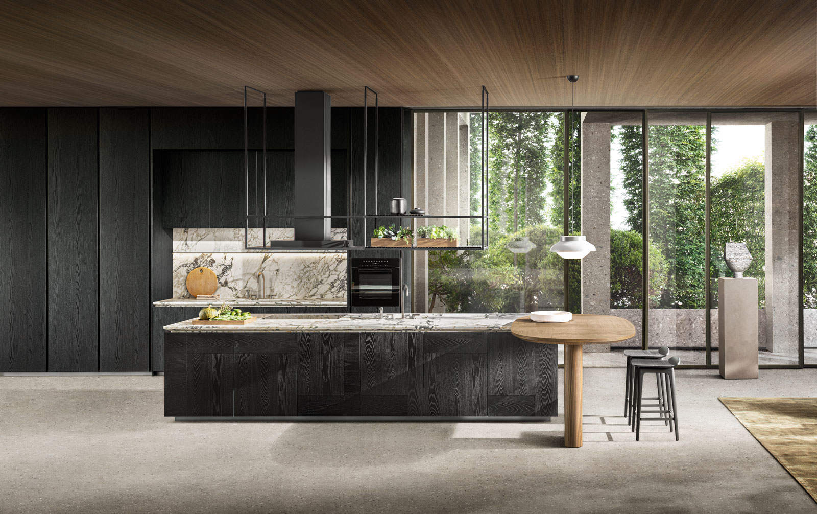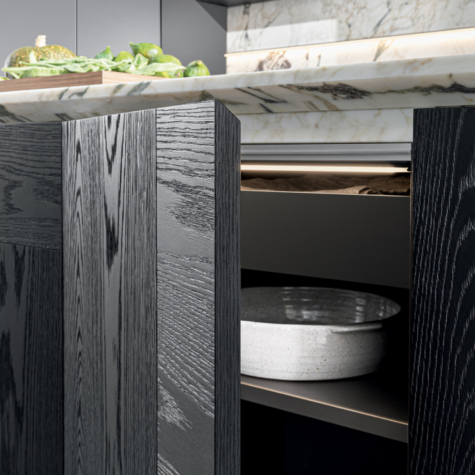 These monomaterial “shells”, subsequently applied to alveolar aluminium panels, guarantee that they are light, stable and mechanically resistant, thereby allowing a door to be built all in one with the side panels of the island. And the material nature of natural stone, with its unique and unrepeatable look, enters our homes with a spectacular application.