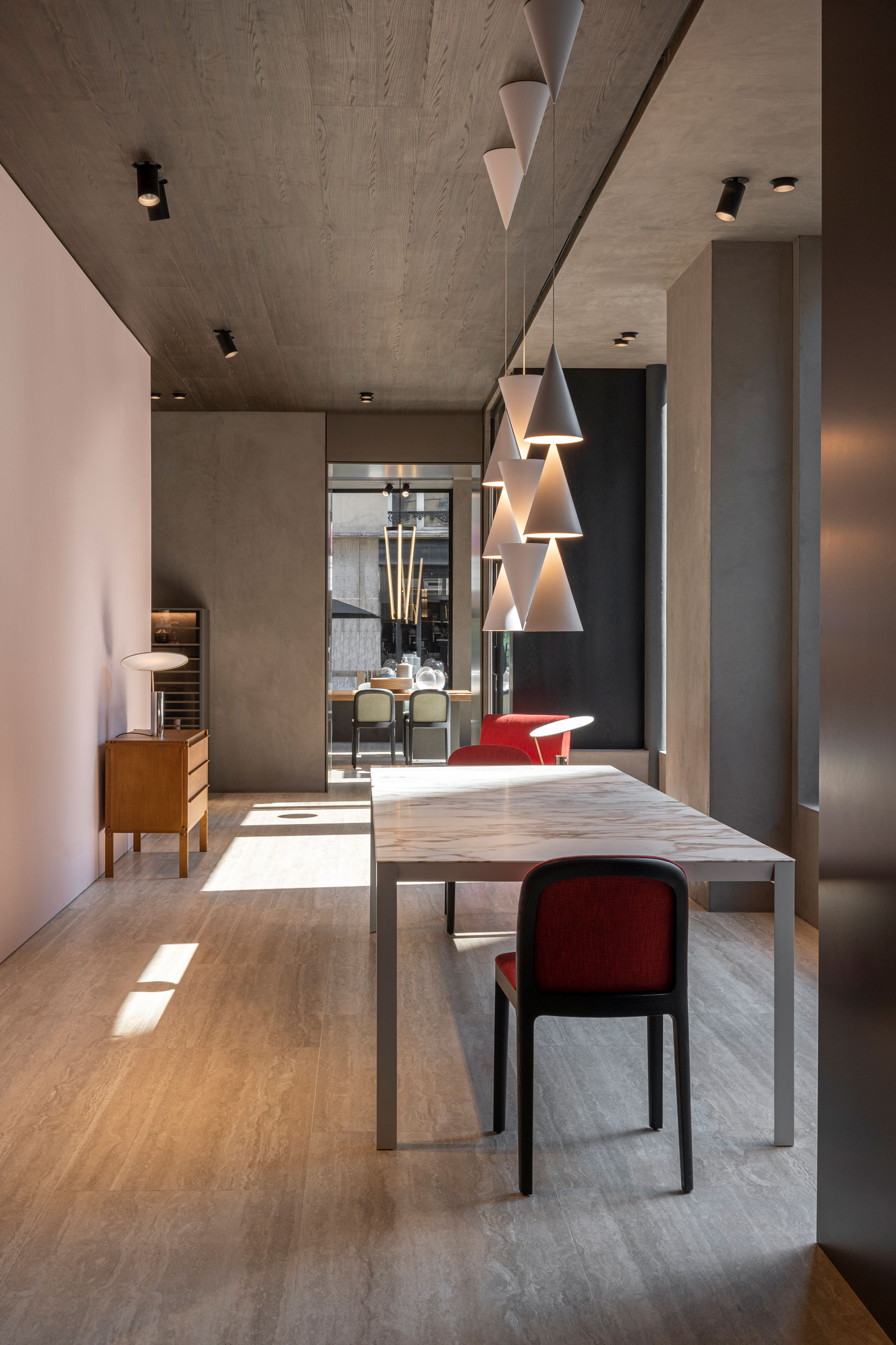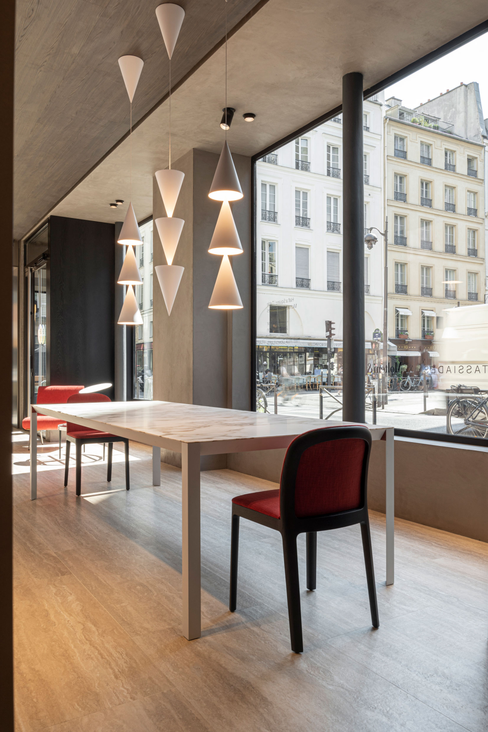 Molteni&C Paris Flagship Store is interpreted by Michael Anastassiades during 2023 Designer’s Days. Cypriot by birth who has made London his home, Anastassiades set his Half a Square Table in the context of the 2023 Molteni&C collection. An unconventional yet harmonious encounter between Molteni&C furniture and the minimalist character of the table.