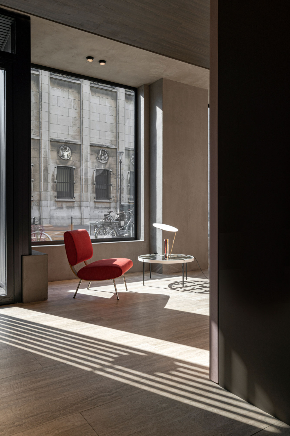 The pieces include his own ‘Half a Square Table,’ a minimal yet impeccably crafted dining table featuring a top in white Carrara marble, Werner Blaser’s MHC.1 dress in honey pattern wood, Gio Ponti’s D.555.1 coffee table and the D.154.5 armchair and Jasper Morrison’s red and black oak Tea chairs.