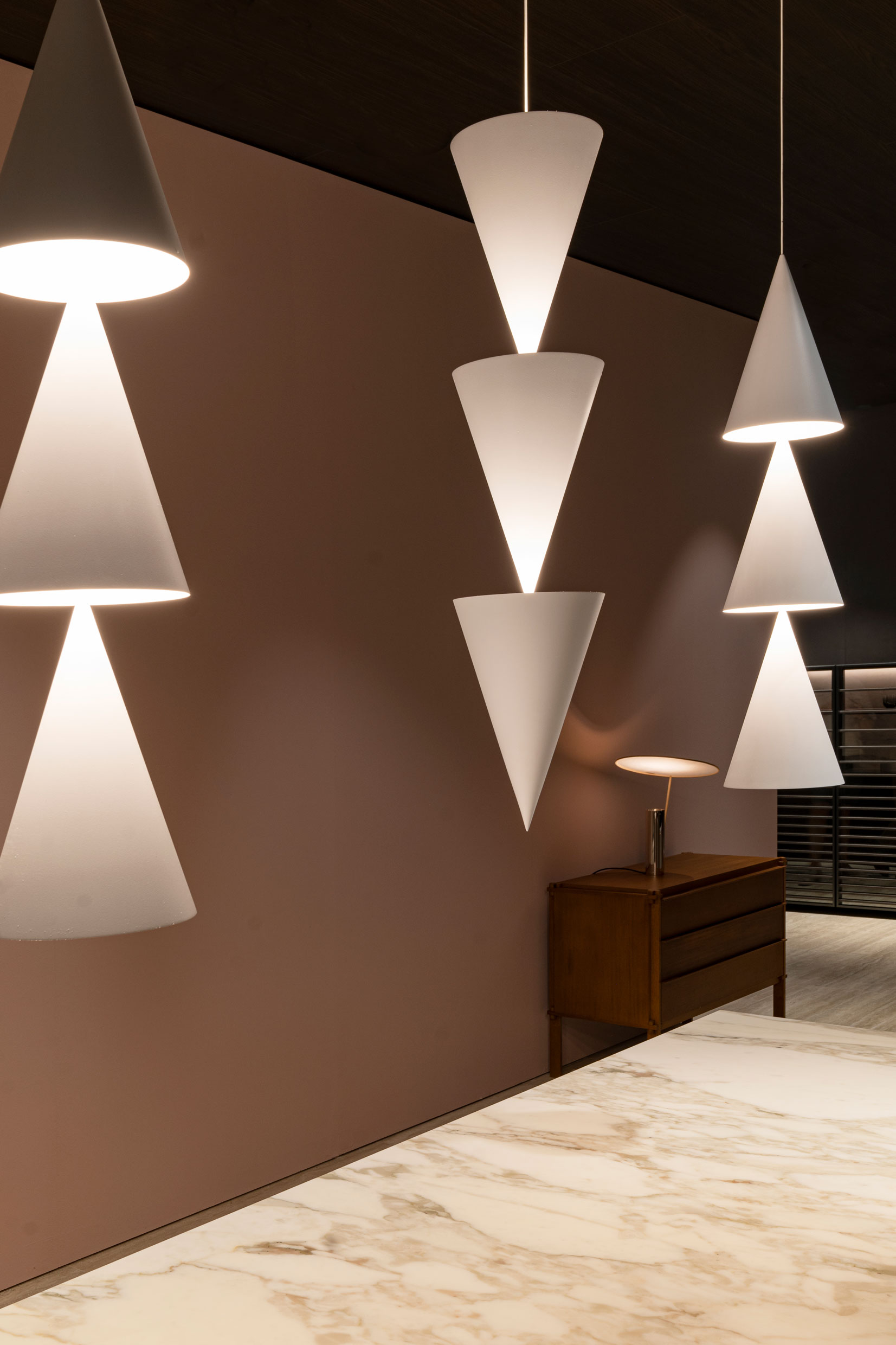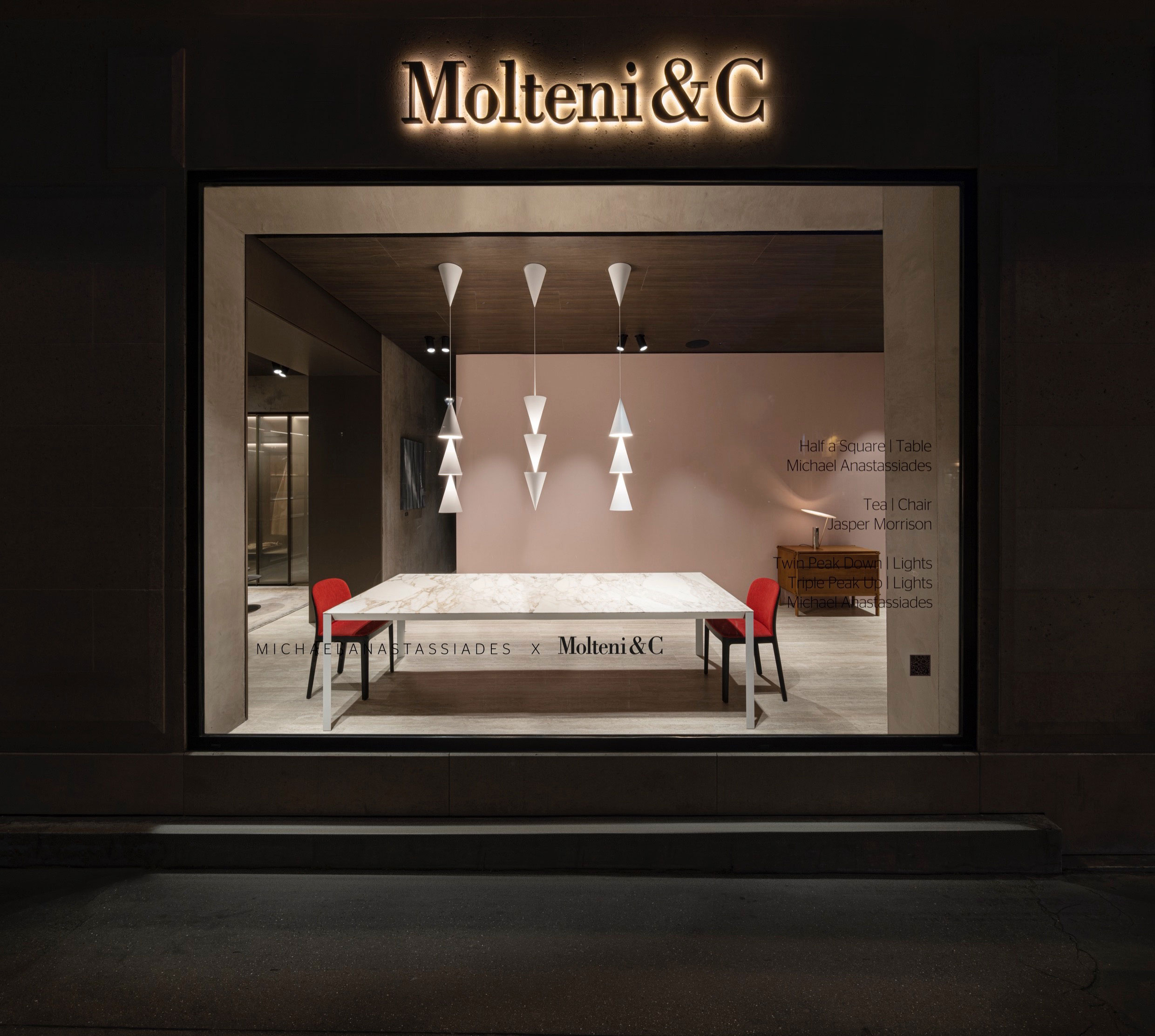 Set against a backdrop of dusty pink, Anastassiades has intuitively paired his lighting collection, including the all-new Twin Peak Down and Tripe Peak up pendant lamps, with iconic pieces of the Molteni&C collections, that span the historic brand’s many decades of work.