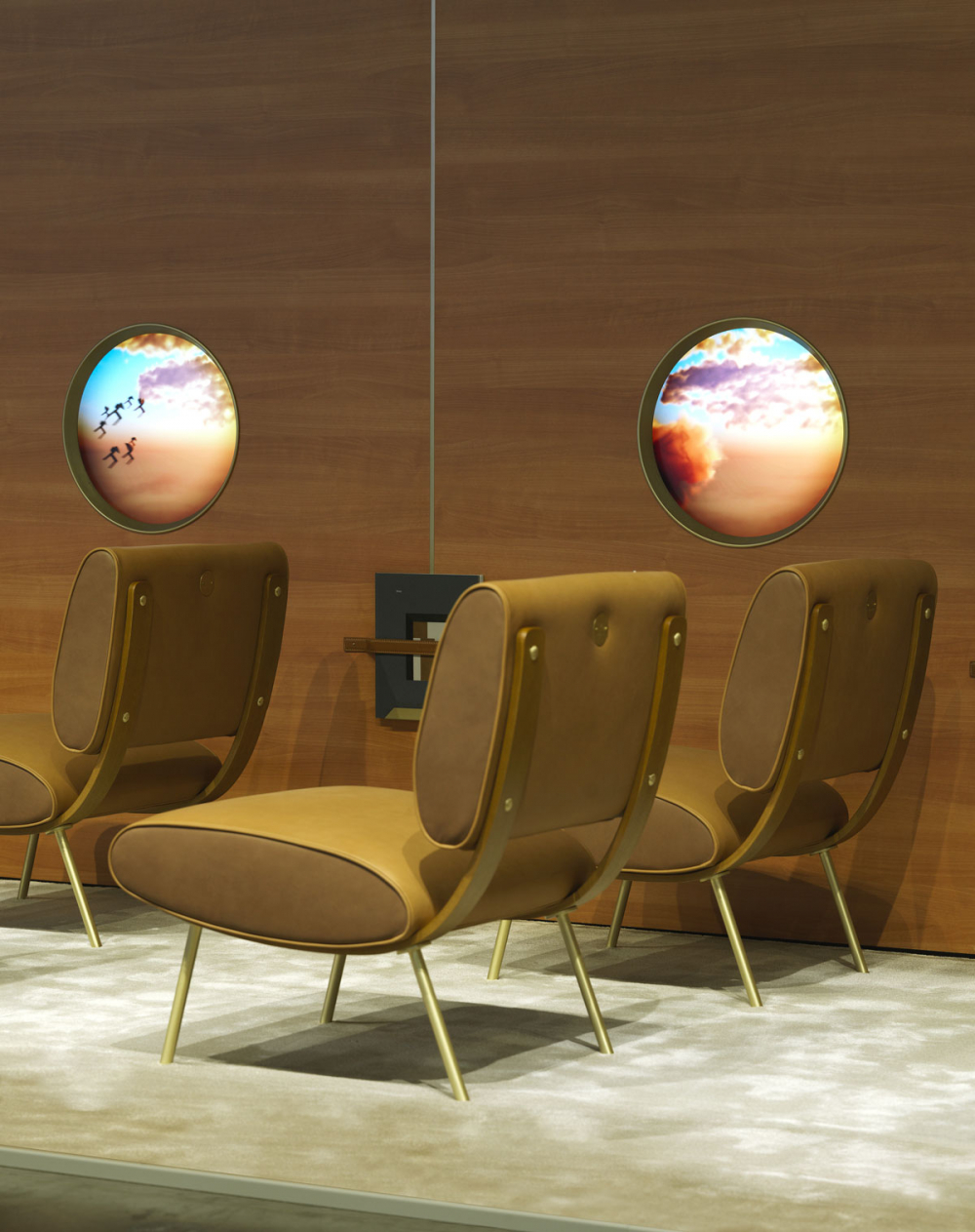 The installation directed by Ron Gilad is translated into the interior of an aeroplane, with animated windows that look out onto a sky where reality meets fantasy and the Molteni&C collections are the key players. The Round armchairs, in leather and fabric, are arranged in a line at the windows to host passengers on their trip.