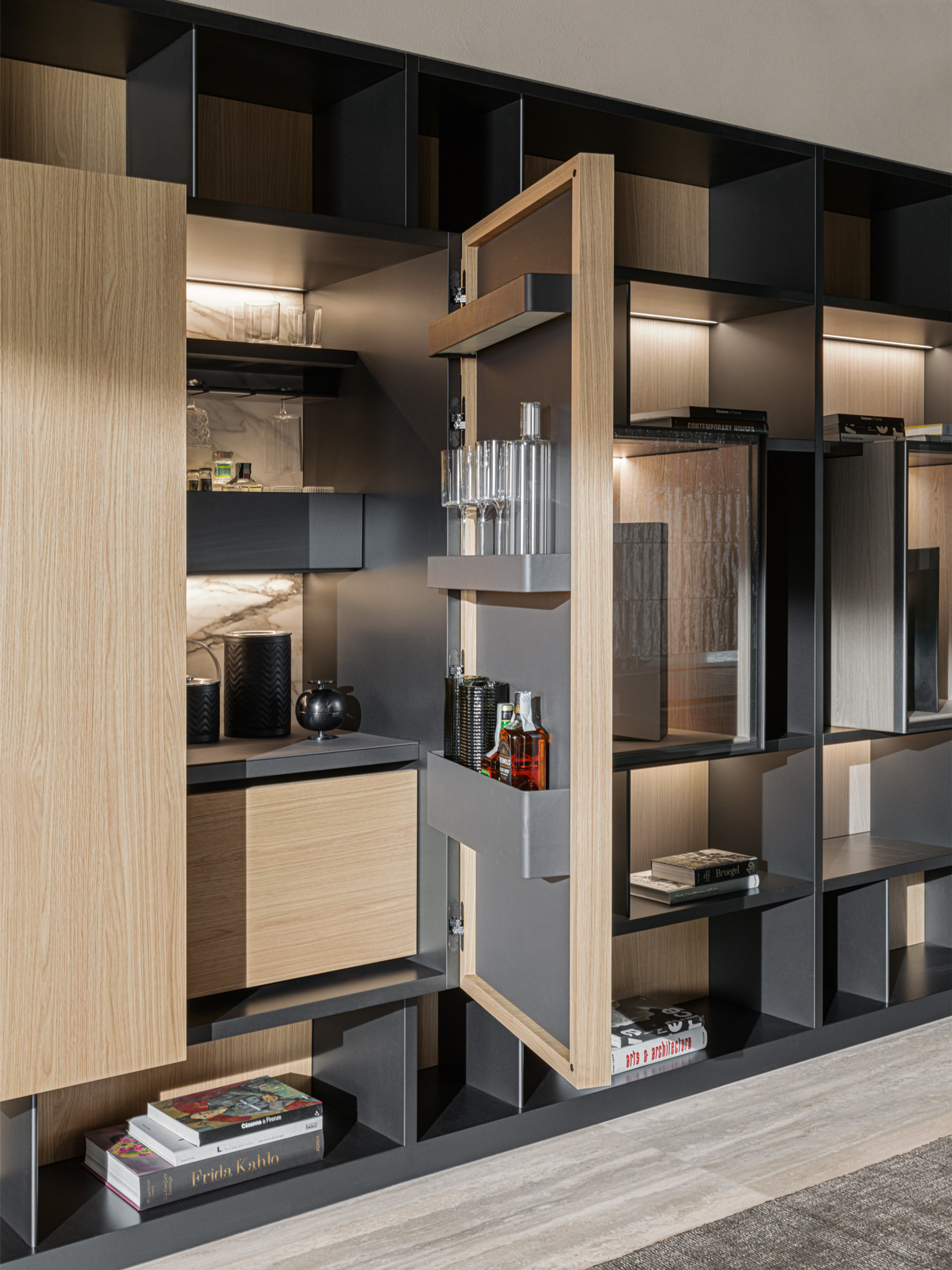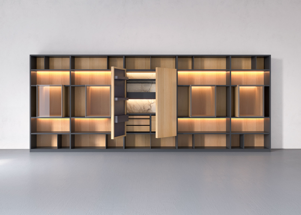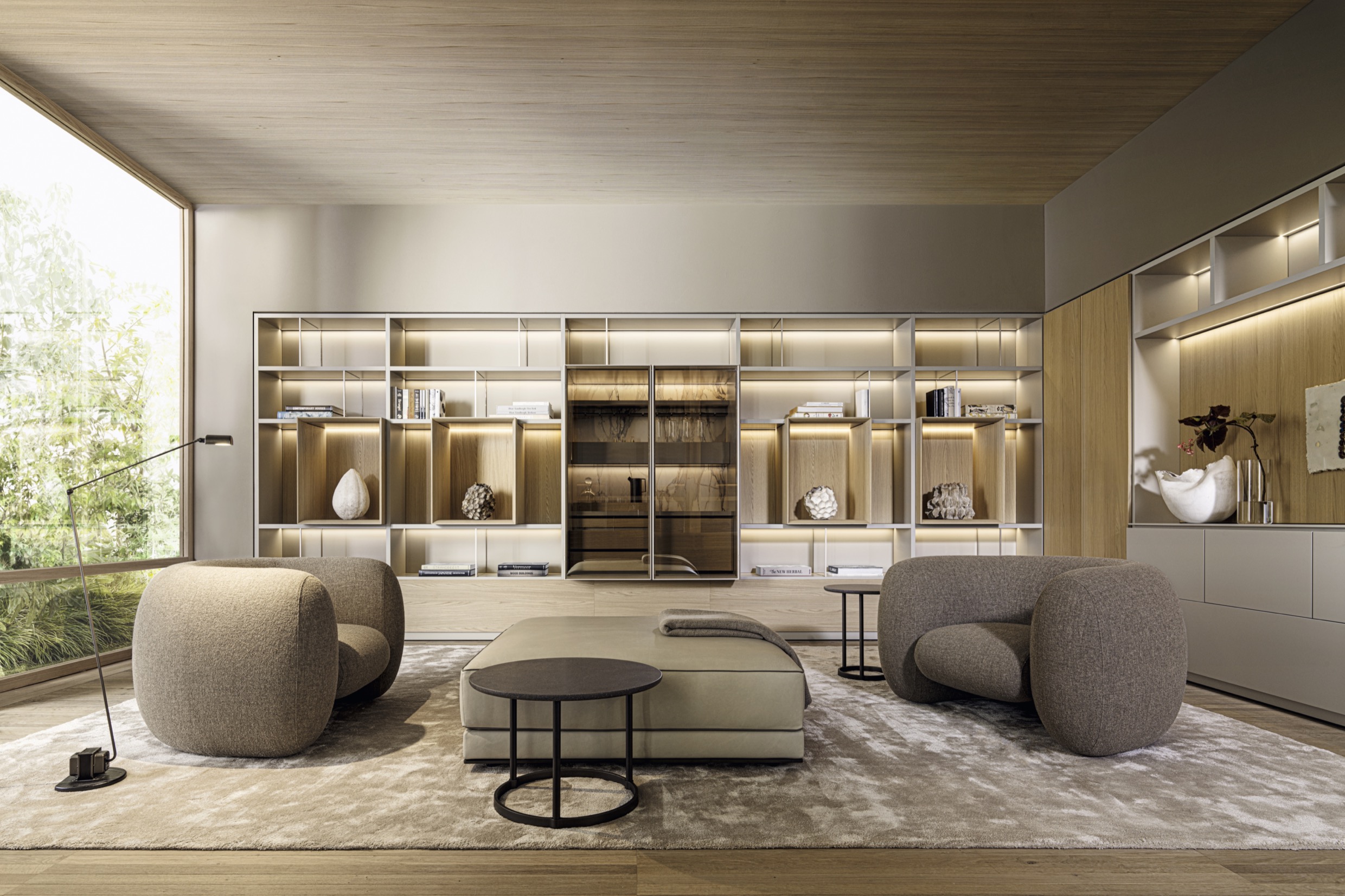 The 505 UP system, a hallmark in Molteni&C's range of modular furniture for living areas, continues its evolution to cater to contemporary lifestyle demands. Born not only as a project for furniture but also for architecture, it creates space and plays with geometries reminiscent of buildings in a city.