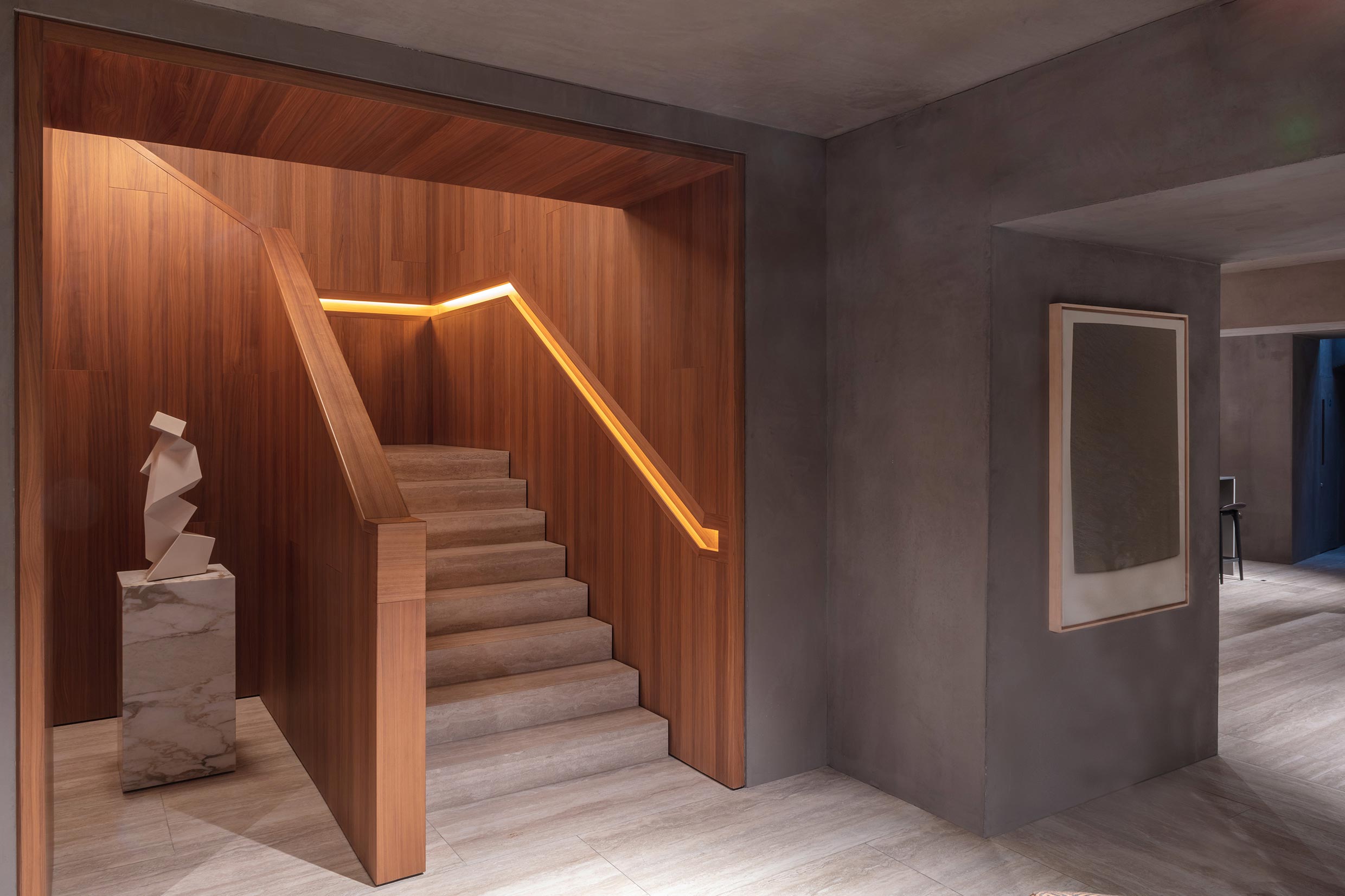Conviviality shines through in the products from the 2023 Collection that furnish the space, including the Mateo table, the Augusto sofa, the Paula armchair, and the Aster and Regent coffee tables designed by Creative Director Vincent Van Duysen, as well as the Porta Volta chair by Herzog & de Meuron.
