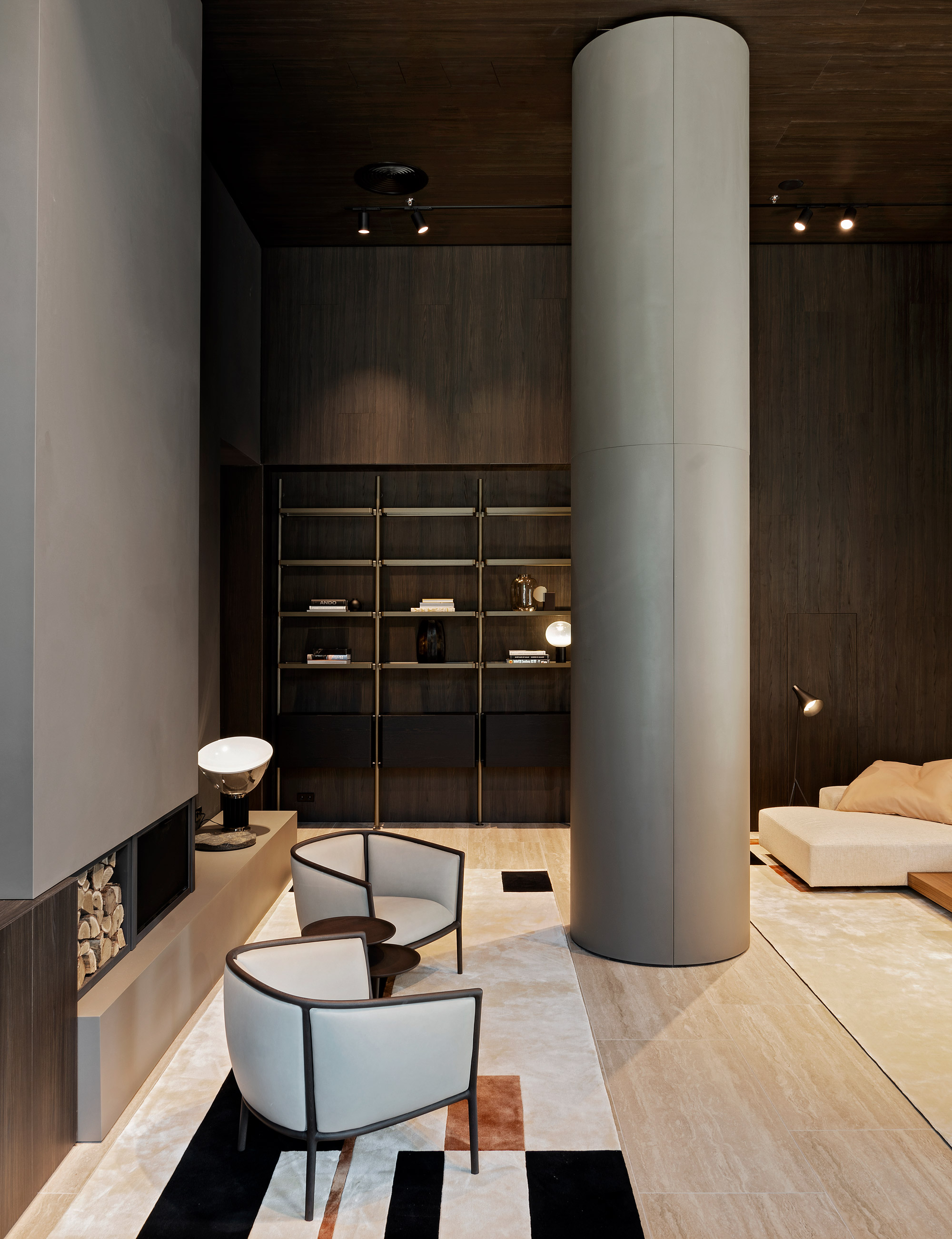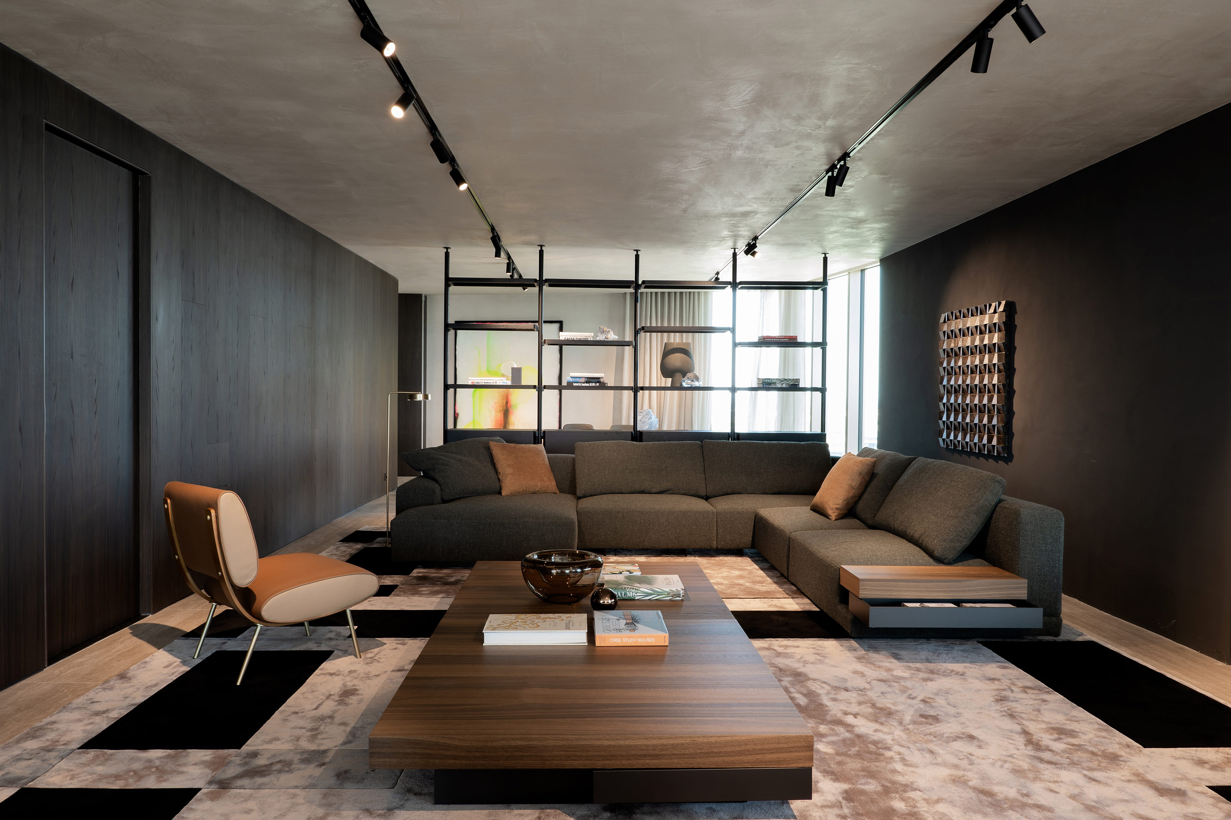 The Palette rug frames Hector Night combined with the Gliss Master wardrobe and leads to an elegant night-time area. This features iconic furnishings by Gio Ponti: the D.754.1 rug and a pair of D.153.1 chairs. Vincent Van Duysen’s Ribbon bed takes pride of place and invites guests to enjoy the view beyond the large window. Visitors again find themselves in an elegant living room in which the Hector bookcase visually subdivides the areas according to their use: on one side Gio Ponti’s large D.859.1 table and Rodolfo Dordoni’s Barbican chairs, on the other a spacious configuration of Vincent Van Duysen’s Marteen sofa and coffee tables.