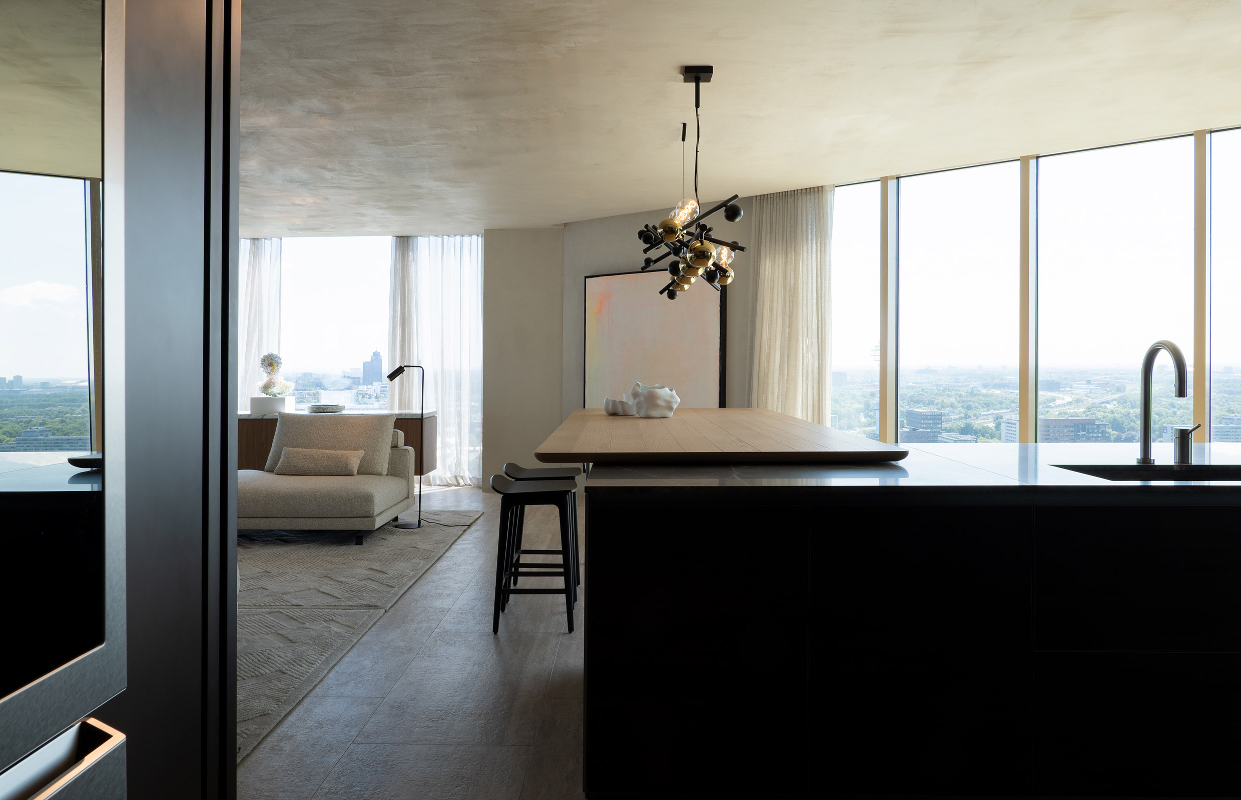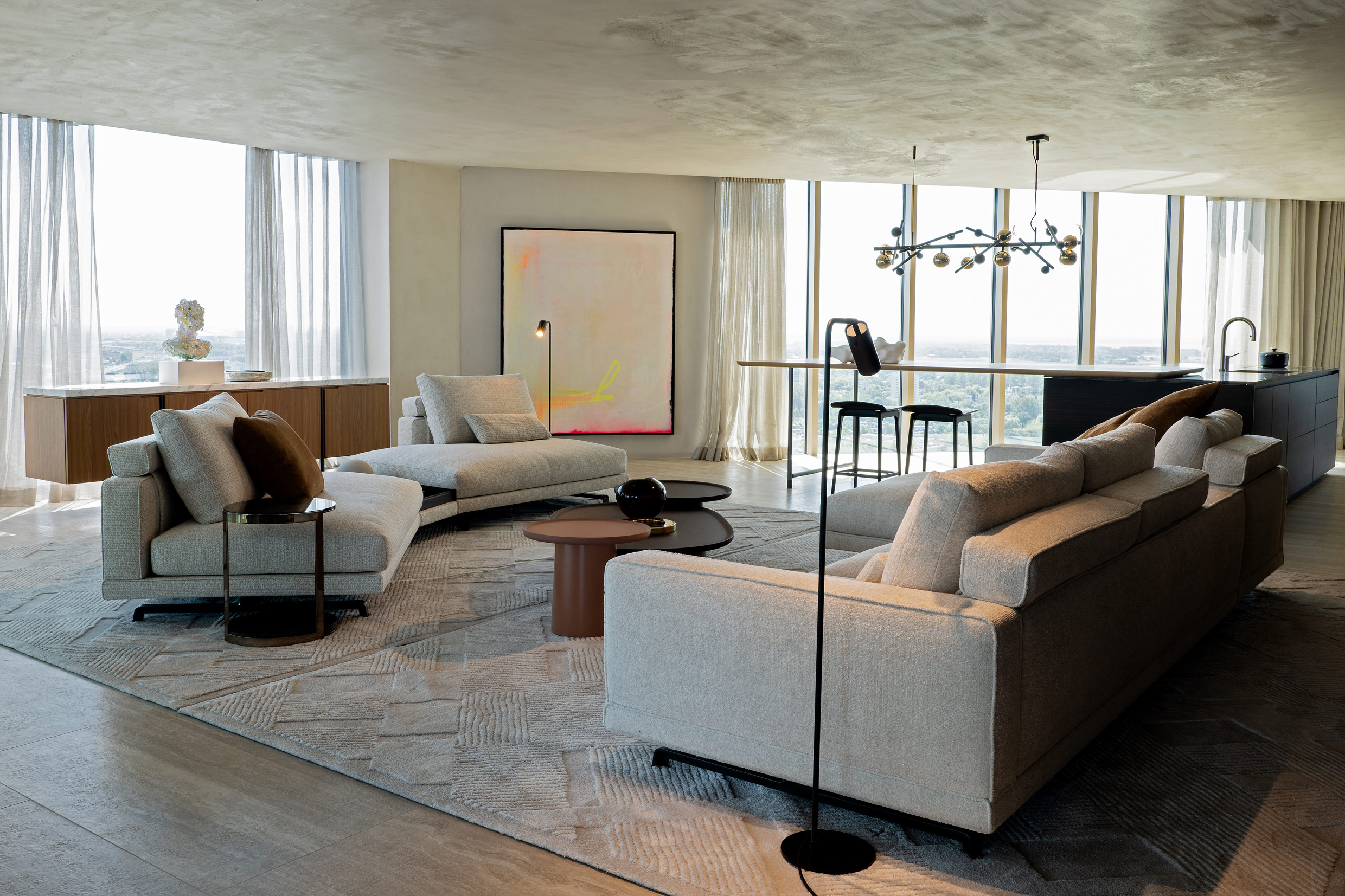 The lounge is completed by two more pairs of chairs: the iconic Round D.154 and, on the other side of an elegant fireplace, in a cosy corner with a view over Amsterdam’s skyline, two Piccadilly armchairs by Rodolfo Dordoni.