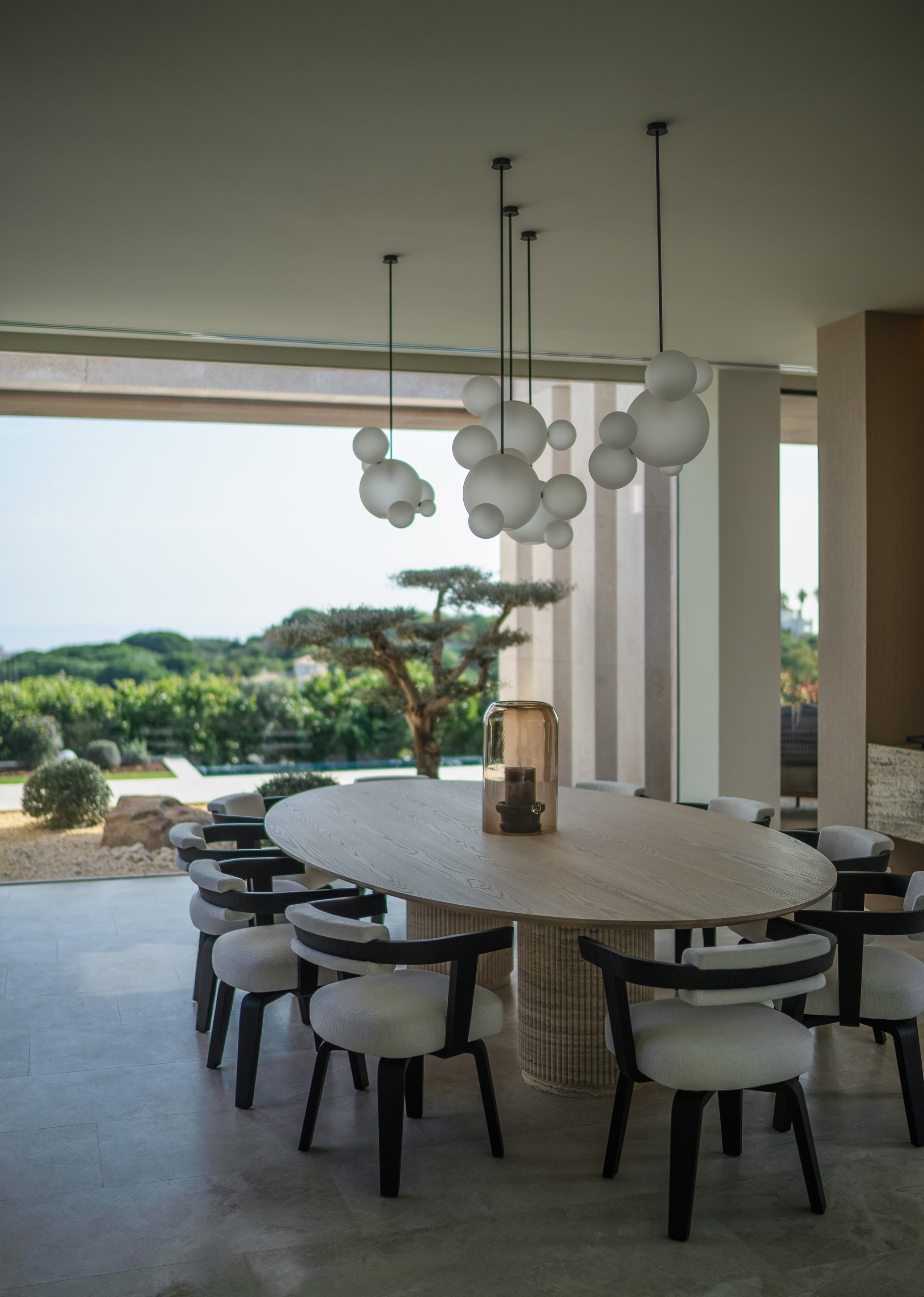 In the adjacent dining room, the sculptural Porta Volta armchair by Herzog & de Meuron adds a contemporary touch. A second living area features the Surf sofa and side table by Yabu Pushelberg, paired with the iconic D.151.4 armchair by Gio Ponti, emphasizing the home’s blend of modern and classic design elements. On the expansive living room terrace, the Sway outdoor sofa and coffee tables by Yabu Pushelberg provide an elegant outdoor retreat, while the Cobea outdoor dining chairs by Vincent Van Duysen grace the dining room terrace, offering a perfect setting for alfresco meals.