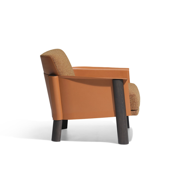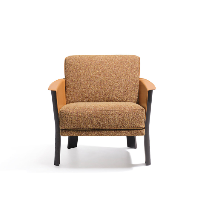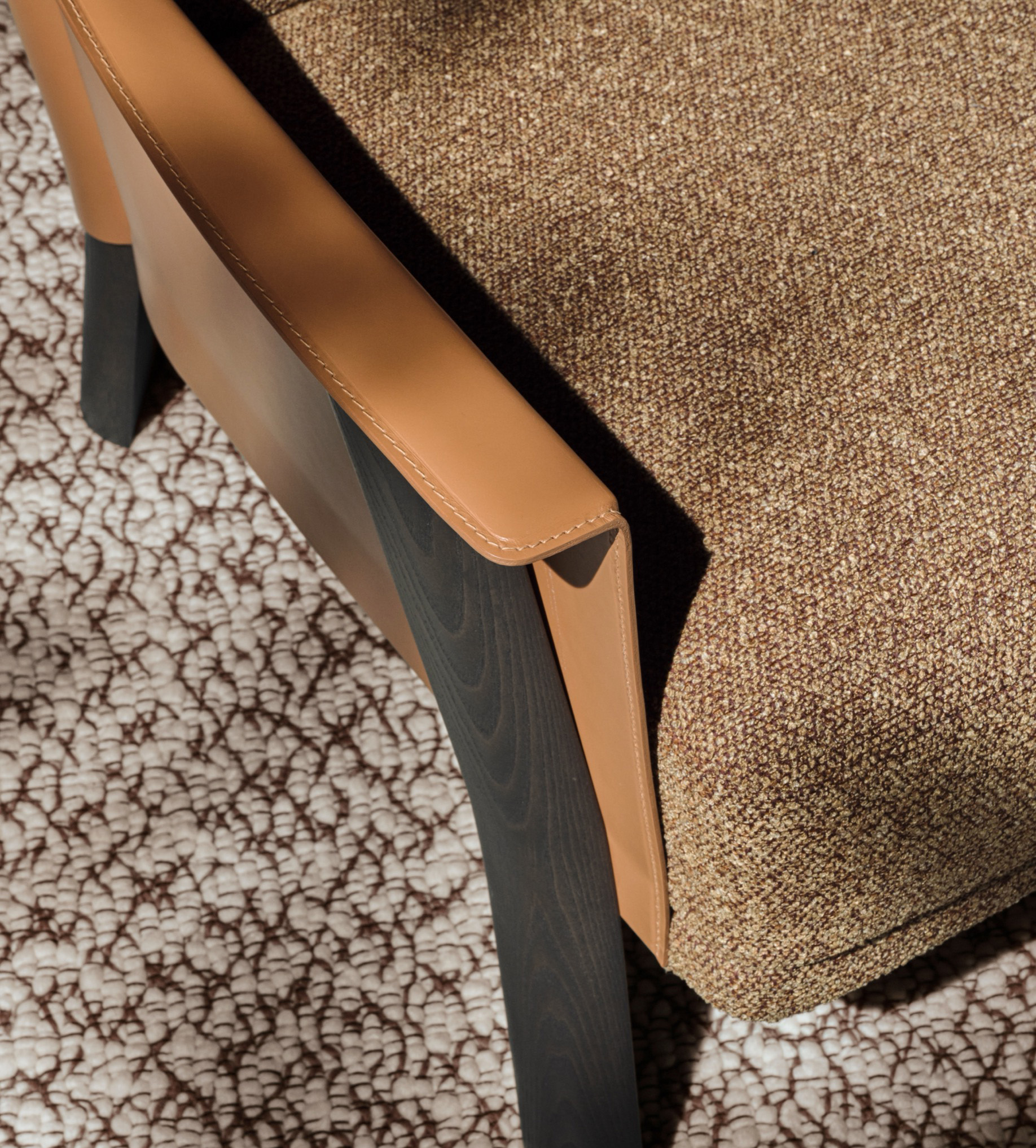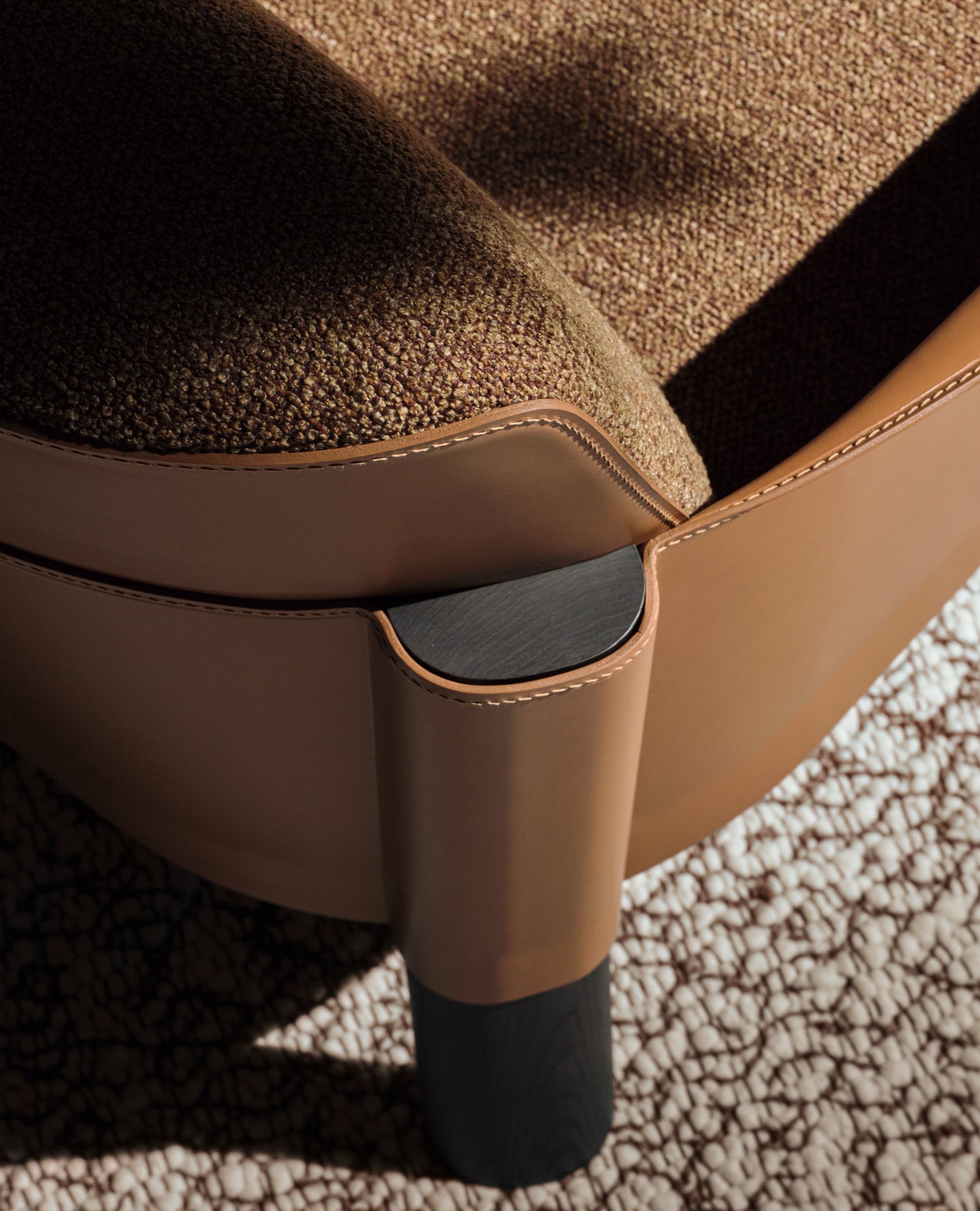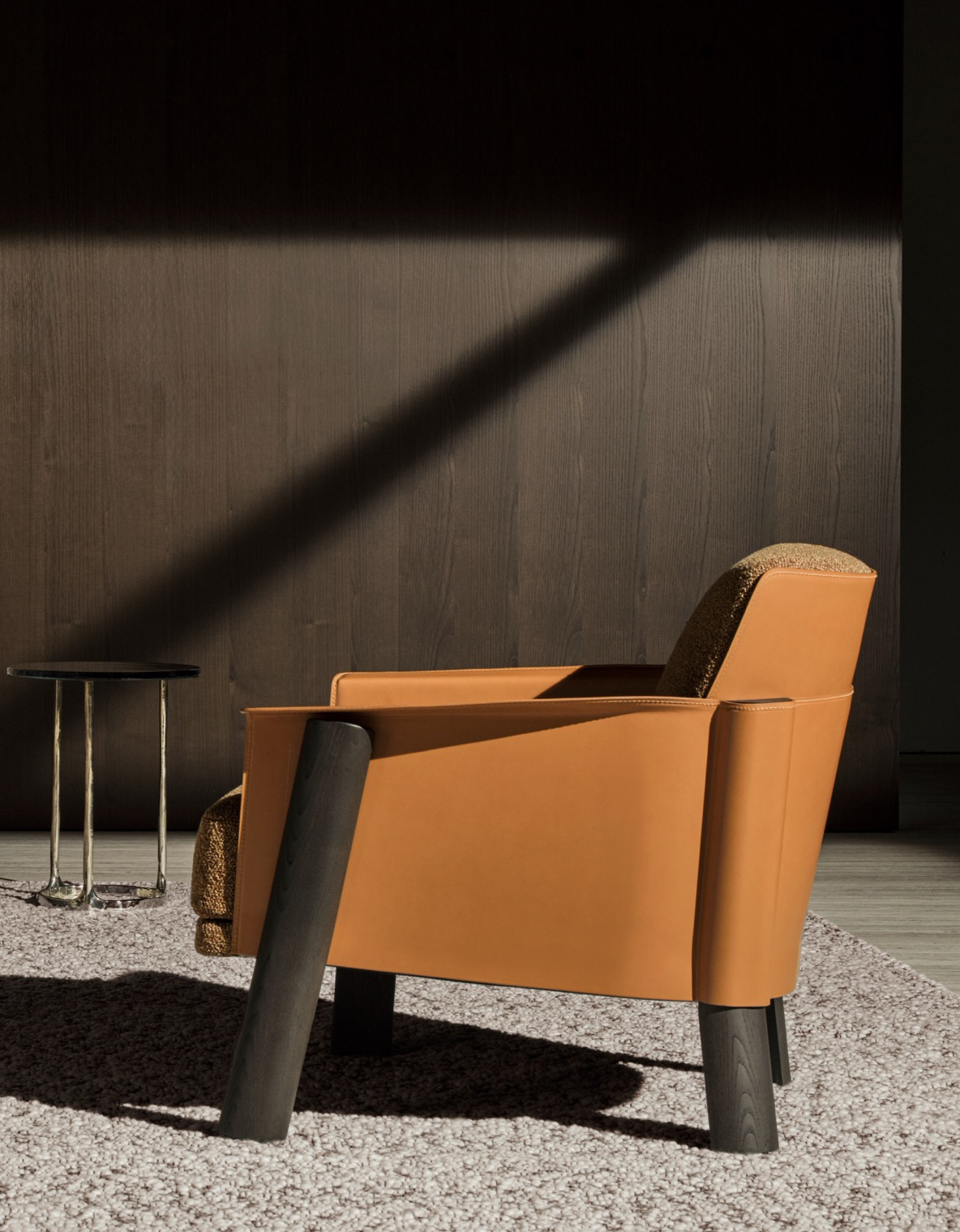 El sillón Armand de Christophe Delcourt destaca por su equilibrio preciso equilibrio entre una tapicería refinada, una estructura sólida y una artesanía experta. Su forma se articula en torno a una esbelta estructura metálica que envuelve el respaldo y se extiende hasta abarcar toda la pieza, confiriéndole un perfil compacto y una construcción claramente definida.