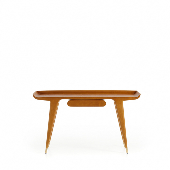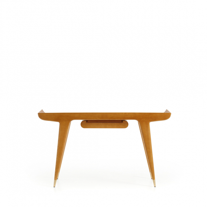 El escritorio se caracteriza por el tablero con terminales curvados, que se parece al ala de un avión, y por el pequeño cajón de abajo con frente redondeado – una verdadera novedad, que se convertirá en signo distintivo de muchas producciones de Ponti de los años siguientes.