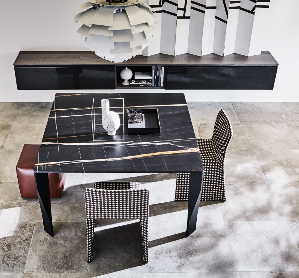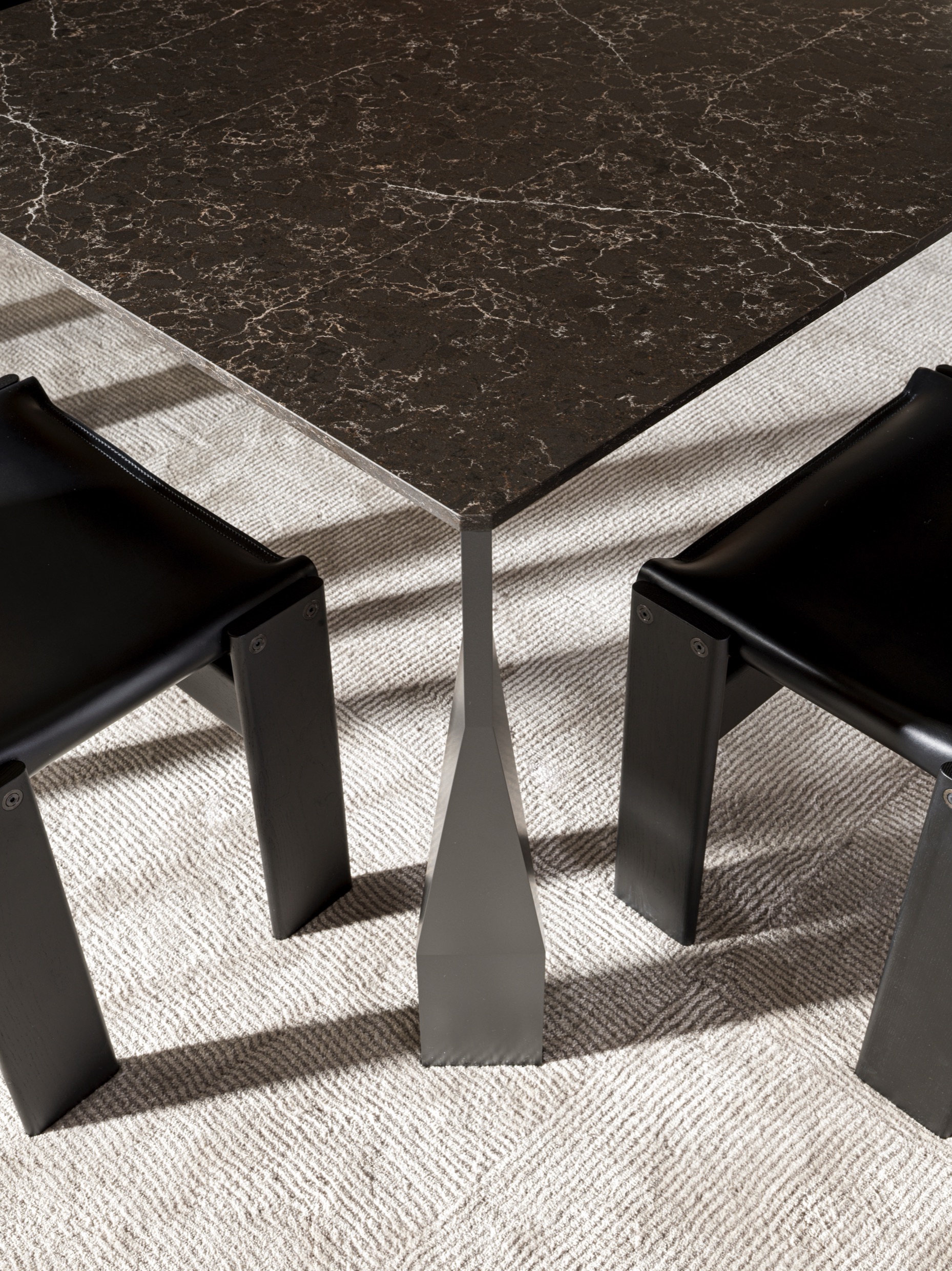 Série de tables carrées ou rectangulaires, au piétement plié et enveloppé comme un origami délicat. Un élément savamment composé d'une tôle légère en aluminium pliée et d'une âme composée d'inserts d'aluminium et polyuréthane expansé pour garantir plus de solidité. Les plateaux en verre ou en marbre s'harmonisent à des structures de support en aluminium poli, laqué mat ou laqué brillant. Diamond a remporté le Red Dot design award Best of the best 2005.
