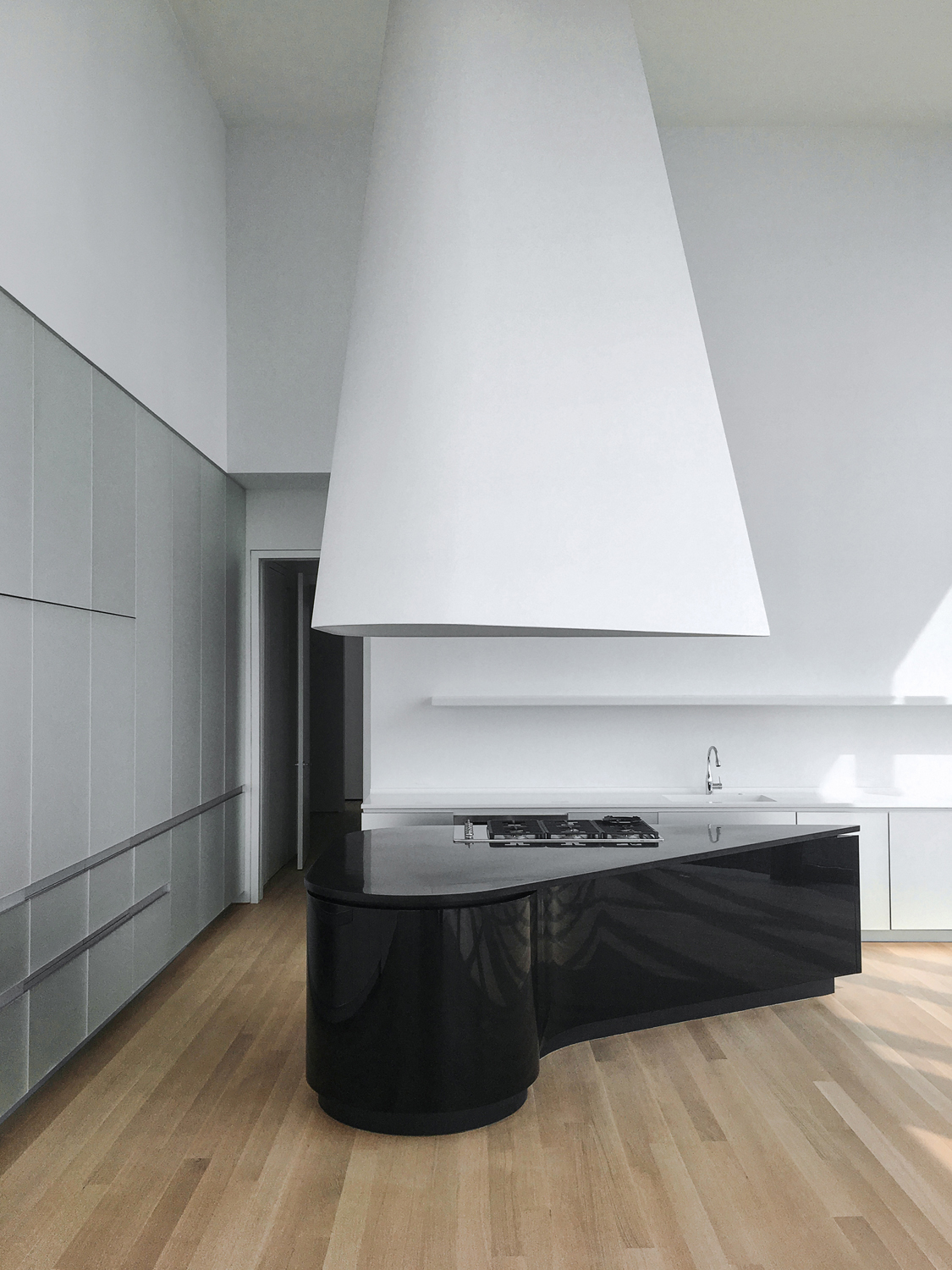 The remarkable building at 56 Leonard Street, developed by the Alexico Group, comprises 146 residences including 10 penthouses reaching skywards. The custom made Dada kitchens and bathrooms designed by Herzog & de Meuron, are inspired by the shape of the sculptural structure of the building. Dada – specializing in kitchens under the Molteni Group –produced 146 bespoke kitchens prominently featuring rounded black lacquer islands with ingenious sliding granite tops. The dark islands are in contrast to glossy acid etched mirror glass cabinets which reinforce the context of Herzog & de Meuron’s linear exterior structure.