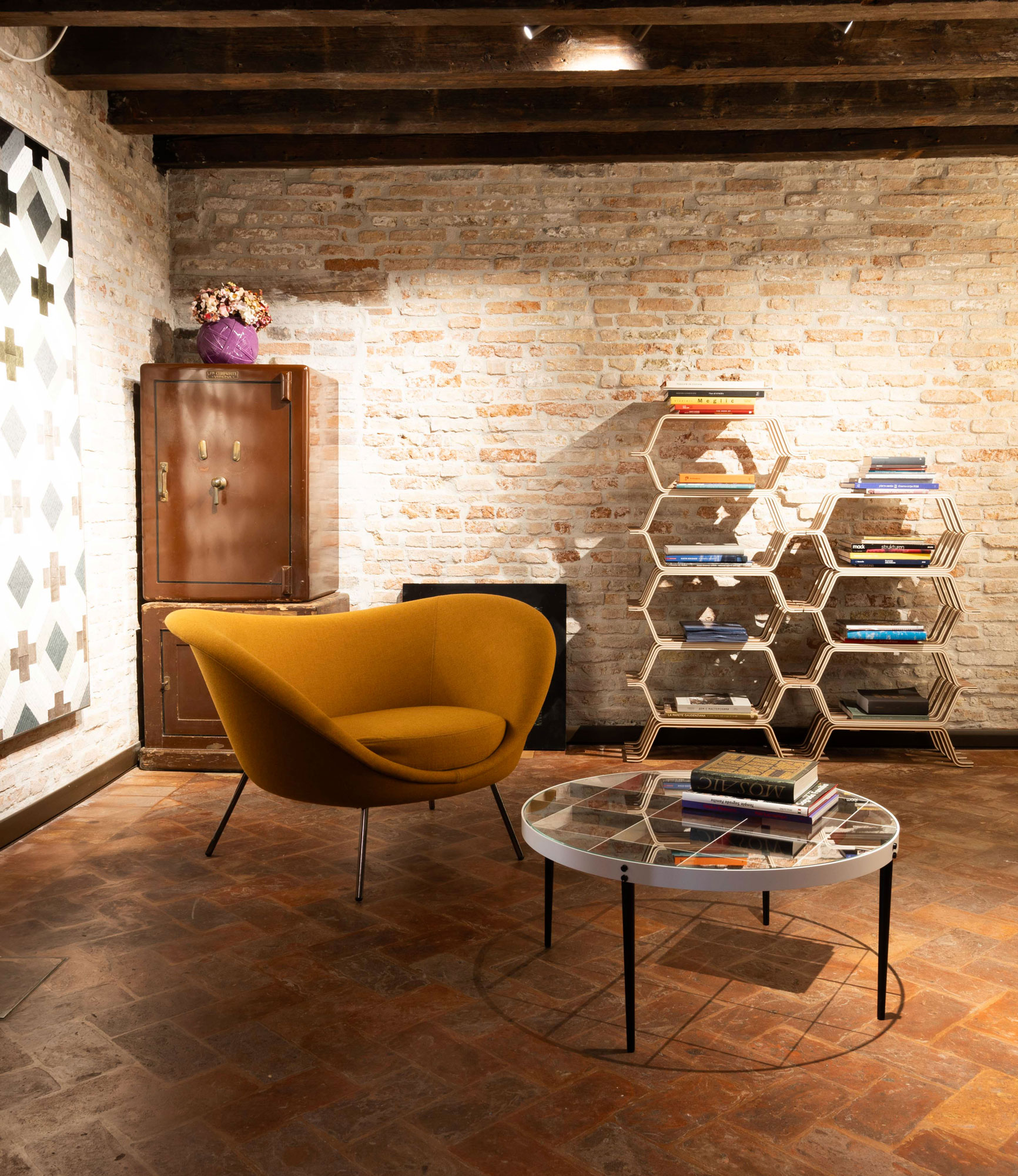 Another exclusive Gio Ponti design, the D.270.2 chair, took center stage in the Color Library, where Orsoni Venezia catalogs all the colors of the world, preserving them in a wooden library with expansive shelves akin to safeguarding precious books, ensuring that not a single hue is lost.