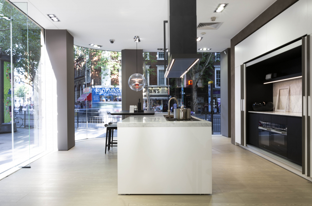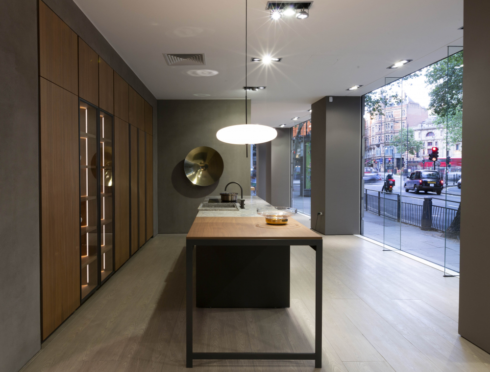 The 330 square metre space – surrounded by 37 linear metres of full height windows and a breakout area – will feature six different kitchens in a variety of finishes. These include the imposing VVD kitchen hewn from Ceppo stone and walnut, designed by Vincent Van Duysen; the aesthetically sleek Hi-Line6 in white Matt Lacquer and Carrara marble by Ferruccio Laviani; the timeless Trim and Vela kitchens by Dante Bonuccelli and the sophisticated Prime Kitchen.