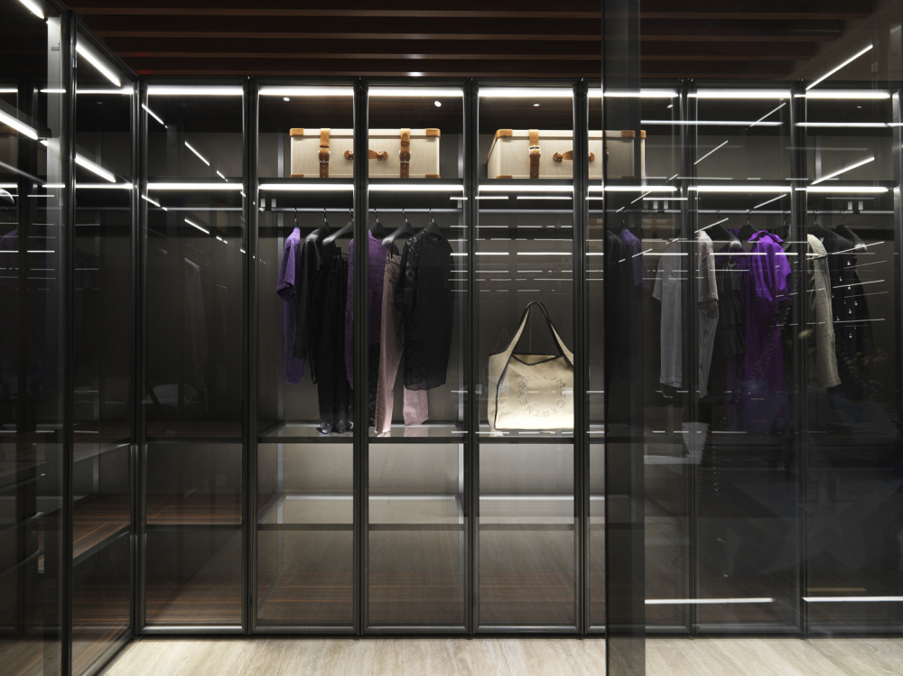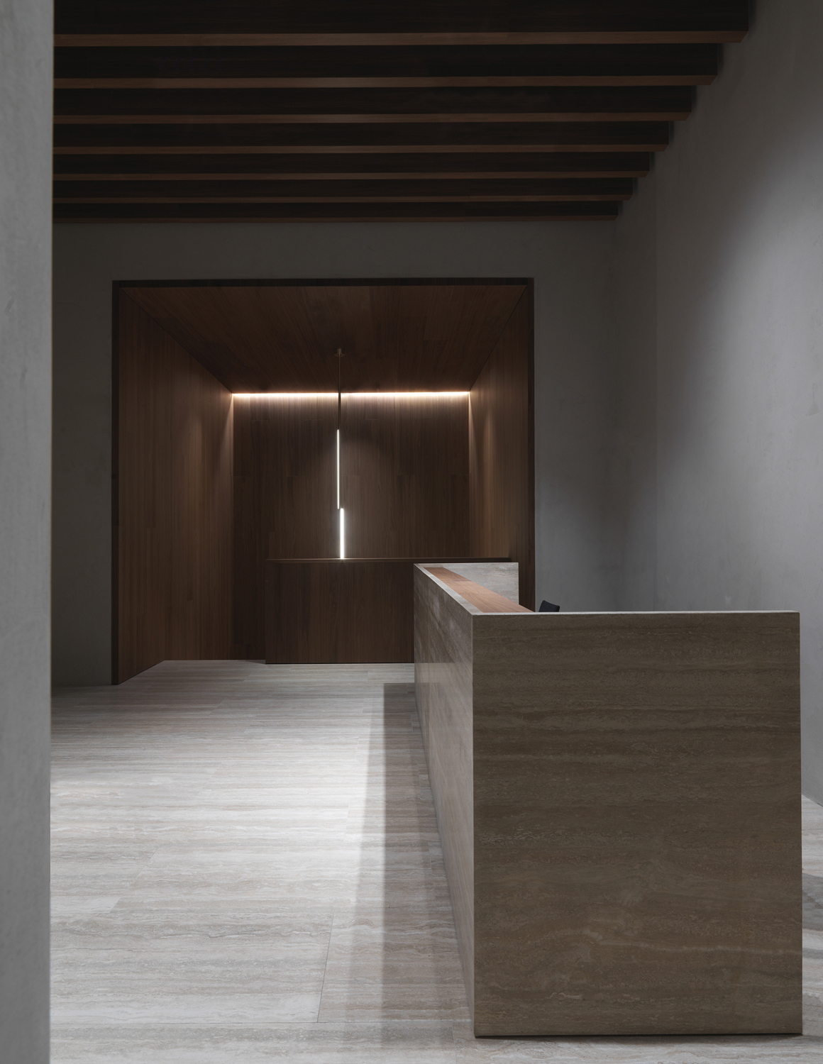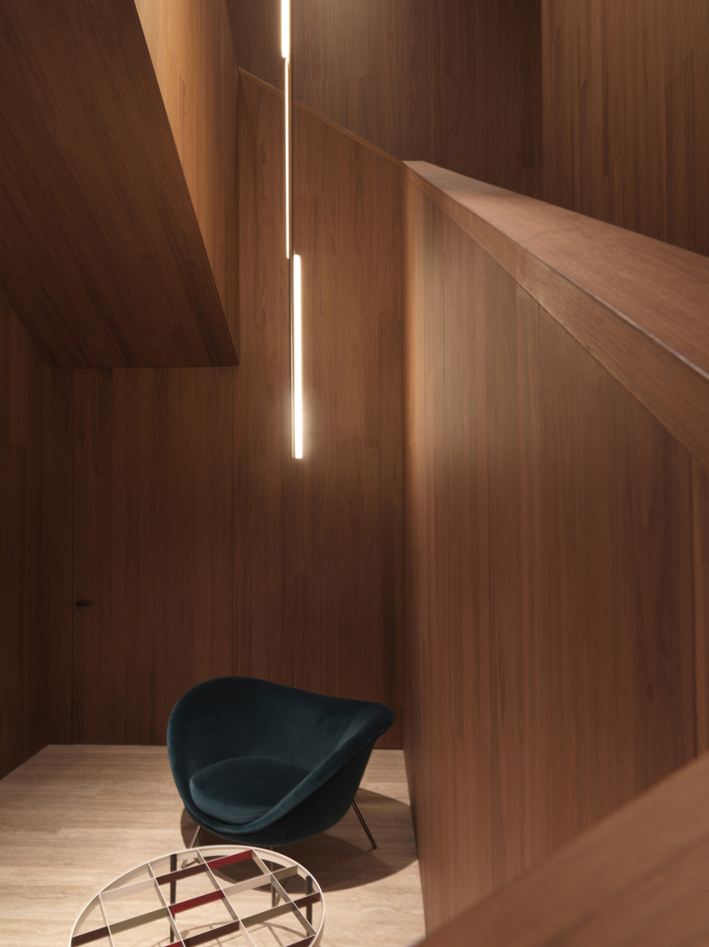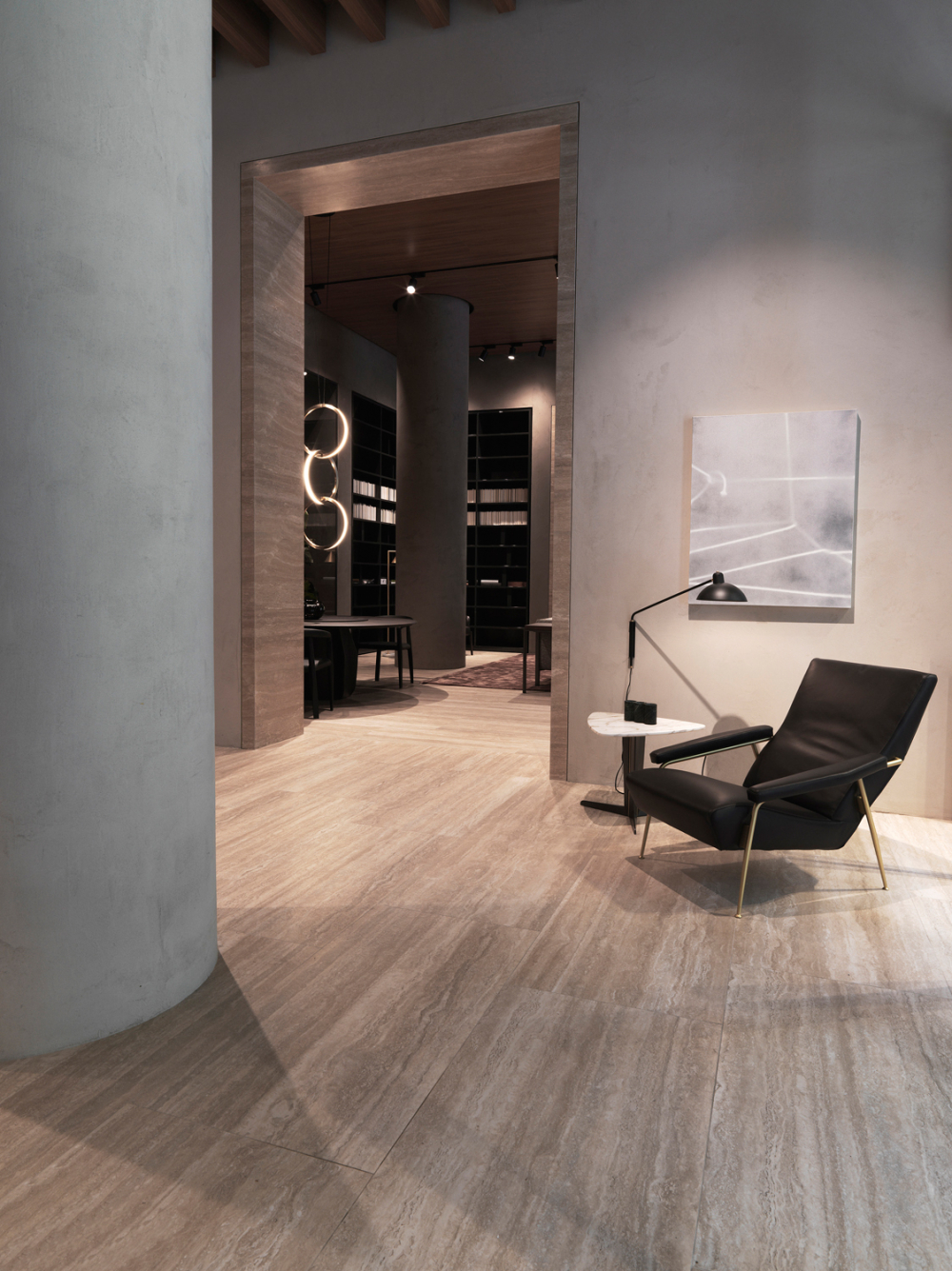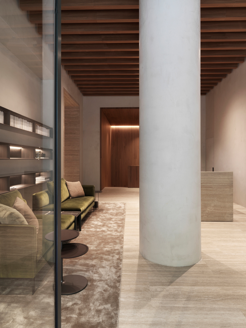 Each space provides a stunning backdrop for items instantly recognizable as Vincent Van Duysen’s signature designs. A particularly breath-taking entrance, built on an inner door open onto two floor-to-ceiling glass screens. A magnificent iconic staircase, the walnut cladding of which is in tune with the travertino marble steps. The same marble used for the portals. The floor-to-ceiling wooden entrance door to the Flagship Store – already part of the brand’s distinctive style – has been re-proposed in a version proportionate to the scale of the building.