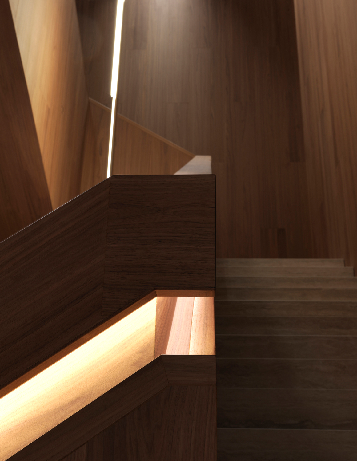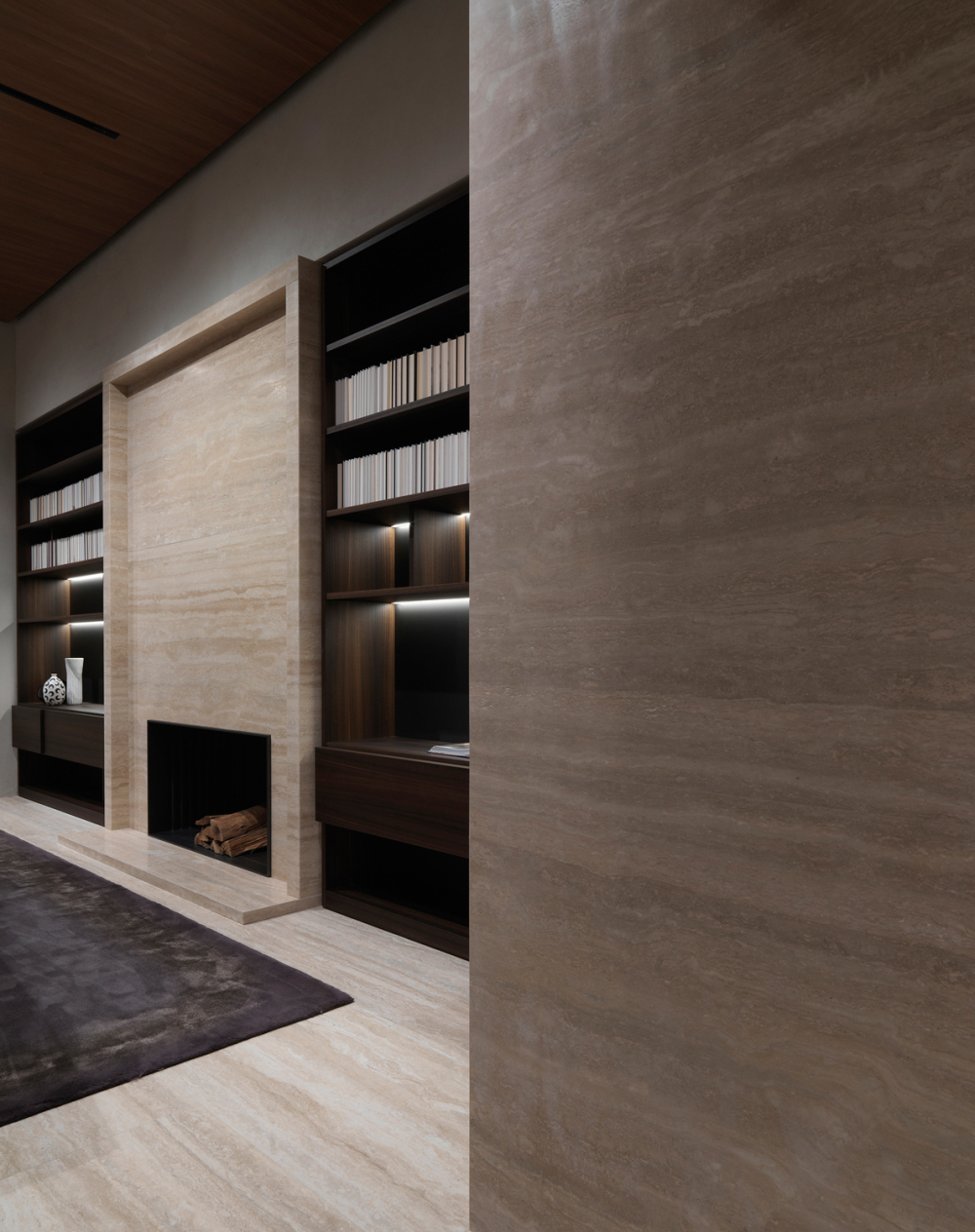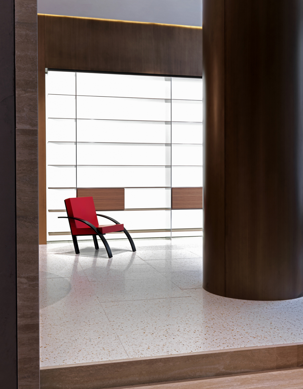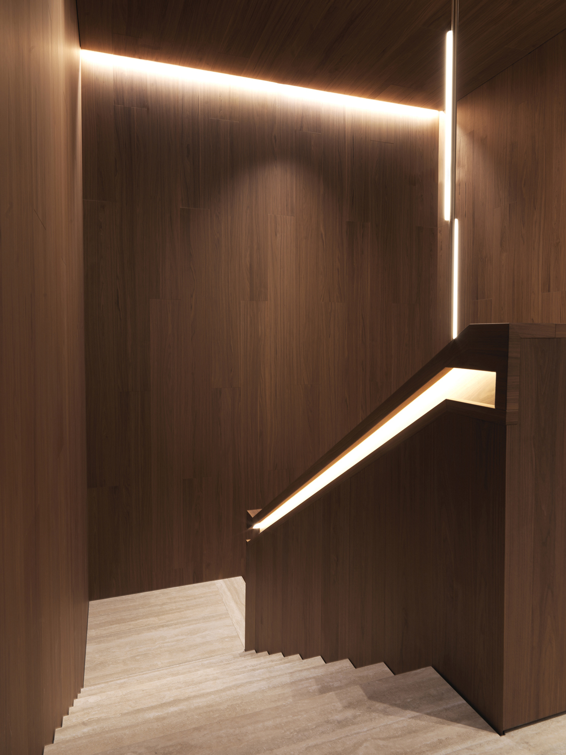 “A project that brings Italian style and elegance into a classic New York building. Style and elegance that are reflected in close attention to the materials, details and craftsmanship of the portals, the travertino floor and the magnificent walnut staircase.”