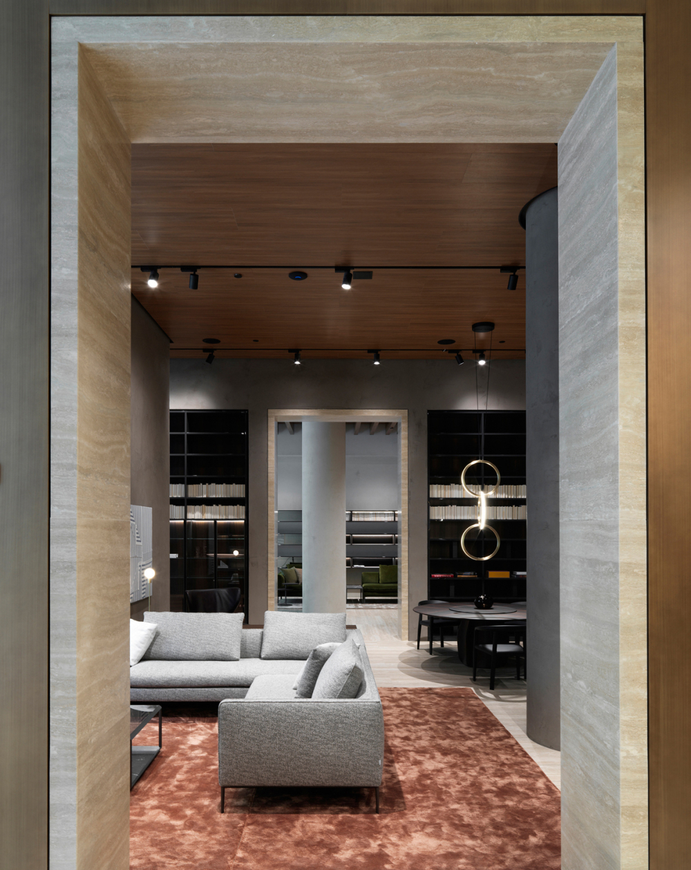 The concept defining this space – measuring over 12,500 square feet with four shop windows – is played out over two levels linked by a unique staircase. The architectural design is faithful to the original features of the building, has kept its volumes and preserved the perception of the lofty ceilings. The separating walls subdivide generous volumes, interspersed by tall travertino marble-clad portals.