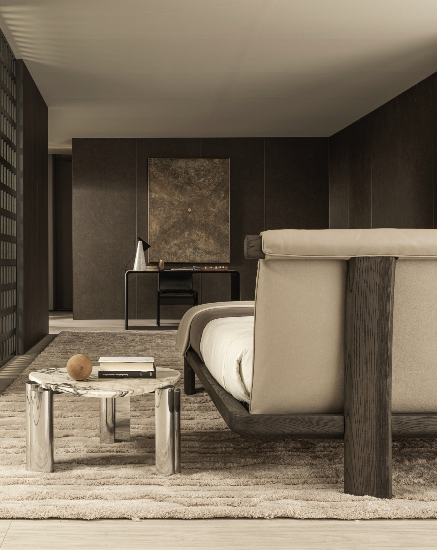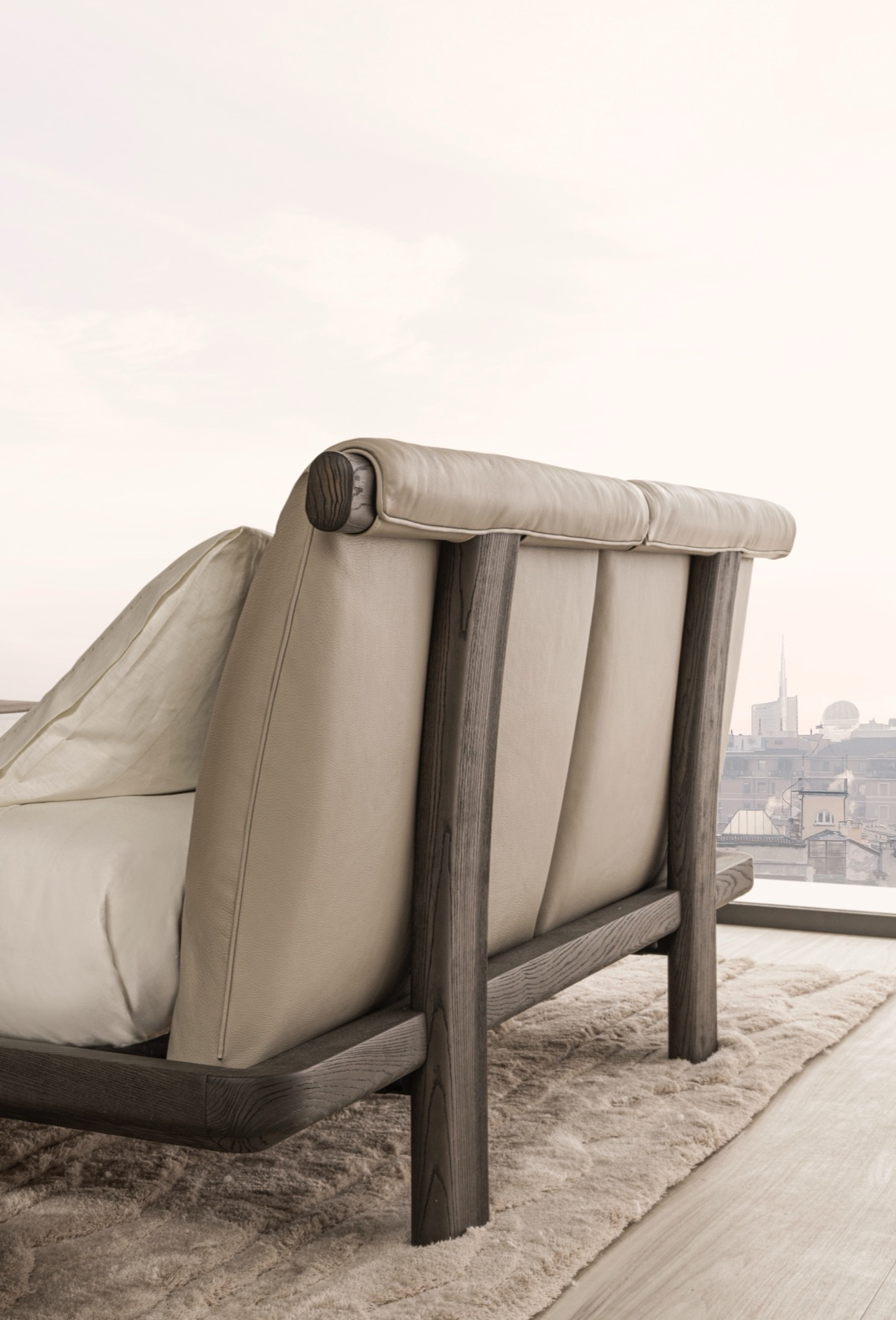 Le lit Tibeau de GamFratesi célèbre le bois de manière remarquable, en associant des lignes architecturales audacieuses au savoir-faire raffiné qui caractérise Molteni&C. Son design s'inspire d'influences historiques, alliant force et raffinement, et lui confère une présence imposante.
