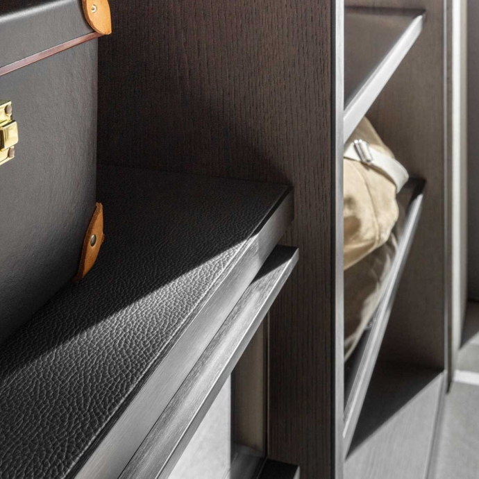 AIRCUB ® – a Molteni&C exclusive – is an IOT device easily manageable from your smartphone with a dedicated APP. The air purification and perfuming system, that can be installed on every wardrobe systems, works by ionizing and ozonizing wardrobe interiors, thereby removing up to 99% of agents harmful to health, while releasing delicate fragrances.