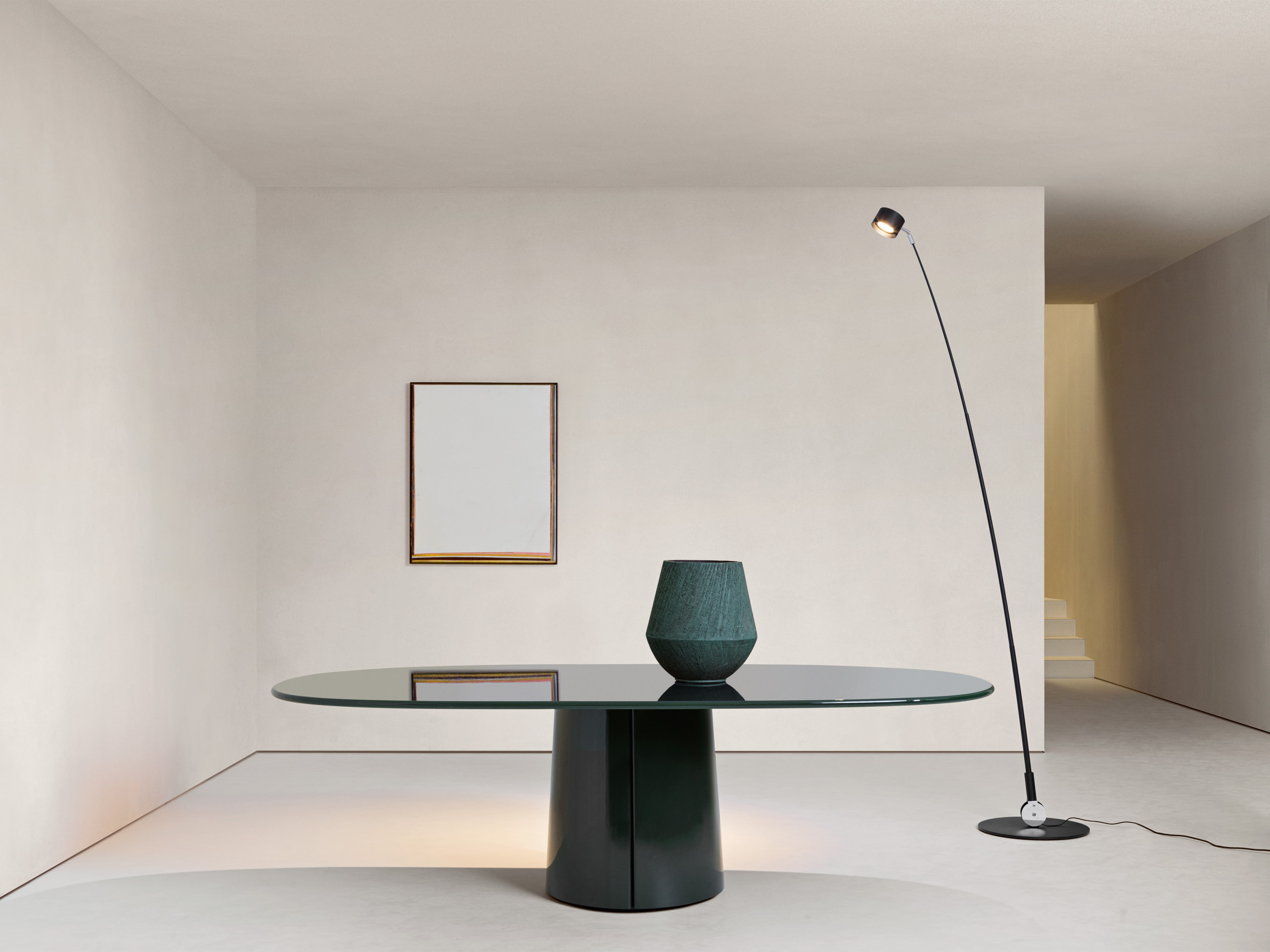 Vincent Van Duysen riconfigura il concetto di dining, donandole personalità con una nuova proposta di tavolo, disponibile in due configurazioni. Il tavolo, dotato di un piedistallo centrale dalla forma cilindrica e conica solcata in due nella verticale alla base, è disponibile in versione tonda o ovale rastremate sul bordo, adattandosi perfettamente ad ogni tipologia di ambiente. La base conica è realizzata grazie ad uno stampo per compensato curvo; l’accostamento delle due metà stampate disegna una fuga centrale aperta, conferendo alla base una personalità del tutto inaspettata.
