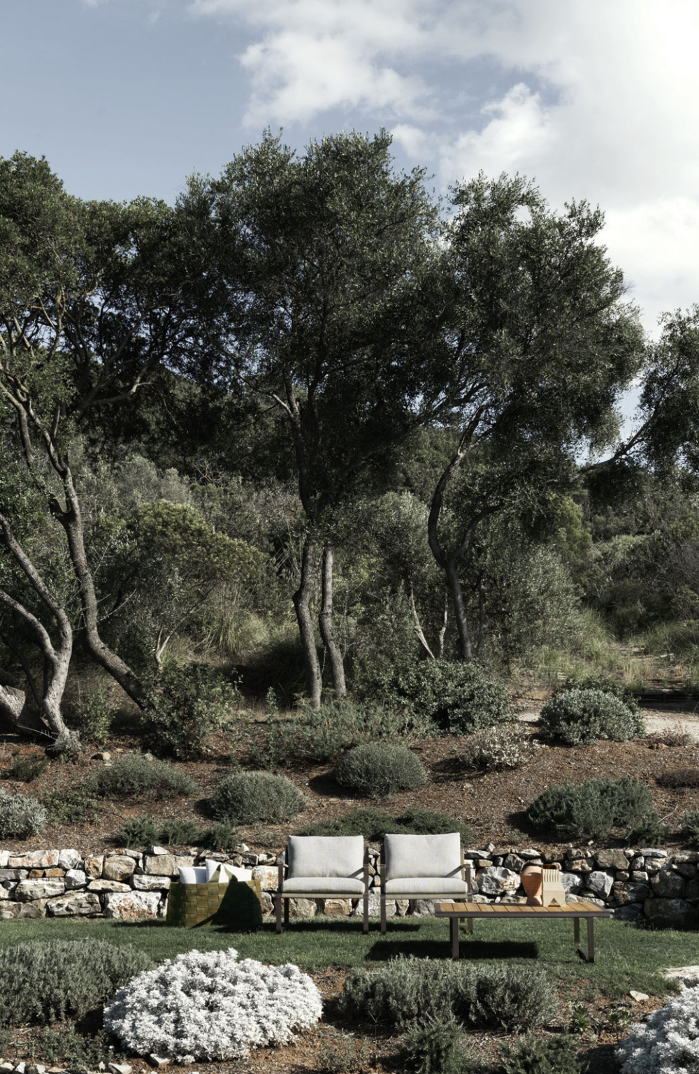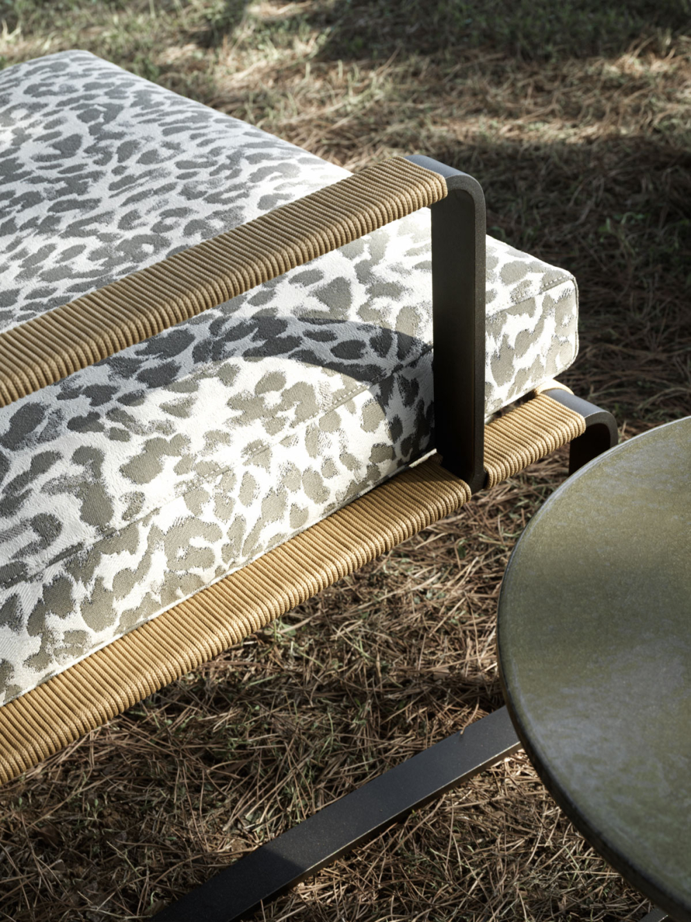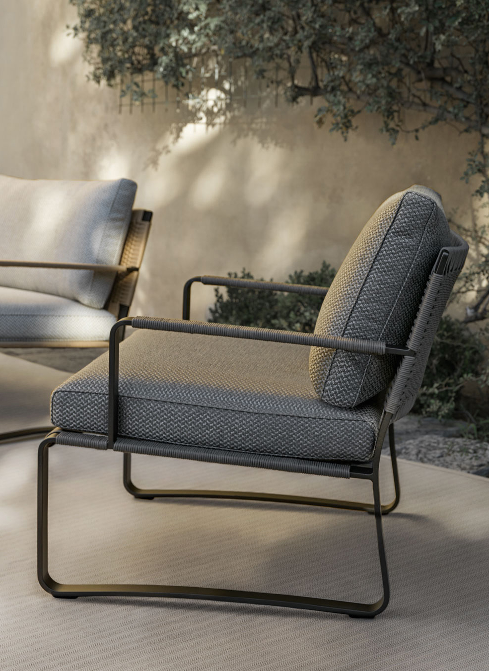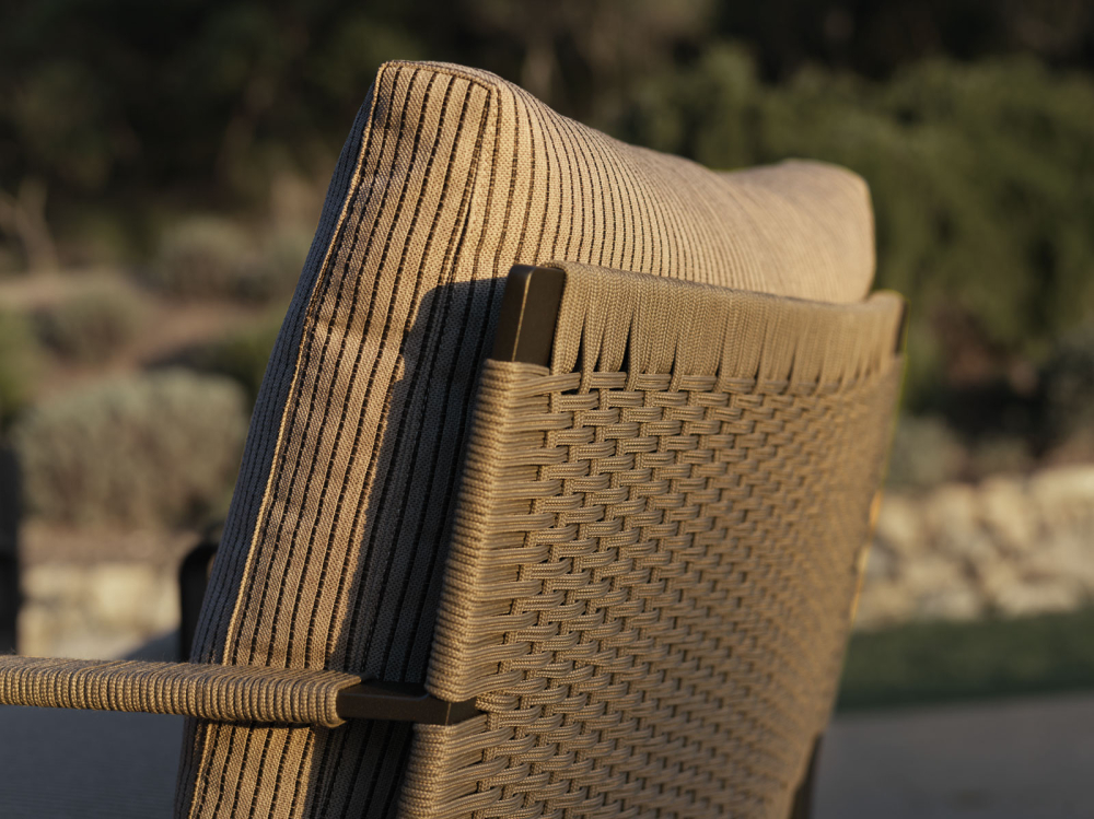Sulla struttura metallica è intrecciato un fitto rivestimento in corda in polipropilene abilmente realizzato artigianalmente, nei colori antracite, verde oliva e giallo deserto. Oltre alla poltrona e le sedie, la famiglia comprende un ampio abaco di prodotti, come il tavolo da pranzo accompagnato dalle sue sedute, lo sgabello, il comodo lettino, i tavolini e la panca.