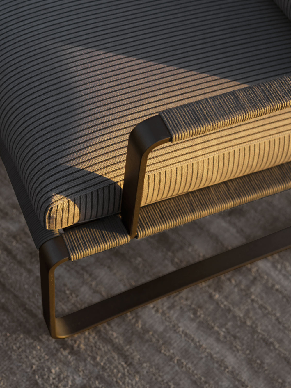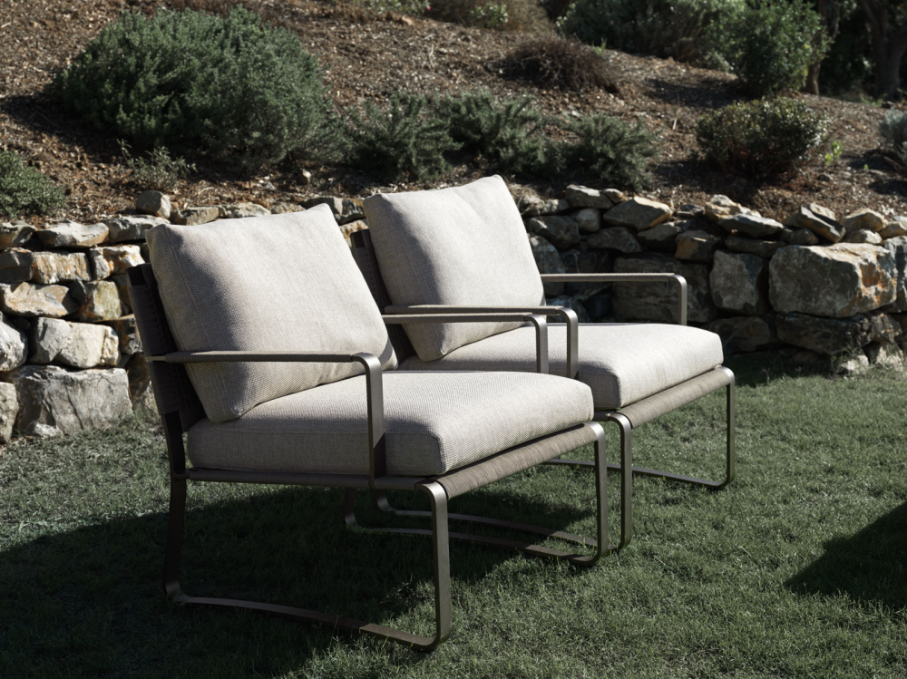 Nelle sedute è ripreso, in un ritmo più andante, il tema della fascia di alluminio verniciato color brunito, fil rouge della Collezione che, in una corsa senza interruzioni, viene a creare la struttura. Il piegarsi della fascia disegna la forma dello schienale e delle basi a slitta, con profili dinamici, agili e senza angoli.