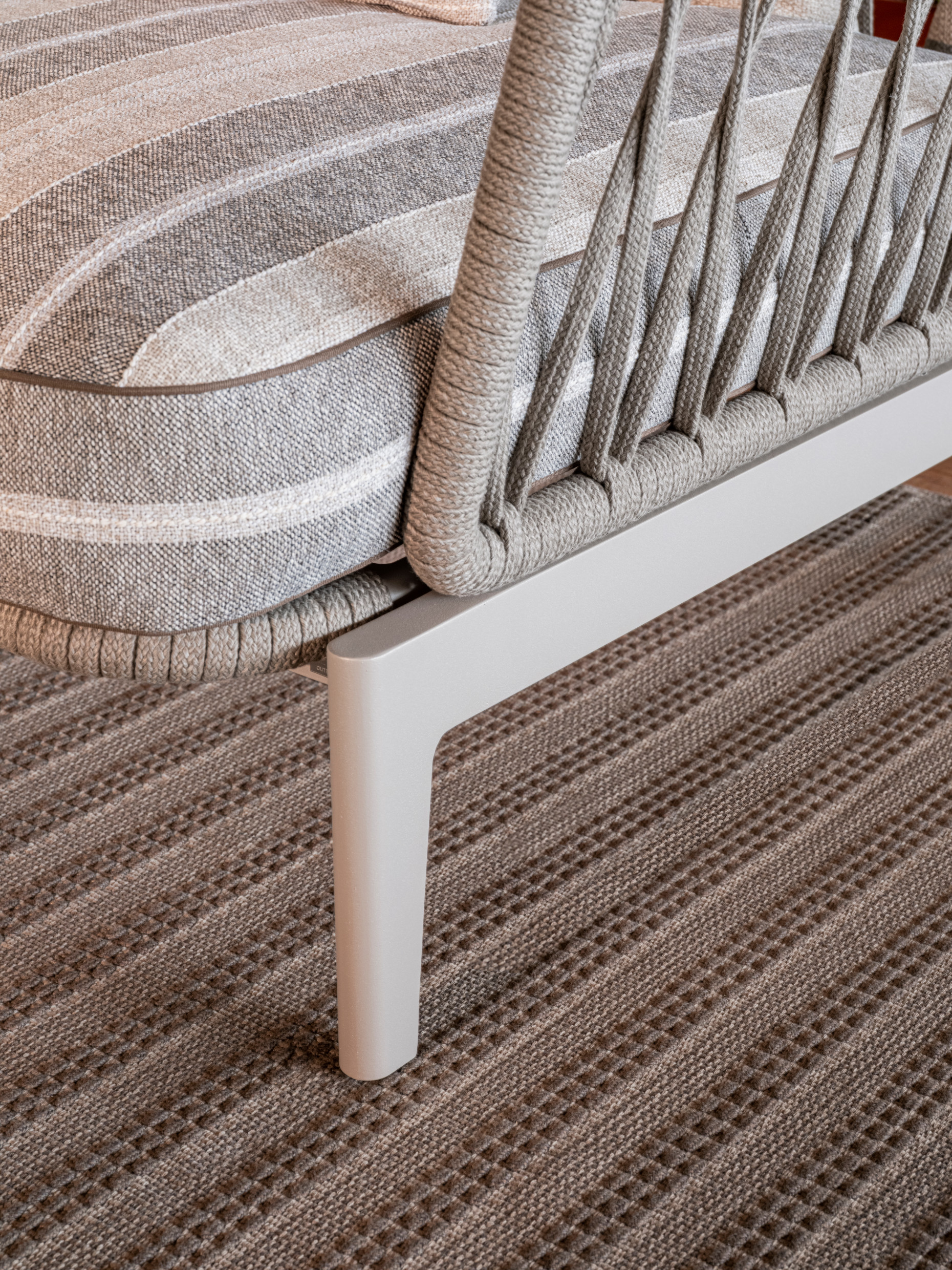 La base in alluminio verniciato a polvere definisce una struttura leggera ma robusta, progettata per resistere alle condizioni esterne senza rinunciare all’eleganza. La geometria distintiva del telaio mette in risalto le proporzioni equilibrate della poltrona, conferendole una presenza al tempo stesso sobria e solida.