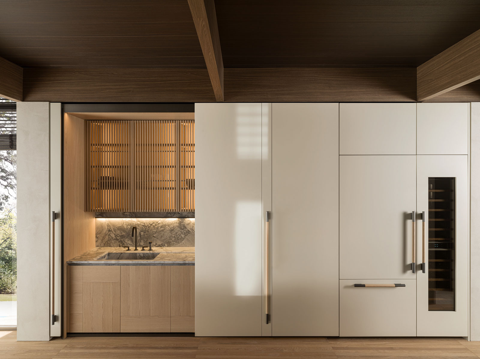 L’anta battente è costituita da un telaio con doga in finitura essenza ed un vetro extrachiaro trasparente.