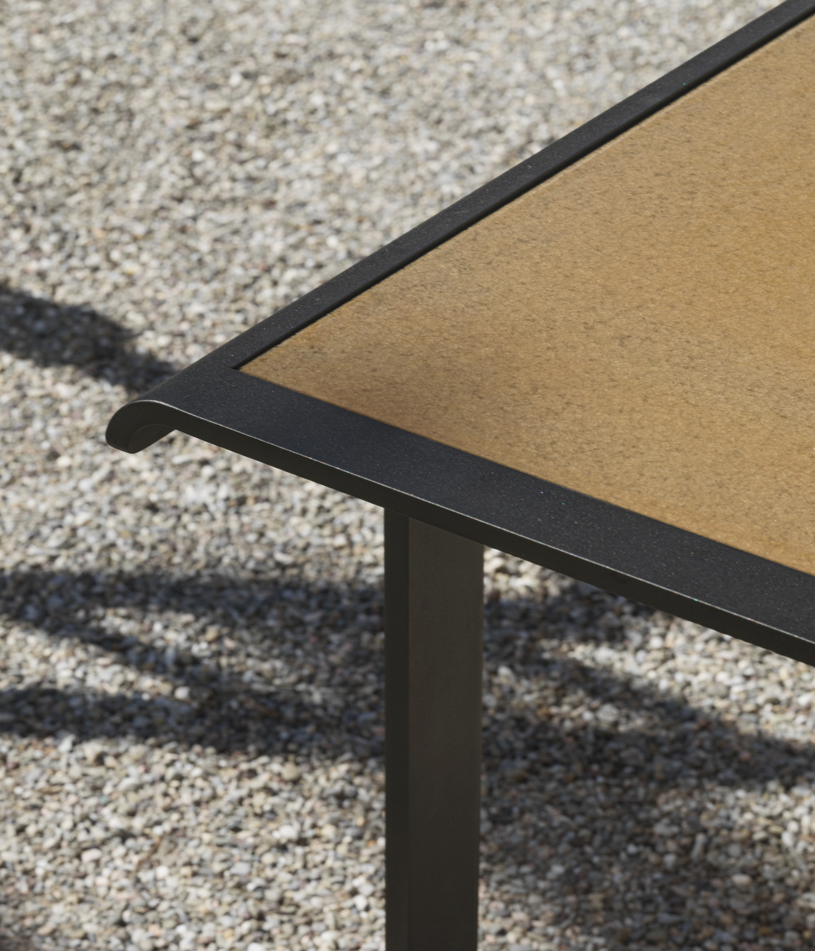 丸みをおびて角のない輪郭で、ブルニート塗装を施したアルミニウムバンドのモチーフを取りいれた構造です。Timeout コレクションに共通のそり形の脚部は、同じ金属バンドの流れるような動きから生みだされ、ここでは、天板と重ねて自然な継続性を表現しています。