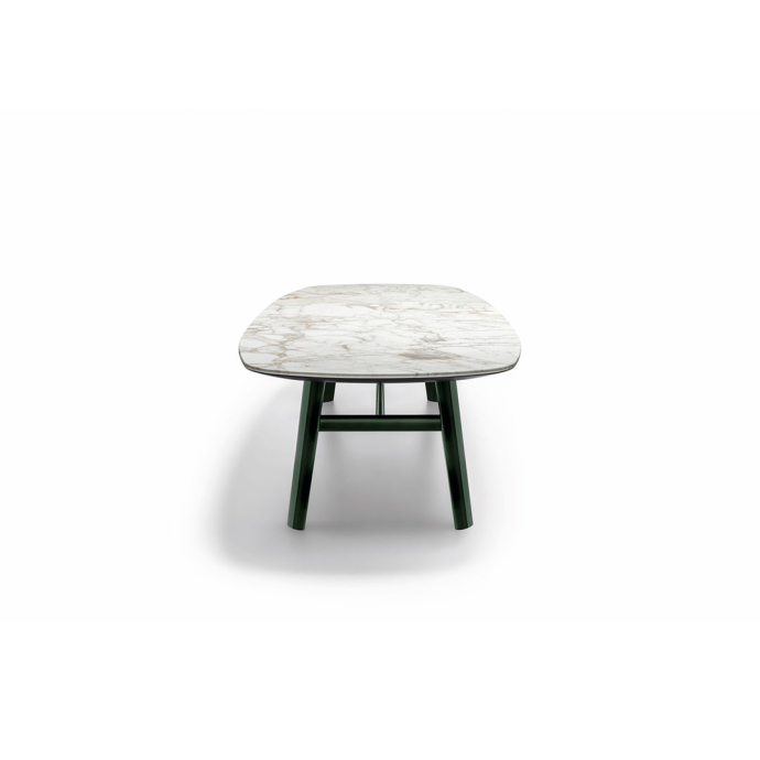 テーブルは、H字型の梁で接続された4本の光沢のある脚部まで、緩やかな下向きのカーブを持った、丸いエッジのトップで構成されています。その洗練されたテーブルトップは、リンバまたはコーヒーオーク材、またはエンペラドール、カラカッタ、またはサハラノワール大理石から選択でき、マットまたは光沢のあるポリエステル仕上げが施されています。テーブルトップベースは、無煙炭の色調の柔らかなラインで構成された1つの貝殻に似て、エレガントでモダンな外観になっています。脚部は、バーガンディ、パイングリーン、ブラックニッケルの3つの光沢のあるラッカー仕上げのいずれかから選んでカスタマイズできます。