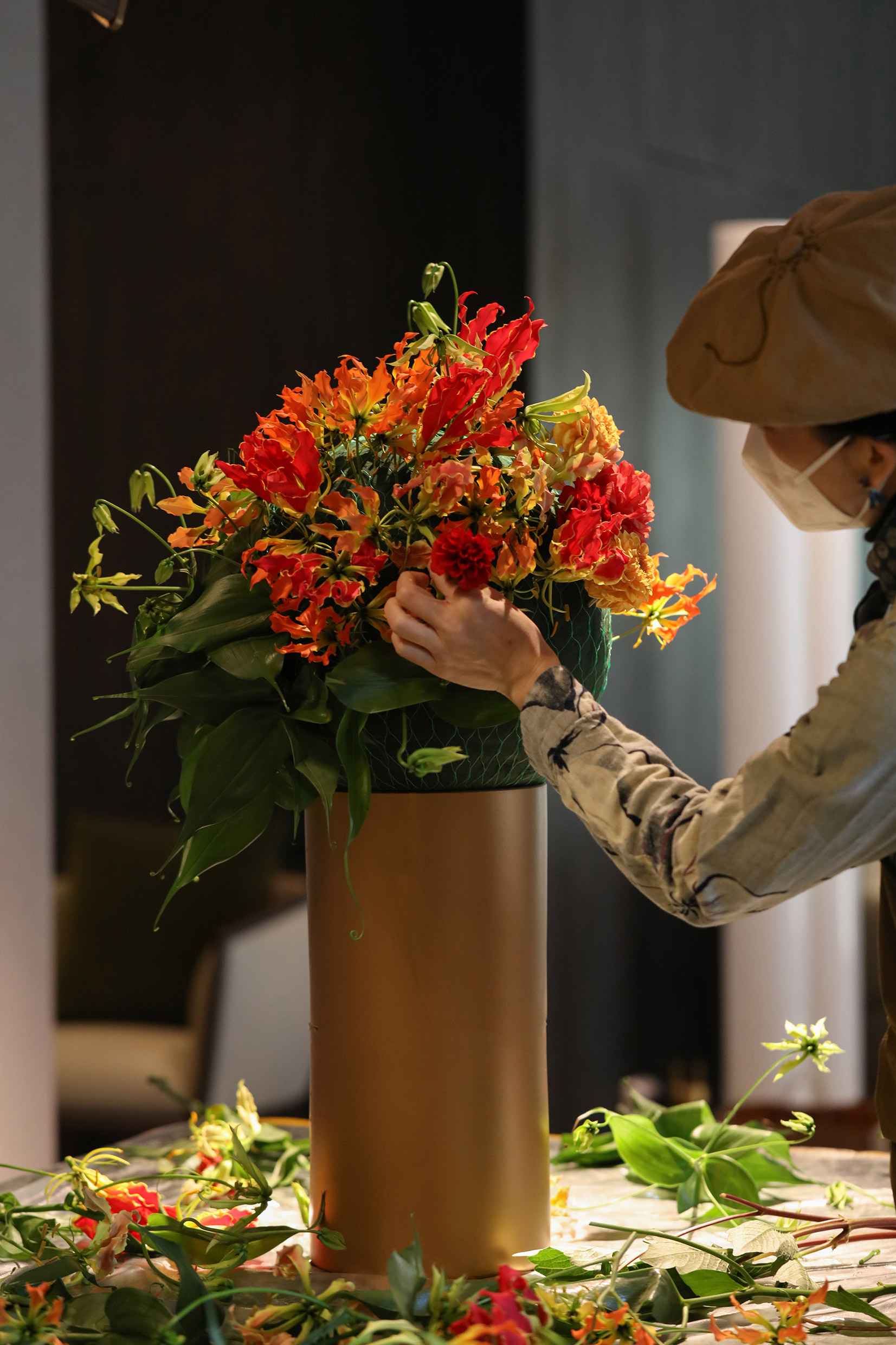 Flowers were not only chosen for their shape and hue, but for their significance in Chinese tradition. A symbol of warmth and joy, the Flame Lily is a very festive flower. Its spackled colors combine with the Chinese Lantern Lily’s (Sandersonia aurantiaca) tiny orange lanterns in a delicate ode to prosperity.