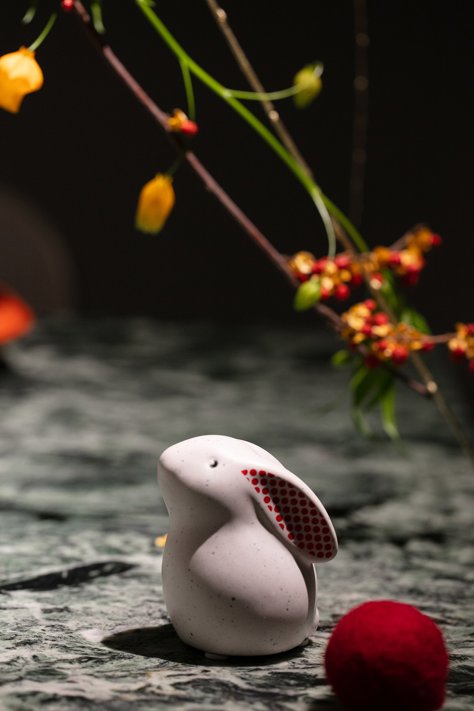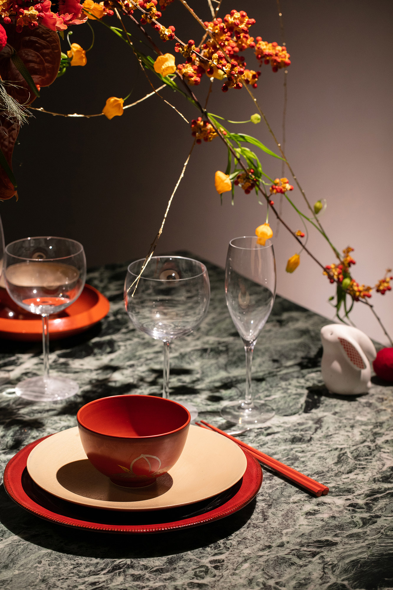 A fluffle of porcelain rabbits hop amongst the place settings, heralding the arrival of the Year of the Rabbit. In a traditional gesture, the table is adorned with a Húlu pumpkin and a golden metal ribbon. The Chinese word “Húlu ” similarly pronounced 'fúlù’, signifies happiness and wealth. The metal ribbon is an interpretation of Chinese knotting, adding yet another festive touch.The table setting is a contemporary expression of Chinese tradition and culture for the most important holiday of the year — a modern reinvention to animate the traditional celebrations. Permeating the décor is the feeling of anticipation to reunite among family and friends.