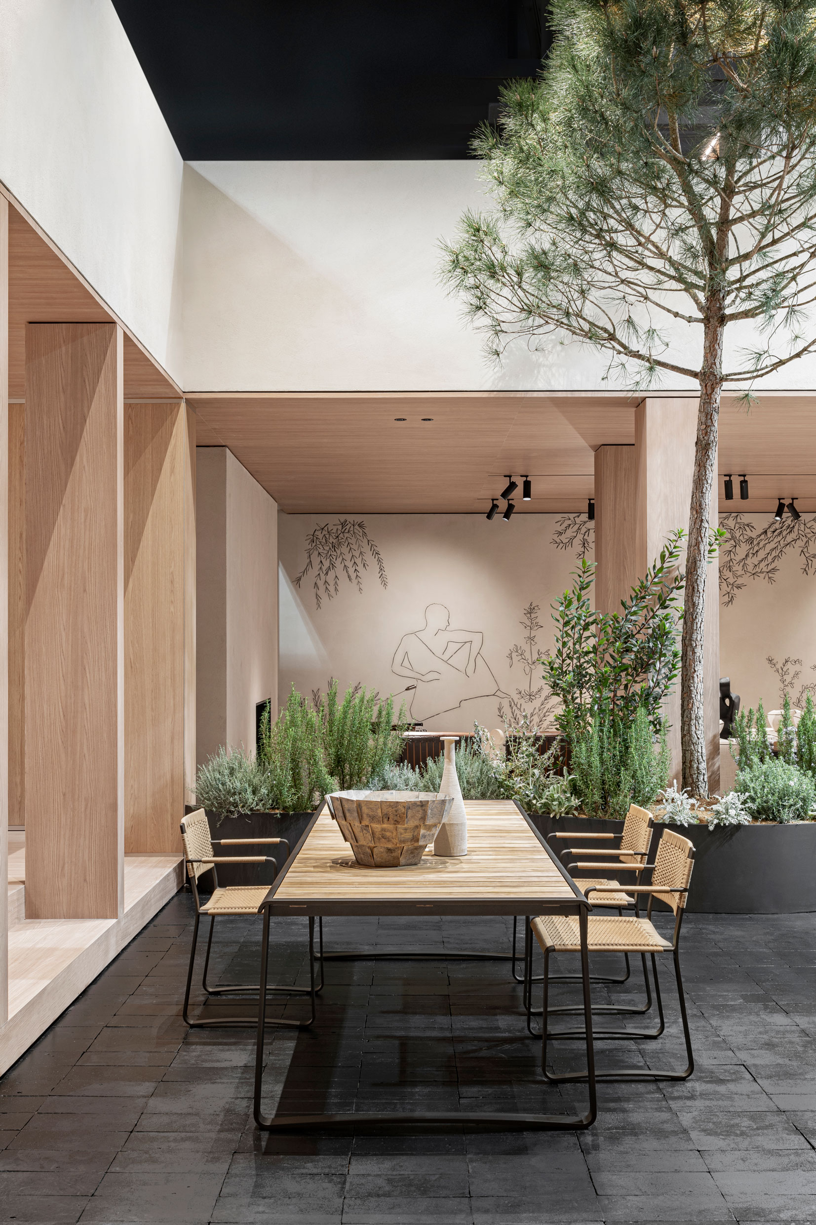 2023年のMolteni&Cコレクションプロジェクトは、Vincent Van Duysenによるクリエイティブ指向により、屋内と屋外、親和性と共有、プライベート空間と公共空間の関係が表現されました。 このプロジェクトは、古代ローマのドムスの家庭内構成に基づいています。したがって、ドムスの中心的な要素は、その覆いのない中庭であり、そこから住宅が、プールに集約された光と水を受け取ります。その他の個室と共用室は中庭を囲むように配置されています。柱で装飾された内部柱廊の玄関(「ペリスタイル」)が庭を囲みます。これは、自然の中でのオティウム(自由な時間)が狙いです。 ベルギー出身のクリエイティブディレクターは、ミラノのPier Giulio Magistrettiによって1933年に設計および建設され、同様に古代と前衛を融合した家からもインスピレーションを得ました。