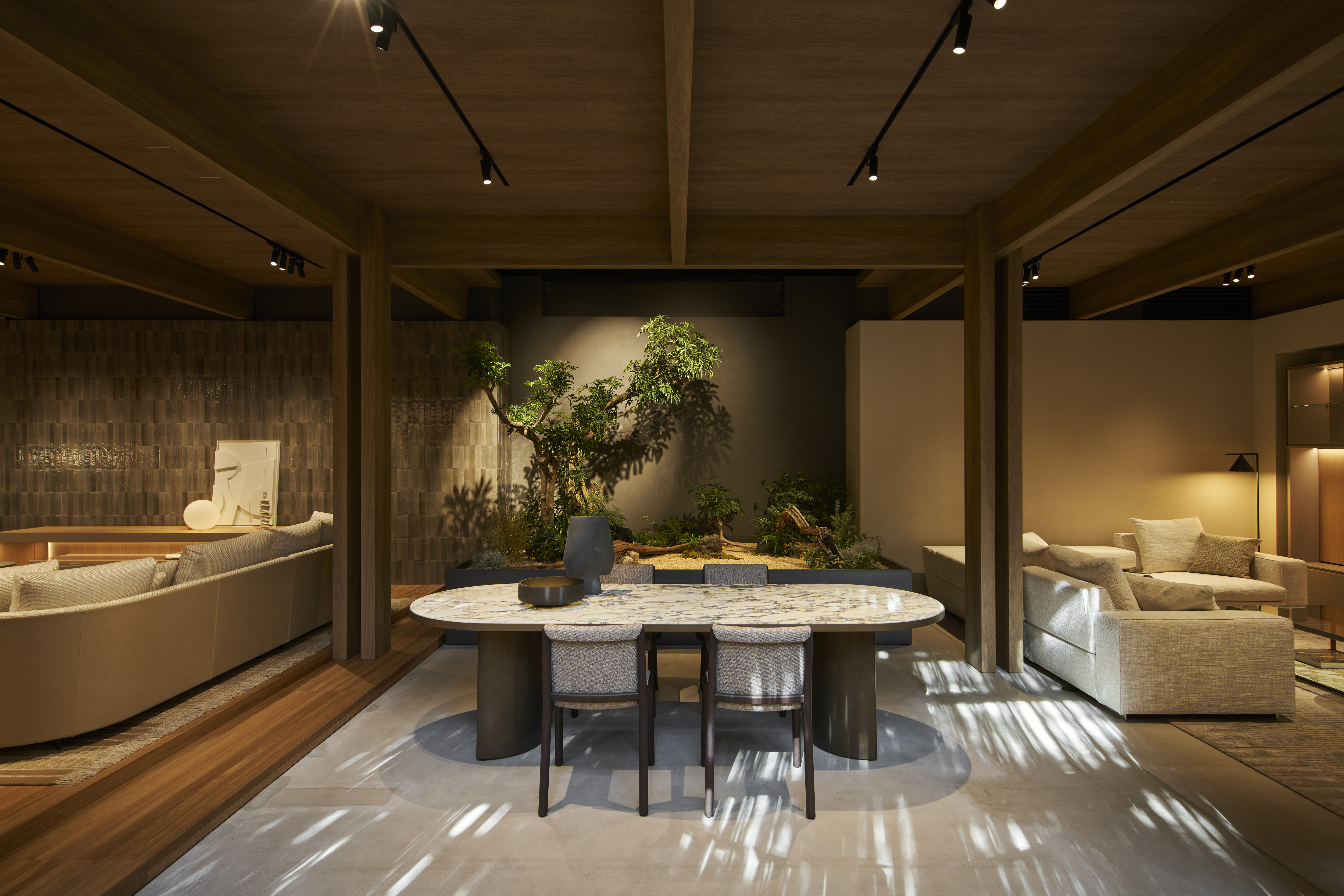 窓面のスペースには待望のアウトドアコレクションも展示され、室内外が融合する最新のモルテーニの世界観を存分にご体感いただけます。