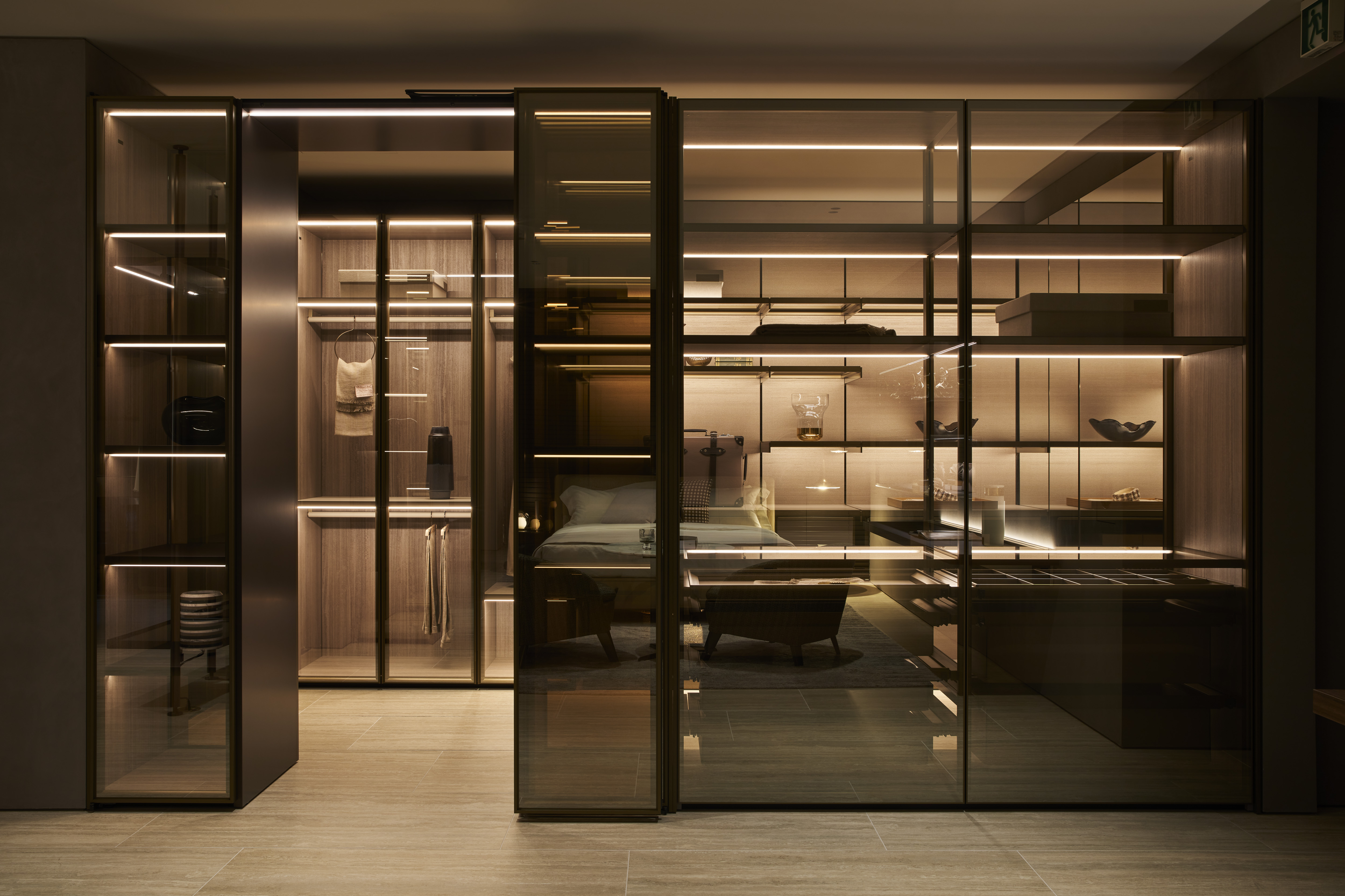 モルテーニ代表製品である「GLISS MASTER」と「MASTER DRESSING」で構成した機能的なワードローブ収納。