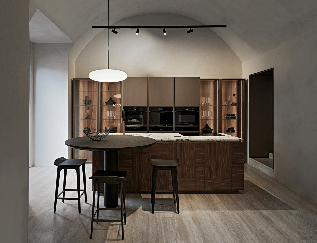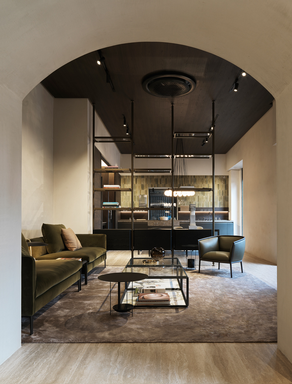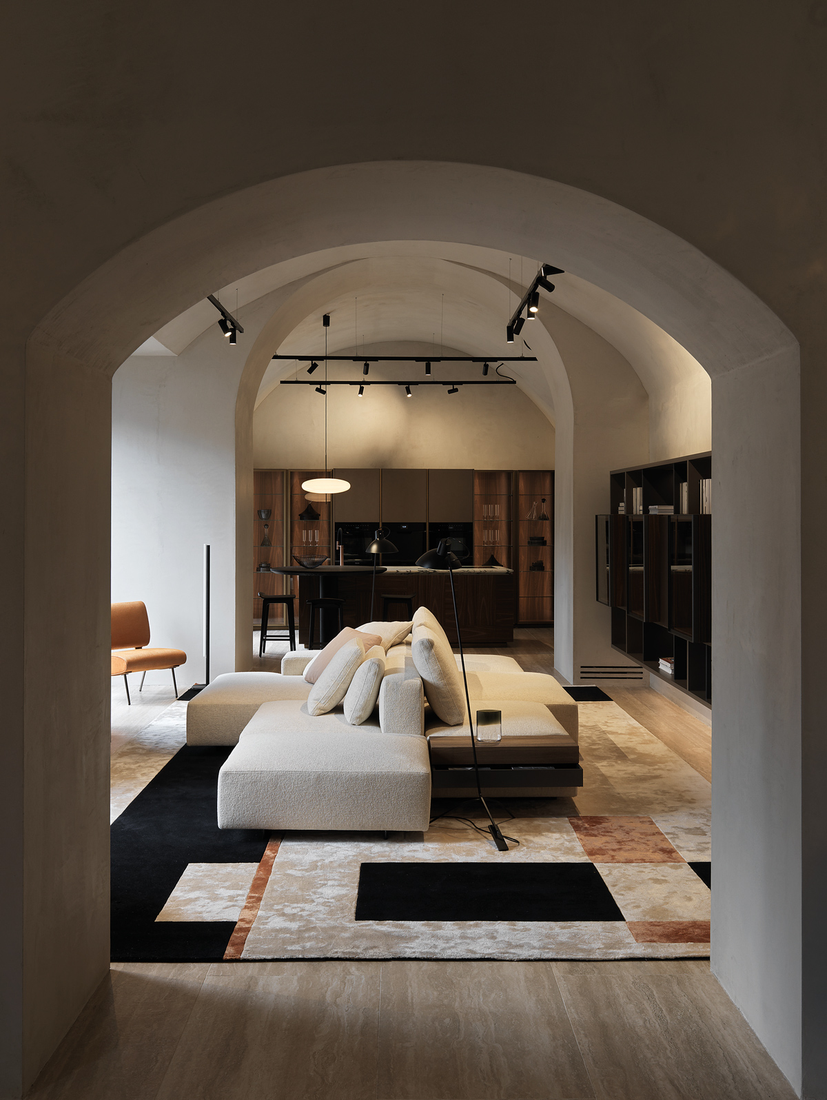 The space is warm, dimensional, fluid and always legible through distinctive details. The impressive showroom houses, frames and enhances the products in the new Molteni&C|Dada collections.